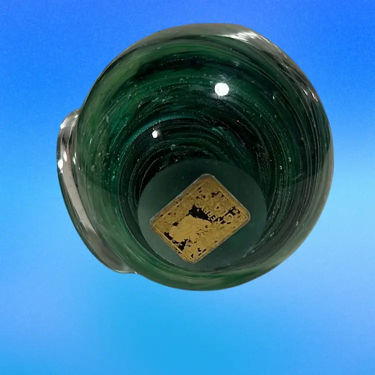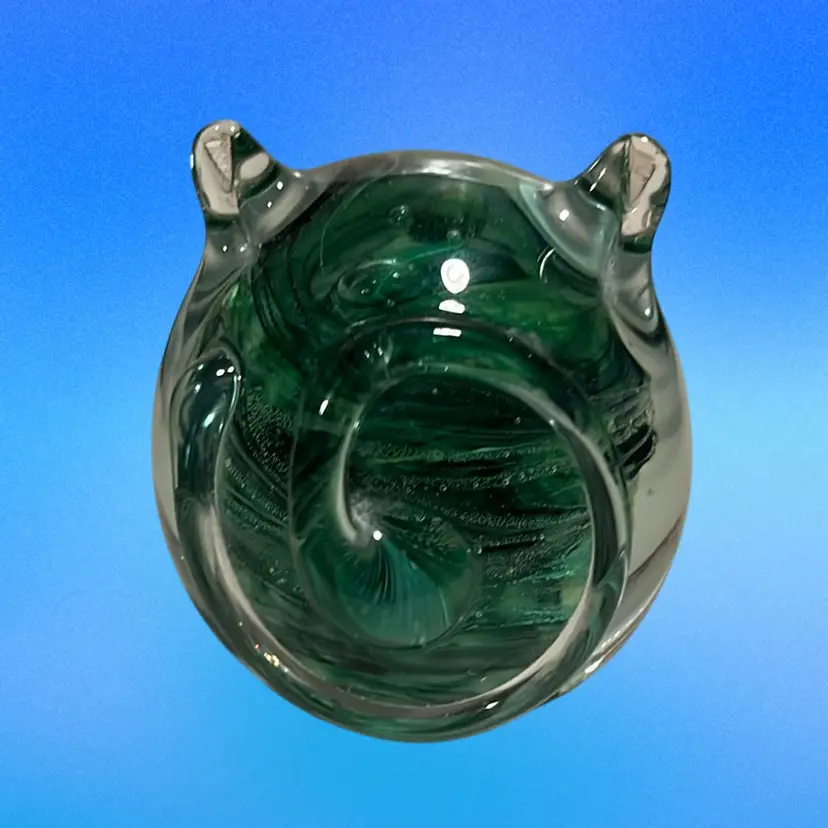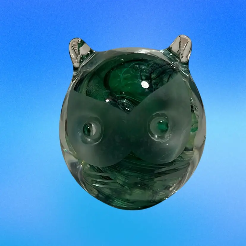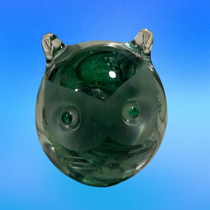 05. Kerry Glass Owl Paperweight Ireland Handmade Desk Figure Animal Bird Green Swirl 3” Tall