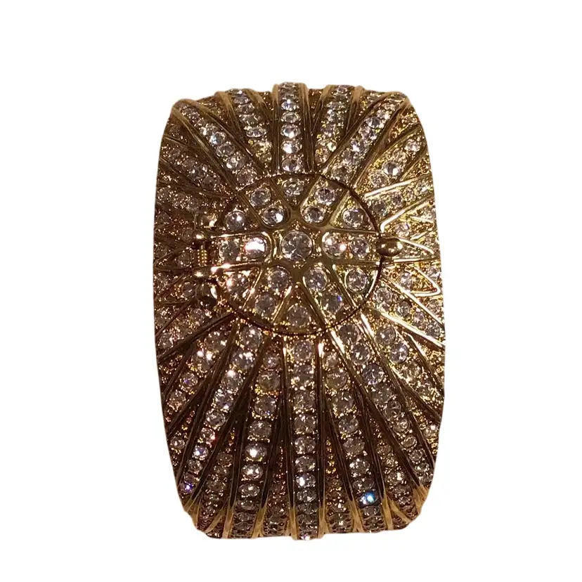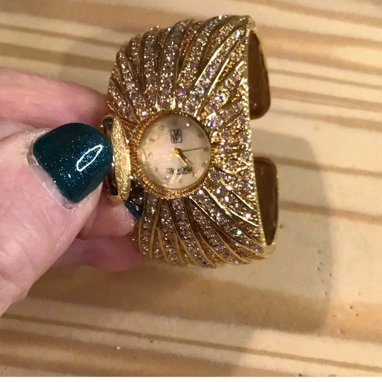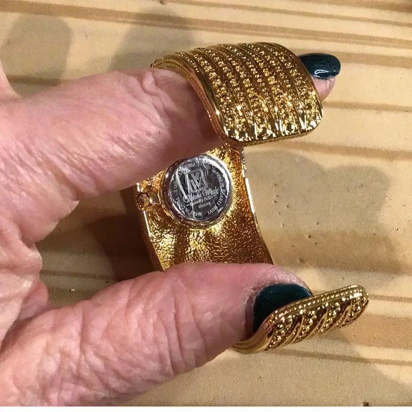 Victoria Wieck, Beverly Hills Gold tone Bangle bracelet with hidden watch face. Swarovski crystals. Back of the watch is damaged by improper removal of watch back. works well and keeps good time. everything else looks great.