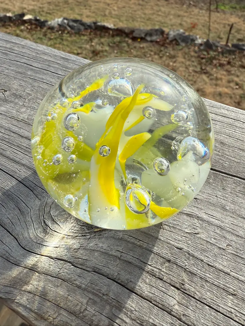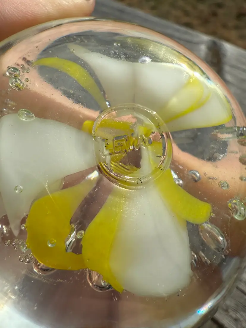 Yellow and white trumpet lily design with "bullicante" controlled bubbles. Stamped signature on base.