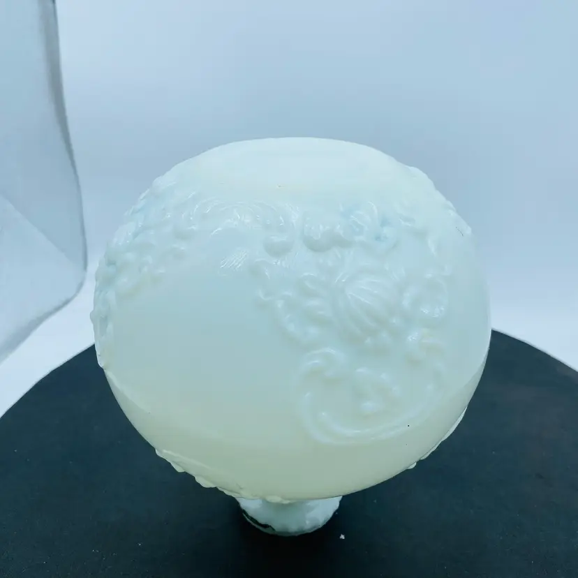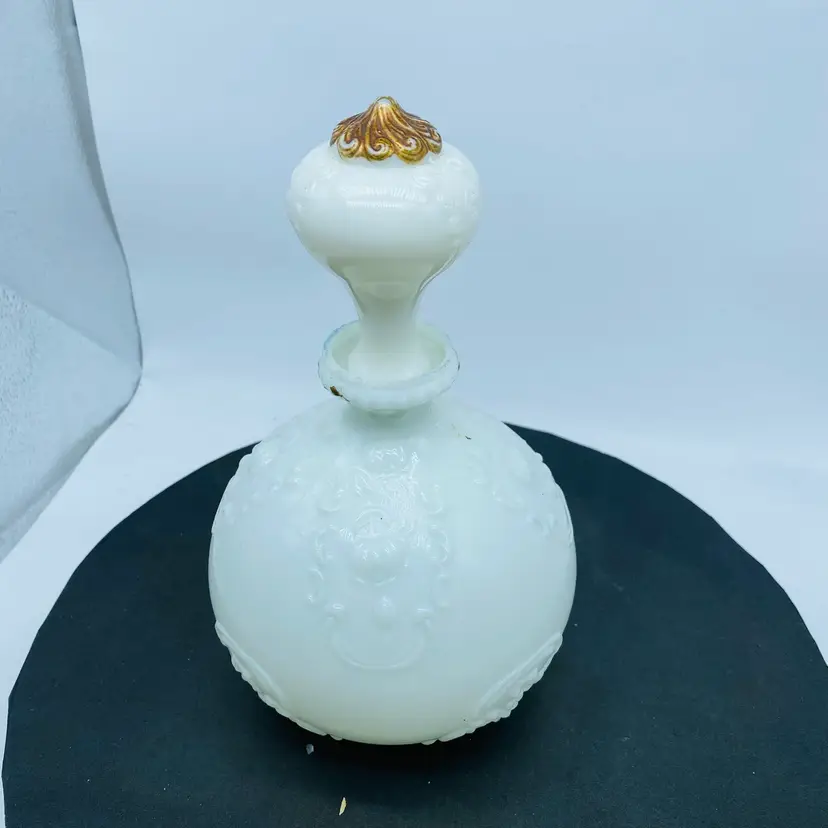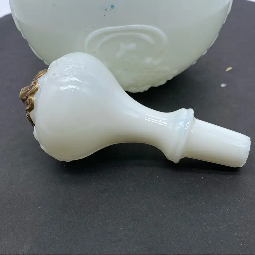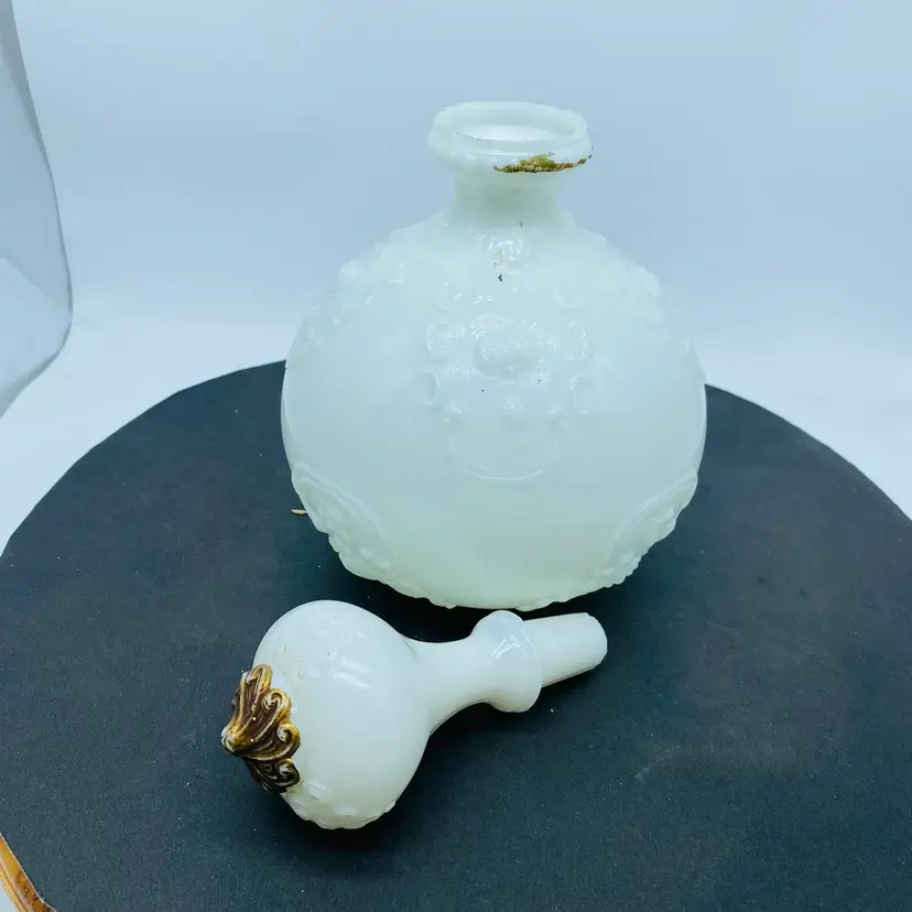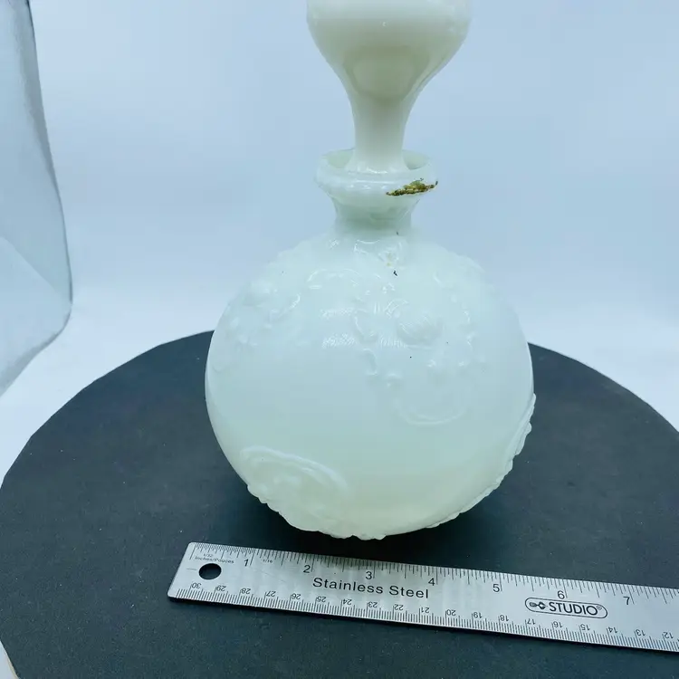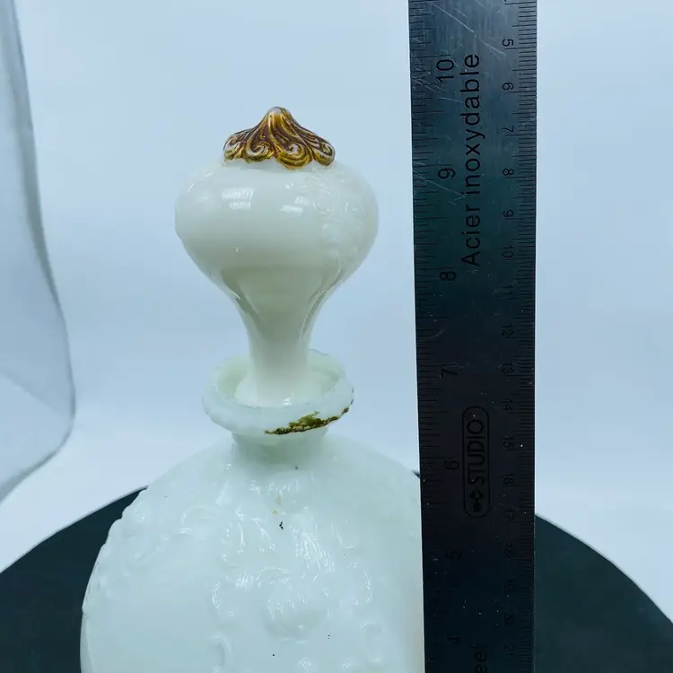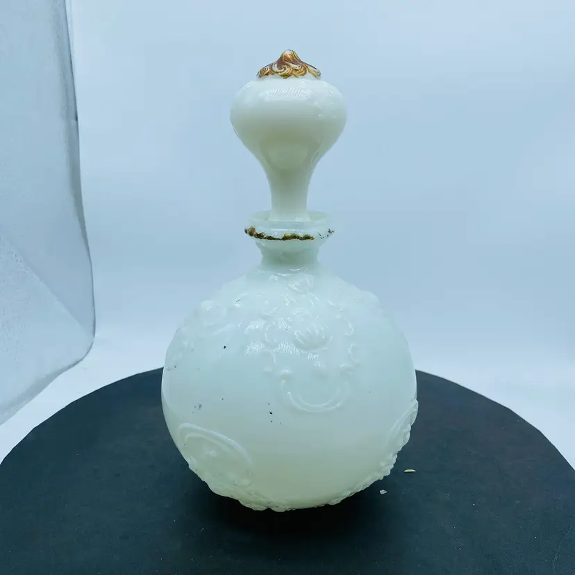 Gillander & Sons Opal Milk Glass Vanity Decanter with Stopper from the 1800s, also known as a barber bottle or dresser bottle. These bottles were used to hold perfumes, colognes, or other toiletries. Size approx. 10 inch x 6 inch Significant paint loss but in good used condition
