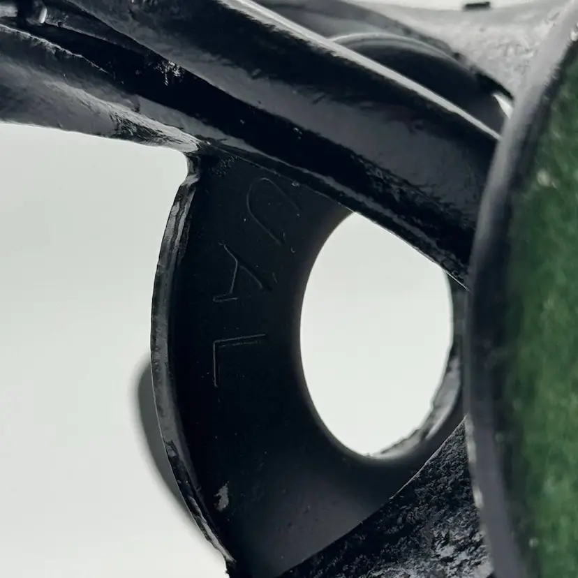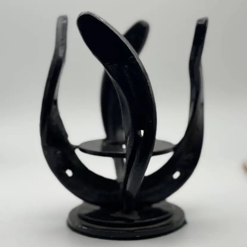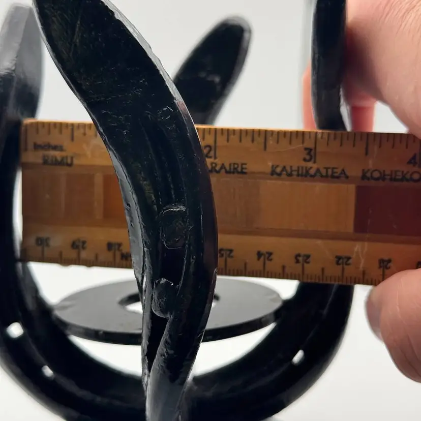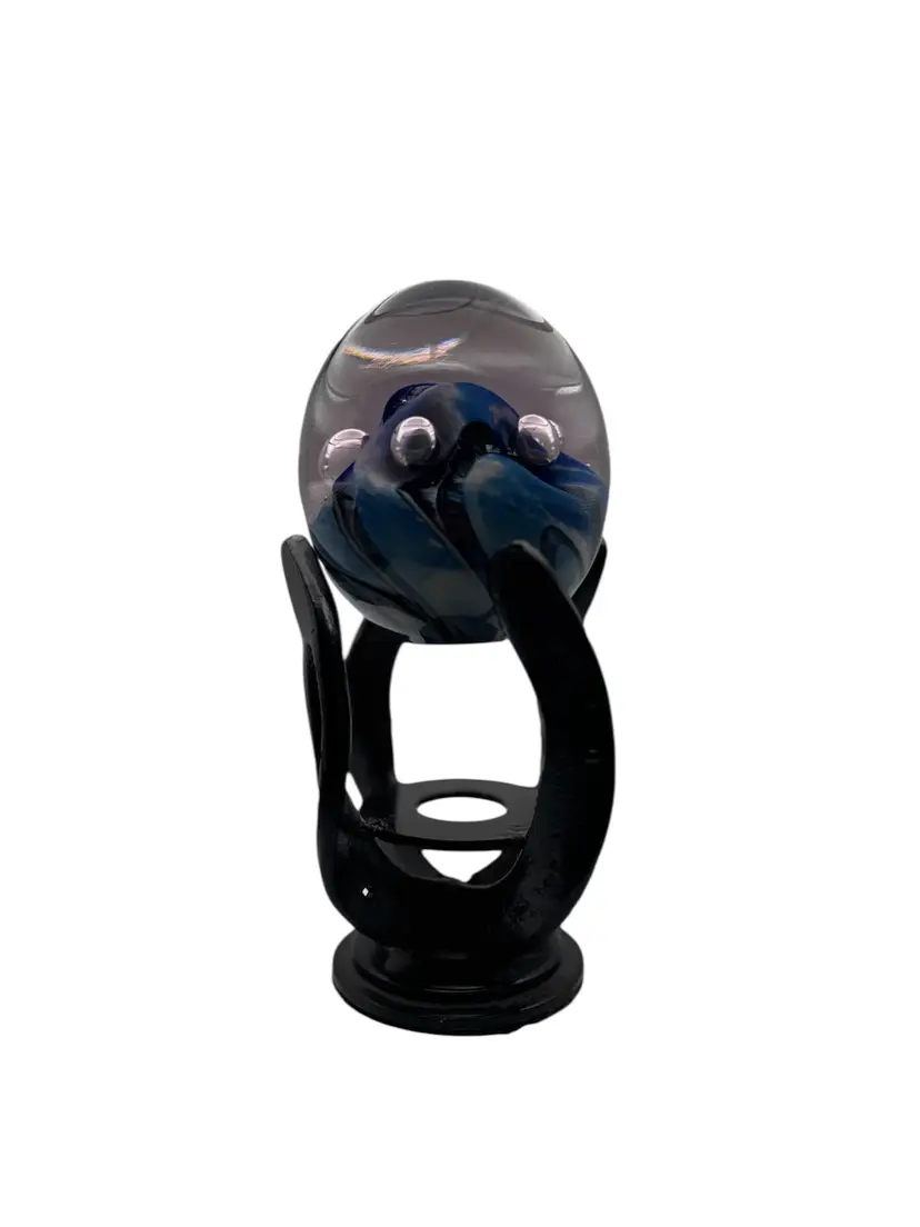 Custom made stand from horseshoes. The smallest diameter is 3" inside so it will hold 3" diameter paperweights, not recommended for >5" paperweights. The cracked Eickholt(listing #43) is pictured sitting on the stand.