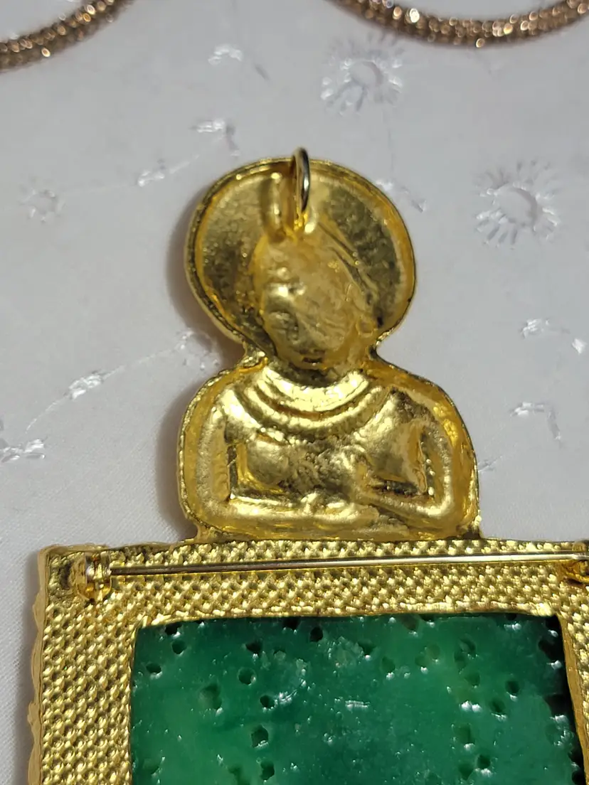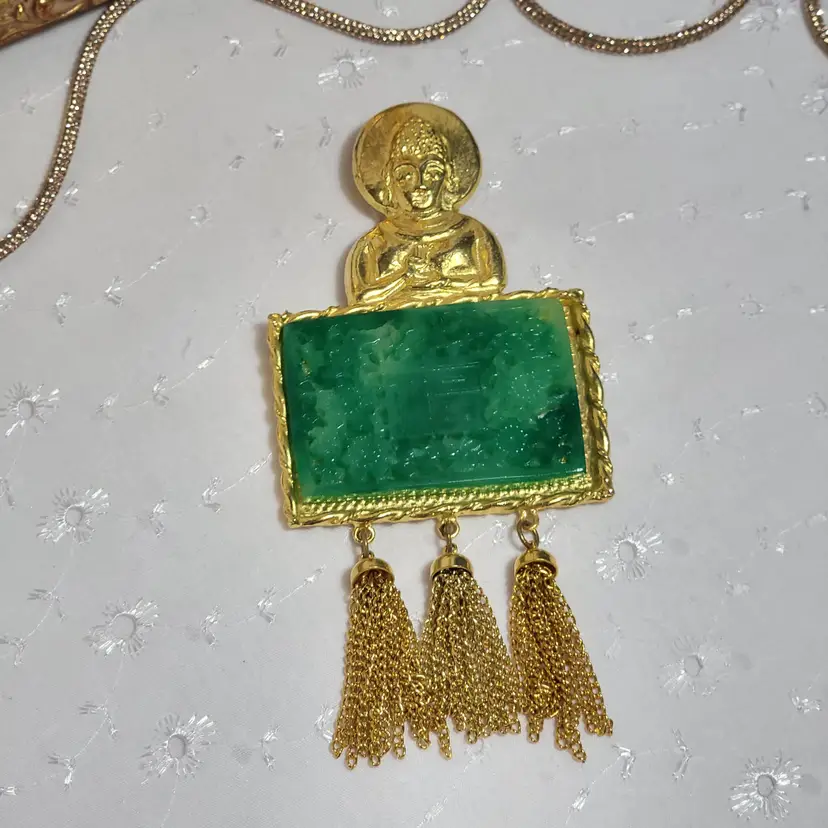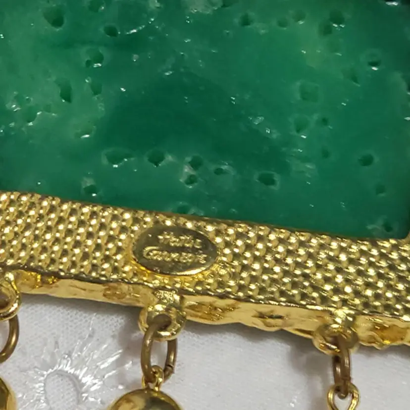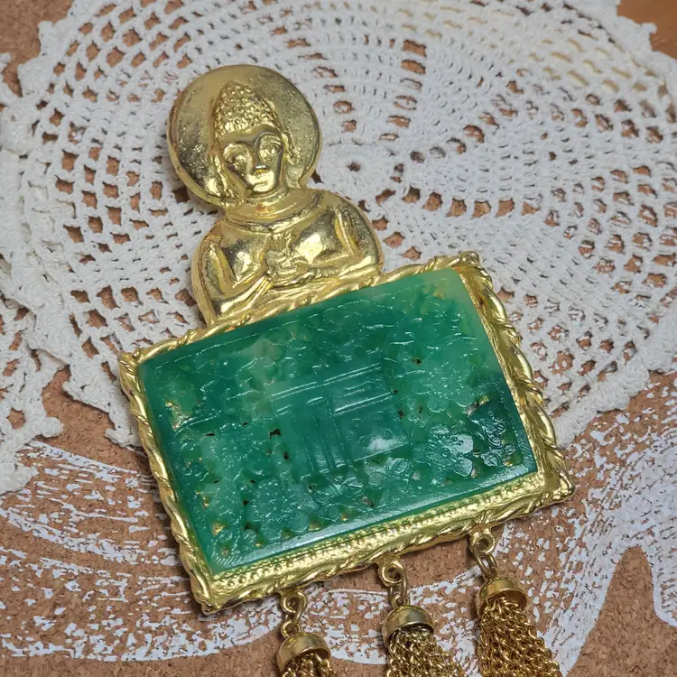 It's a carved piece of faux jade and it's 3"x 8" including the tassels.