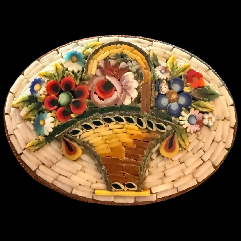 Antique Victorian Micro Mosaic Raised Tile Flower Basket Brooch 1.25โ€