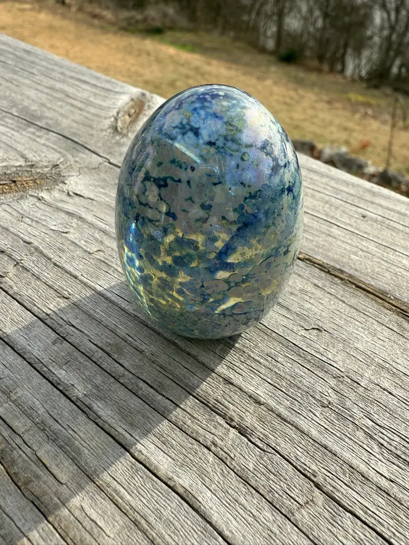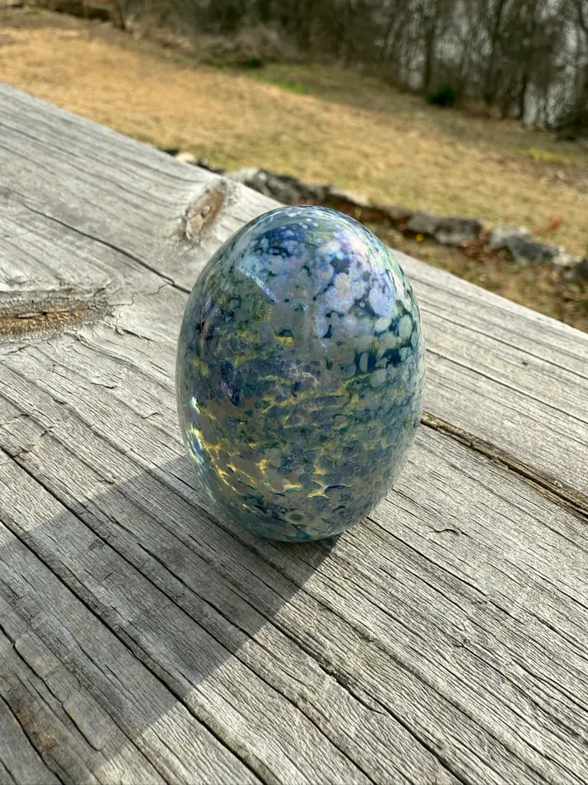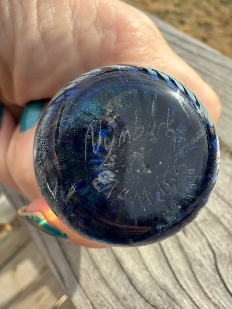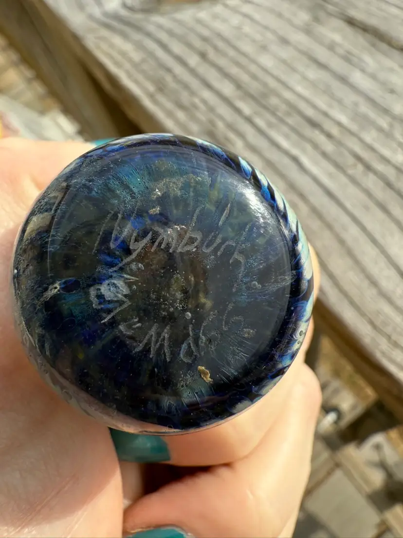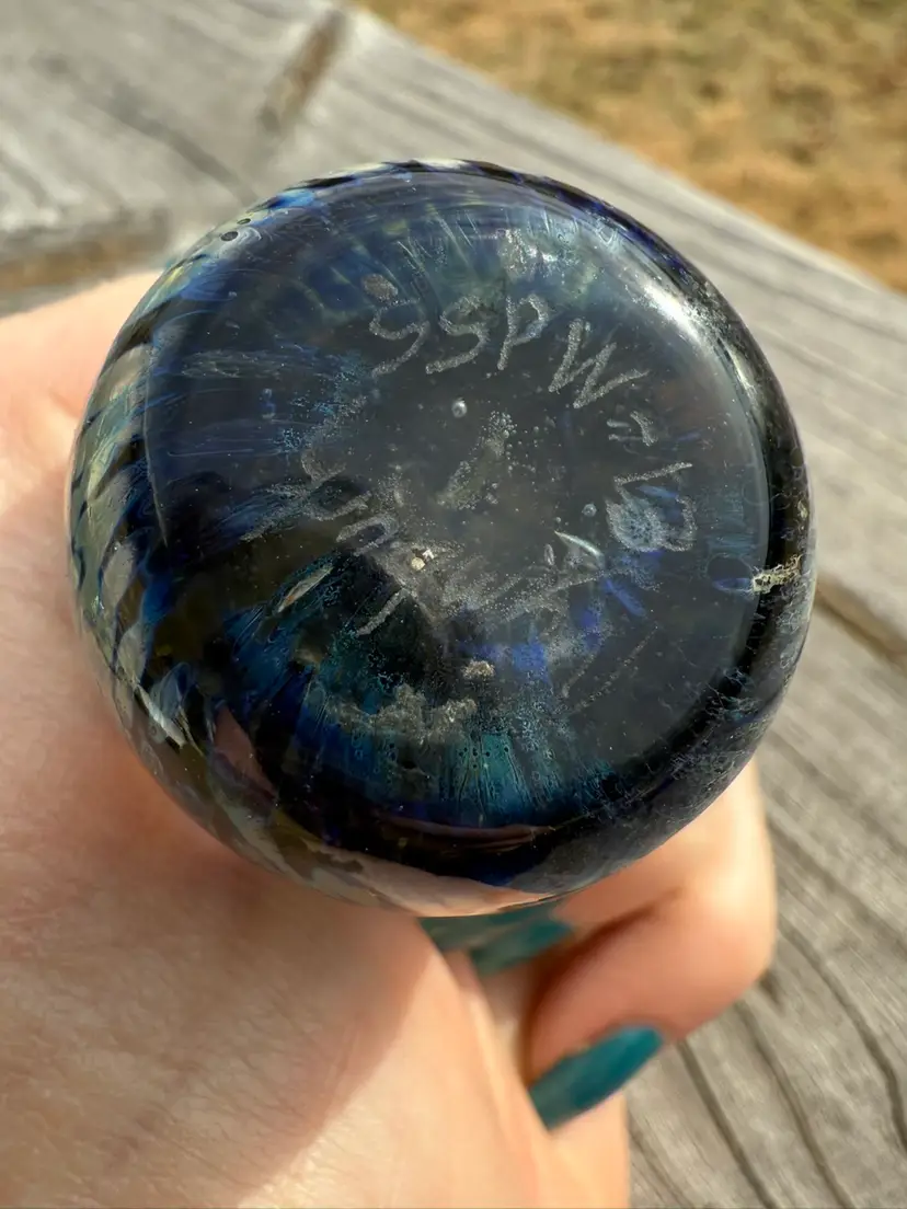 Cobalt blue base with iridescent gold/silver mottling. Signed and numbered "SSPW-13".