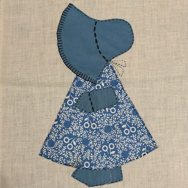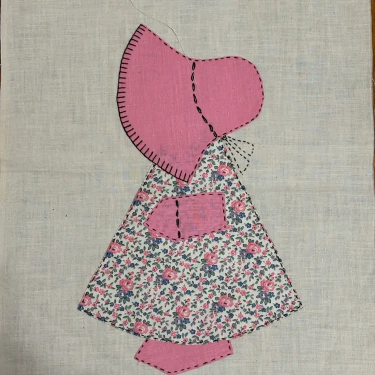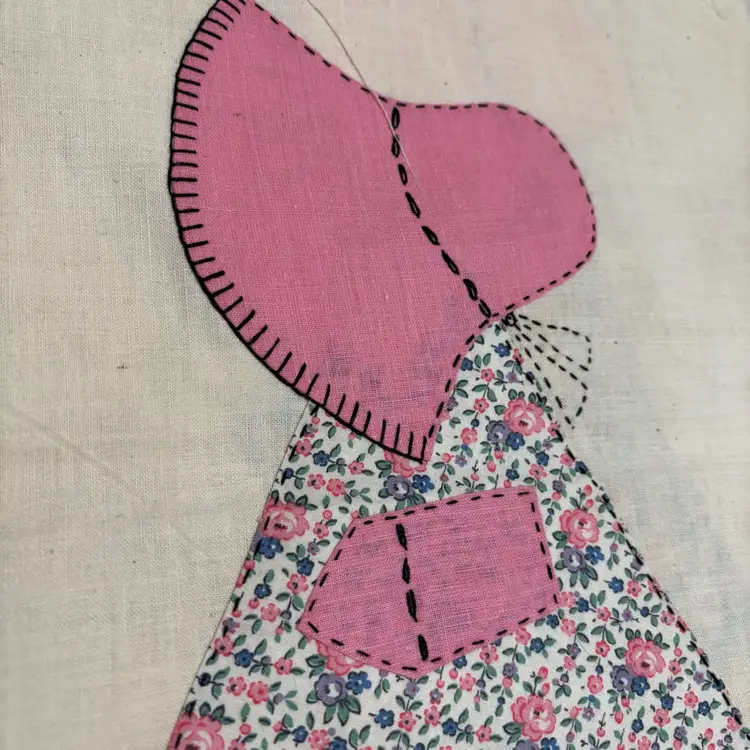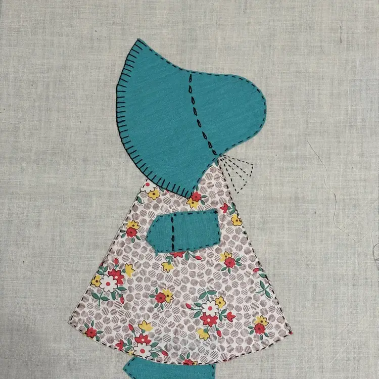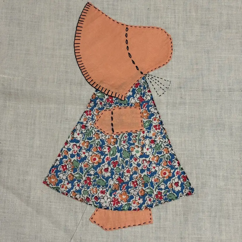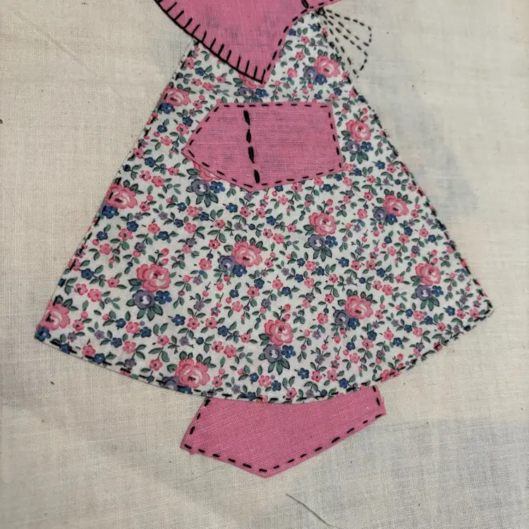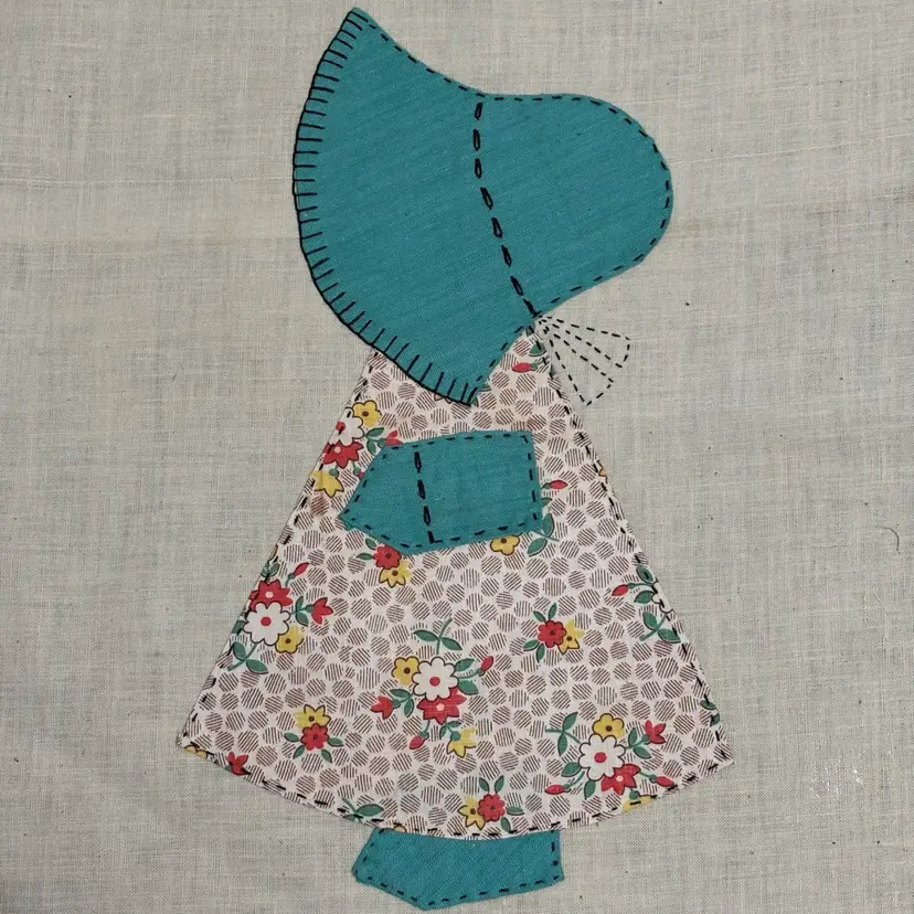 5 Vtg hand appliqué quilt blocks featuring Sunbonnet Sue. Each measures 12”x14”. Very nice condition. No issues that I can see. Green-2 Pink-1 Blue-1 Peach-1
