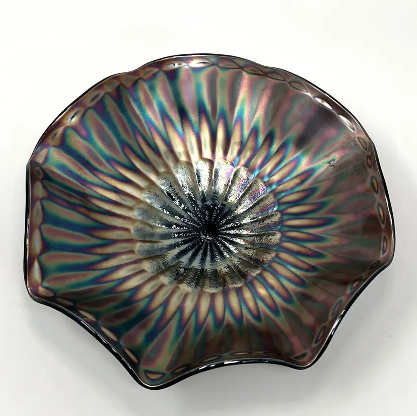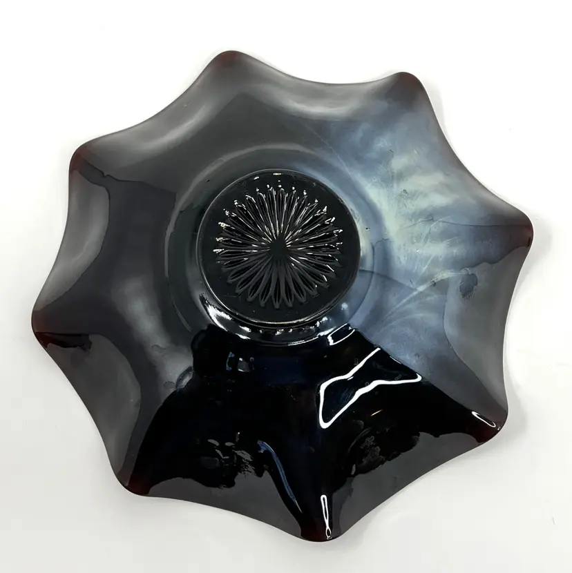 This authentic Northwood carnival glass bowl (circa 1909) features the elusive “Stippled Mum” chrysanthemum pattern, a ruffled edge, and stunning iridescent amethyst color. Signed with an underlined “N” and made only as a bowl by Northwood, it shimmers with rich purple and golden highlights—making it a standout on any display or table.