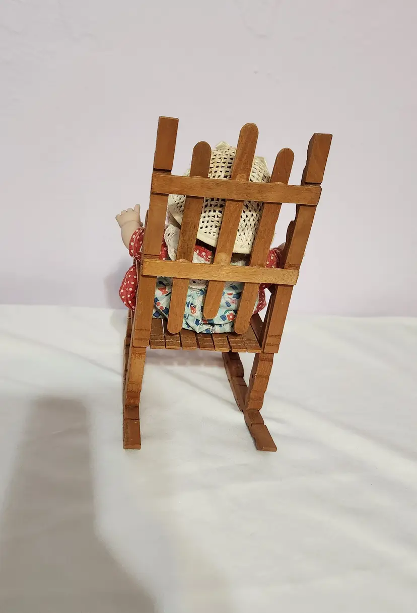 This little girl is just the cutest. She is made of rubber. Her chair is wood. The full height is 7 1/2 inches tall. I don't see anything wrong with her.