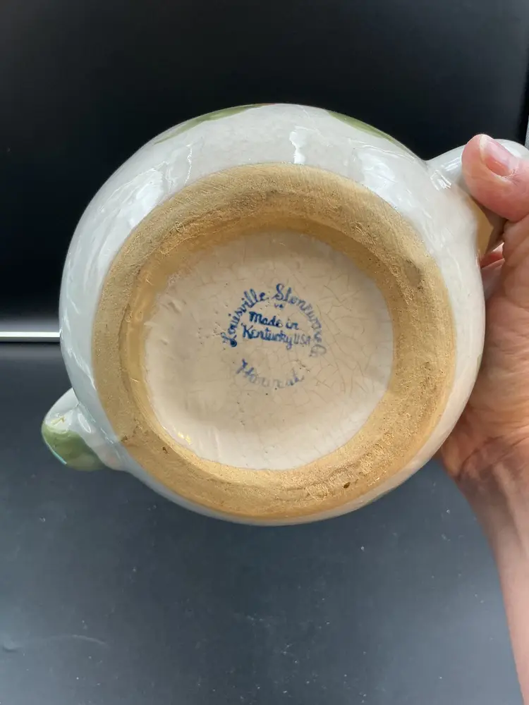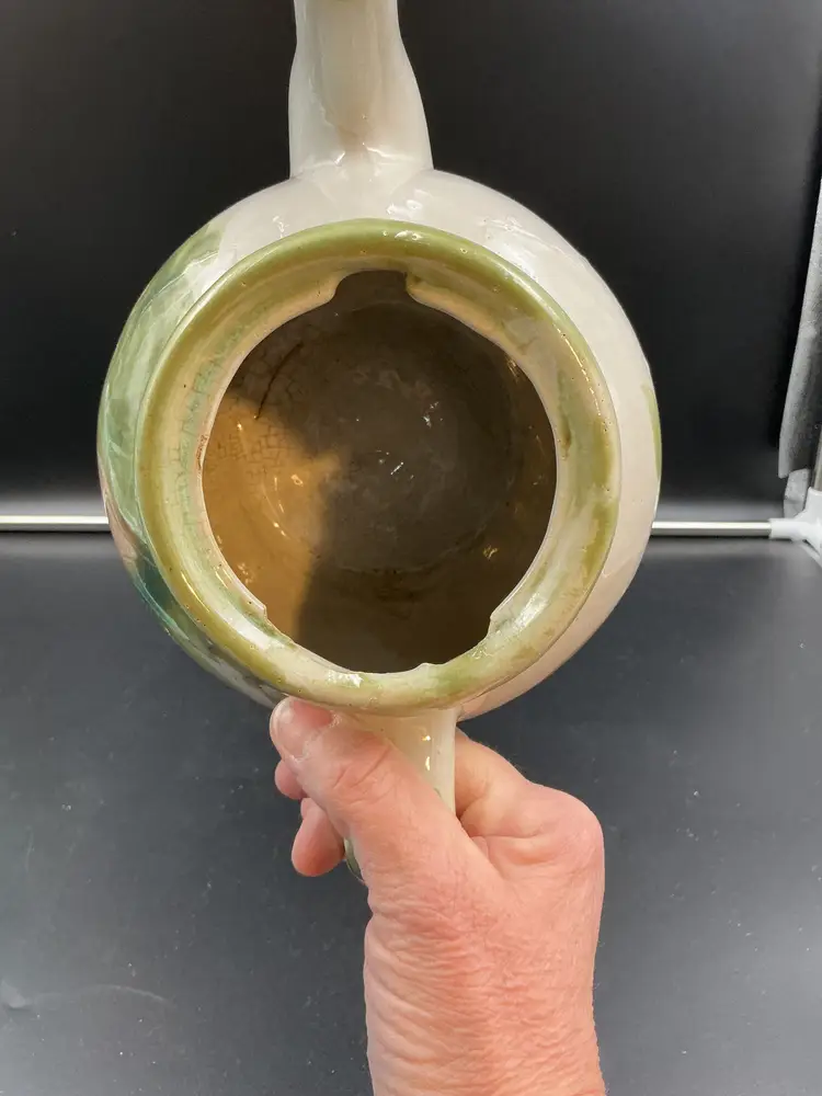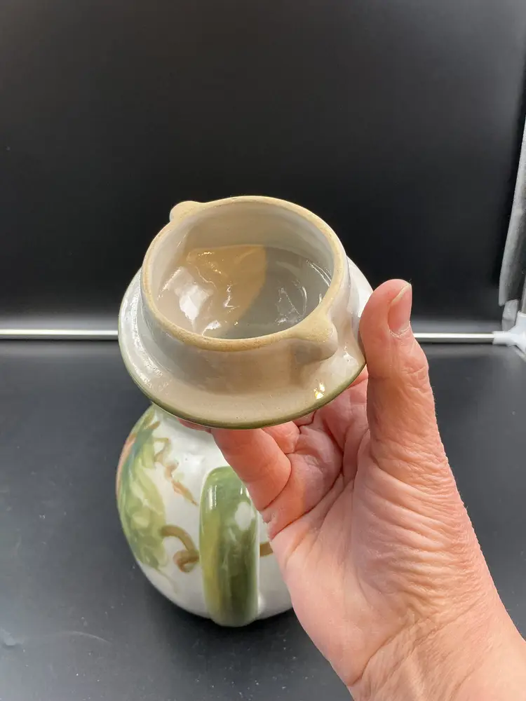 Flea bite on spout or missing glaze, not sure. Very small. Louisville Stoneware pottery formally MA Hadley.