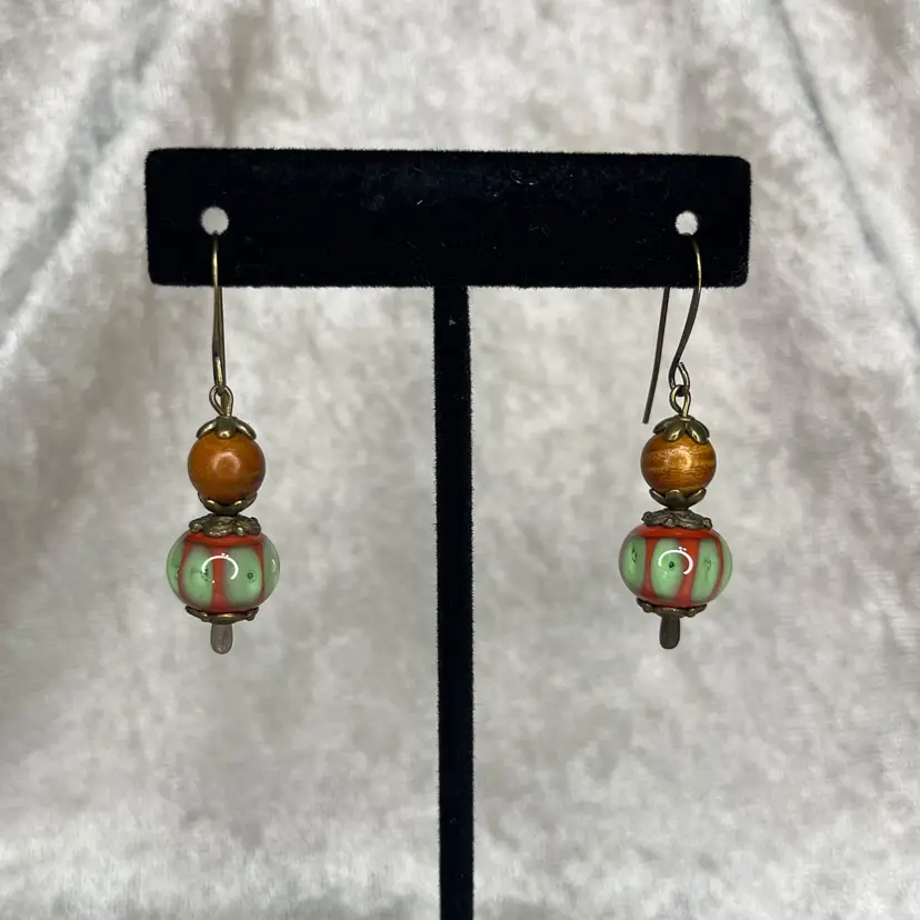 Materials: Vintage lampwork glass bead, wood bead, nickel free antiqued gold fishhooks.