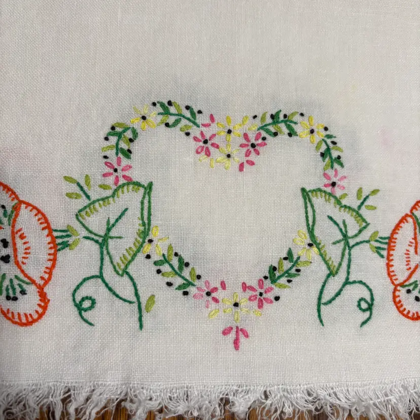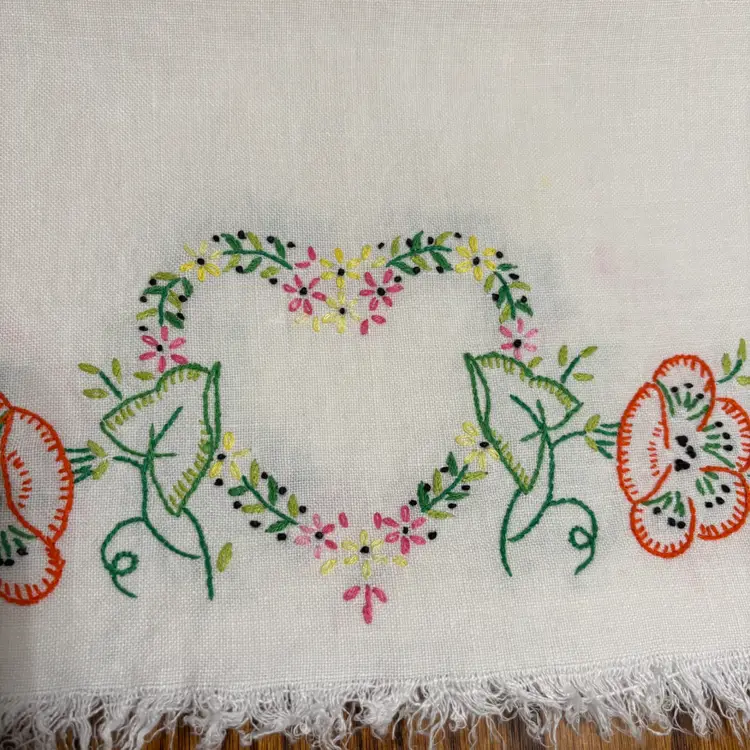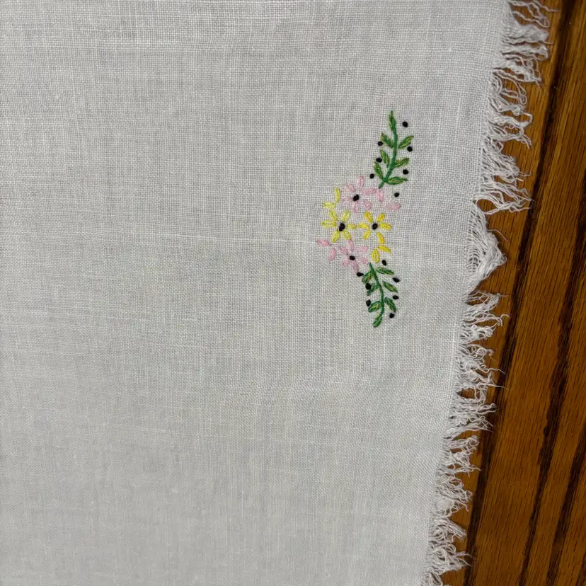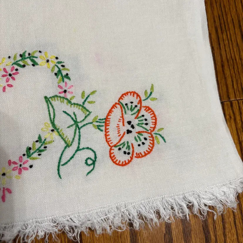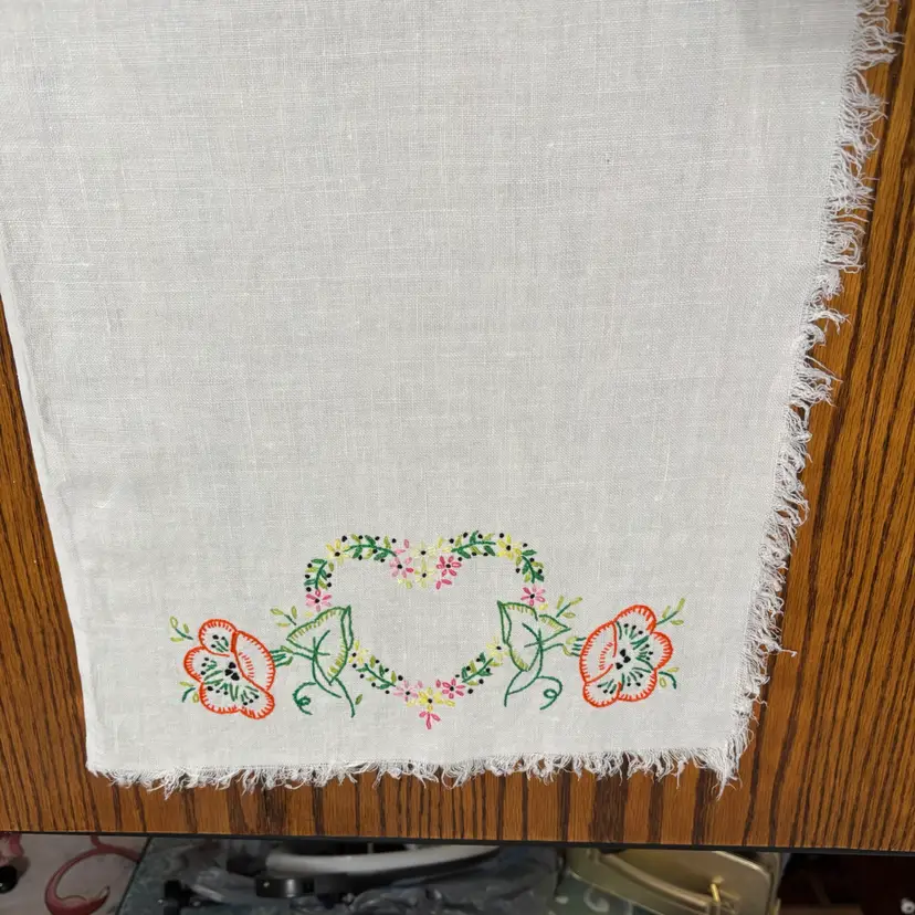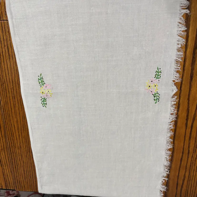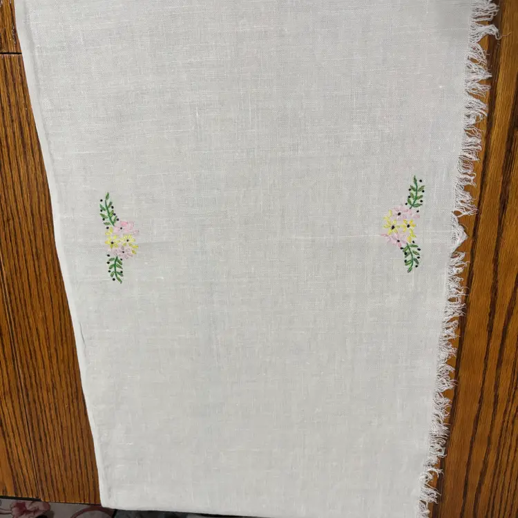 Lovely lightweight cotton linen fringed table runner. Hand embroidered and in very nice condition. No issues that I can see. Measures 13”x 36”.