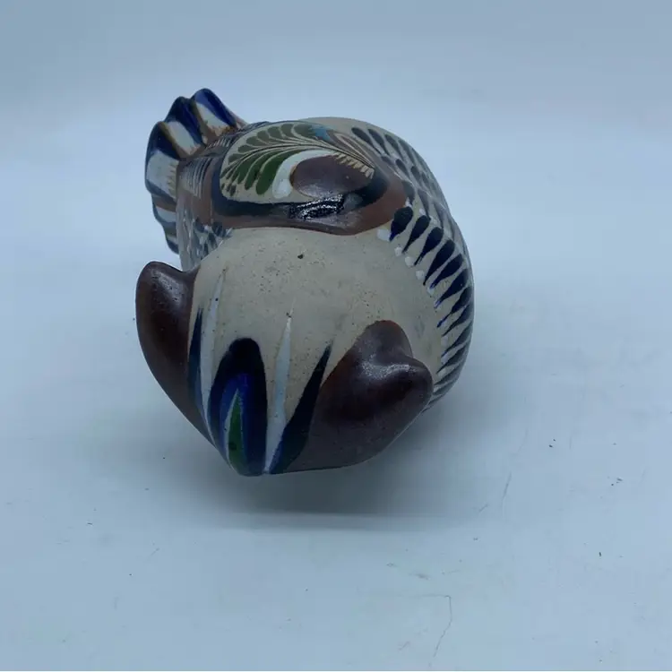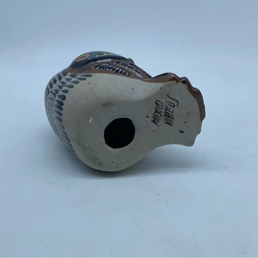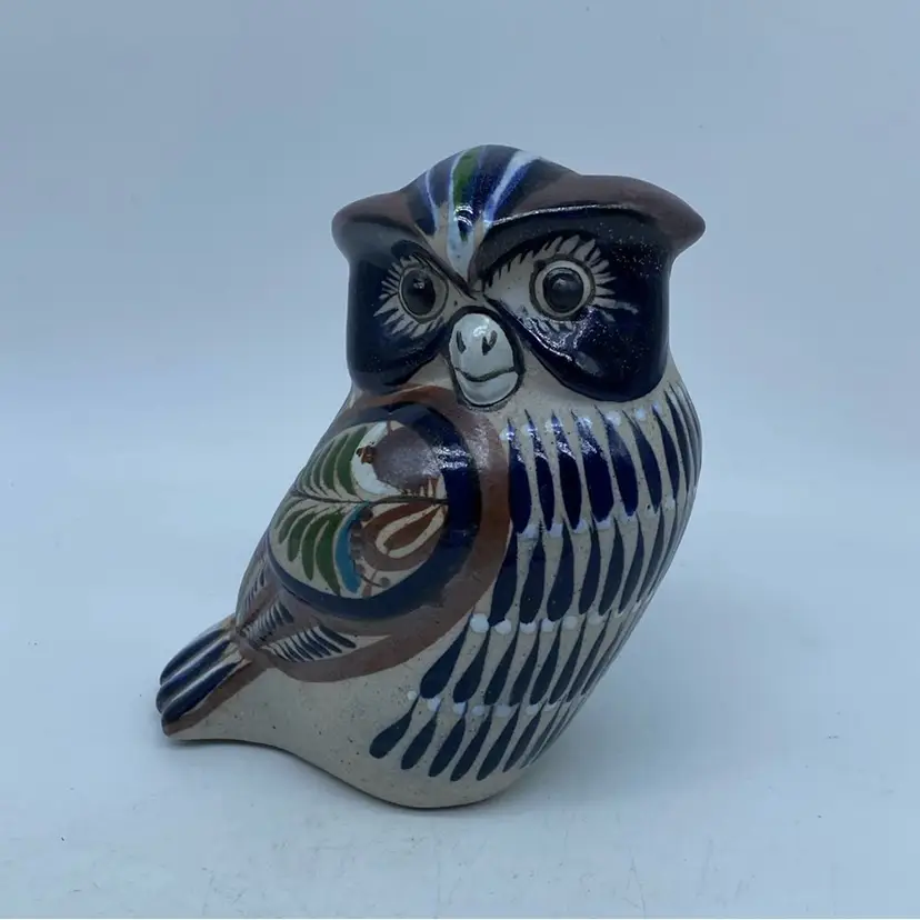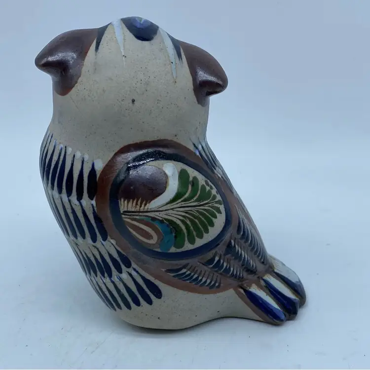 Tonala pottery has a long history, with techniques passed down through generations of artisans. The "Tostado" family, including artists like Mateos Tostado, is a well-known lineage of potters from this region, contributing significantly to its artistic legacy. Figurines like this owl are popular collectibles, appreciated for their charm and the cultural narrative they embody, especially when signed by a recognized artist.