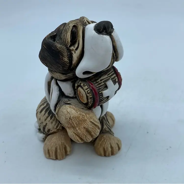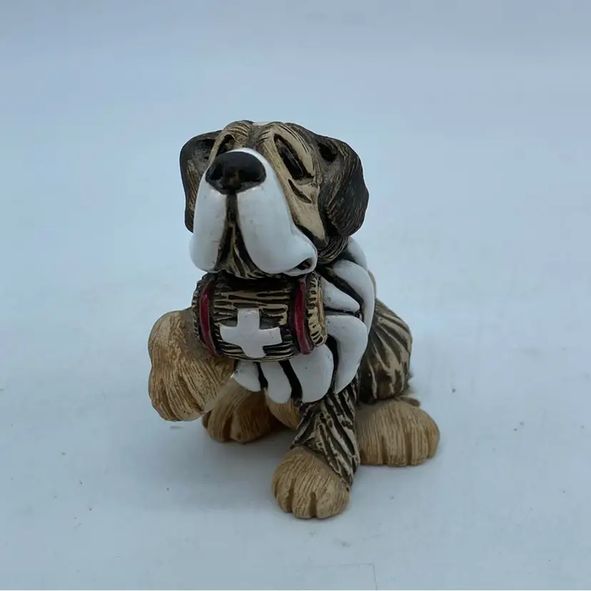 The St. Bernard breed, with its iconic barrel and association with rescue in the Swiss Alps, is a recurring motif in animal figurines. These representations often highlight the breed's gentle nature and heroic reputation, appealing to dog lovers and collectors alike. The presence of a Swiss cross on the barrel further emphasizes this well-known symbolism.