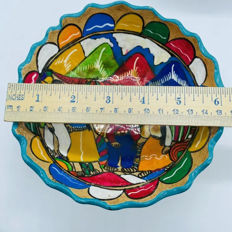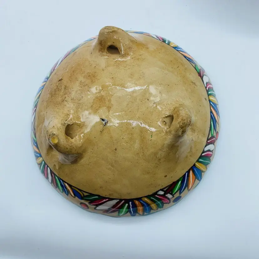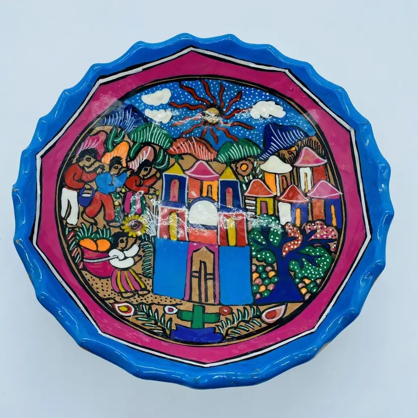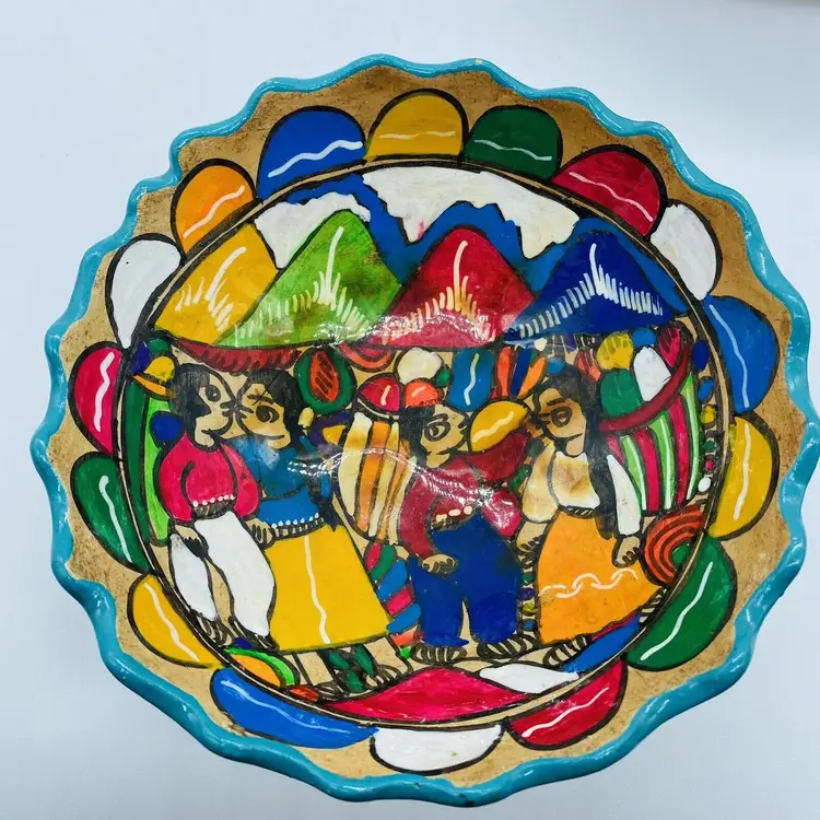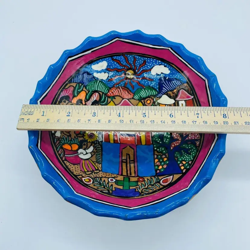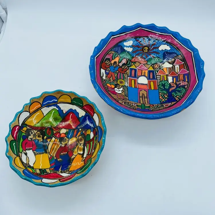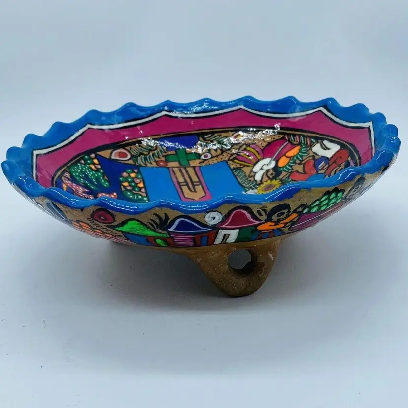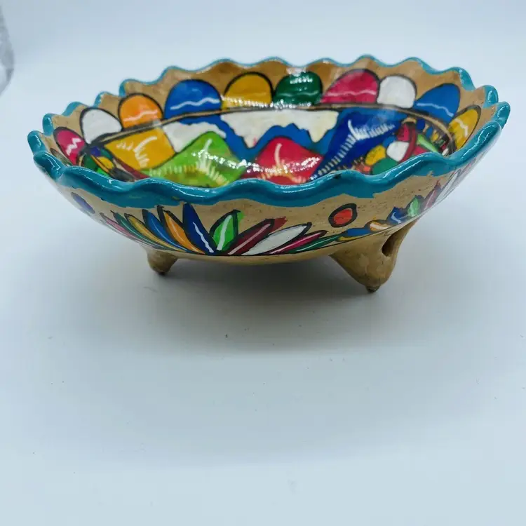 Pair Mexican hand painted 3 footed bowls Folk Art Clay Talavera Two delightful Talevera brightly handpainted bowls made circa 1980s These pottery pieces sit have footed and unpainted bases The feet have hole in case you decide to hang from wall. They are called Mexican Folk Art story telling plates The plate is made of clay and the front of the plate has been hand painted. A glaze was then applied to seal the clay and the paint. Larger approx 8 inches diameter and smaller 6 inches. Scalloped edges and painted outer borders. Have fun studying the painting and weaving your own tales!