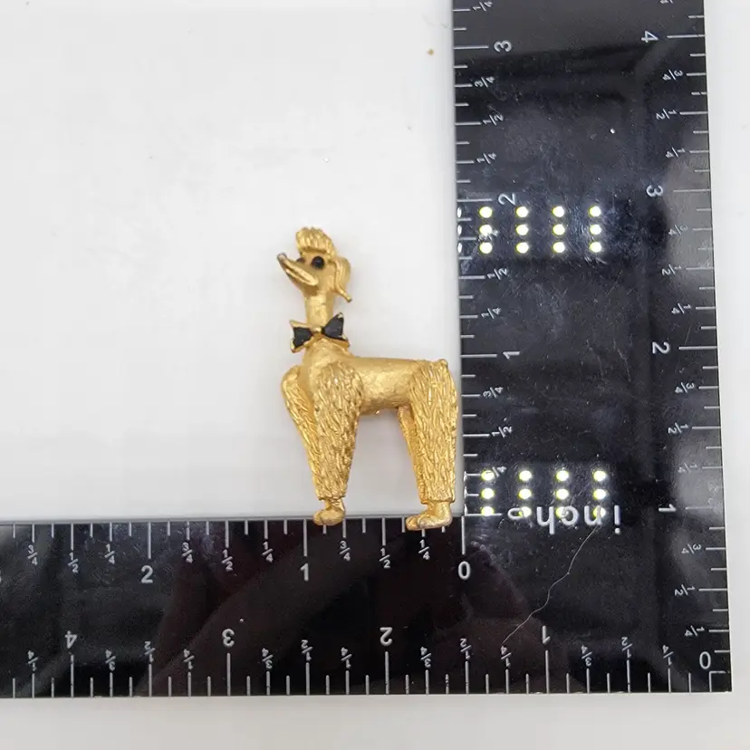 Amidst the bustling streets and dainty boutiques, this vintage poodle brooch stands as a silent raconteur. Its golden hue and black bow tie whisper tales of elegance and timeless fashion. Whether pinned to a lapel or a scarf, it transforms ordinary attire into a statement of grace and charm.