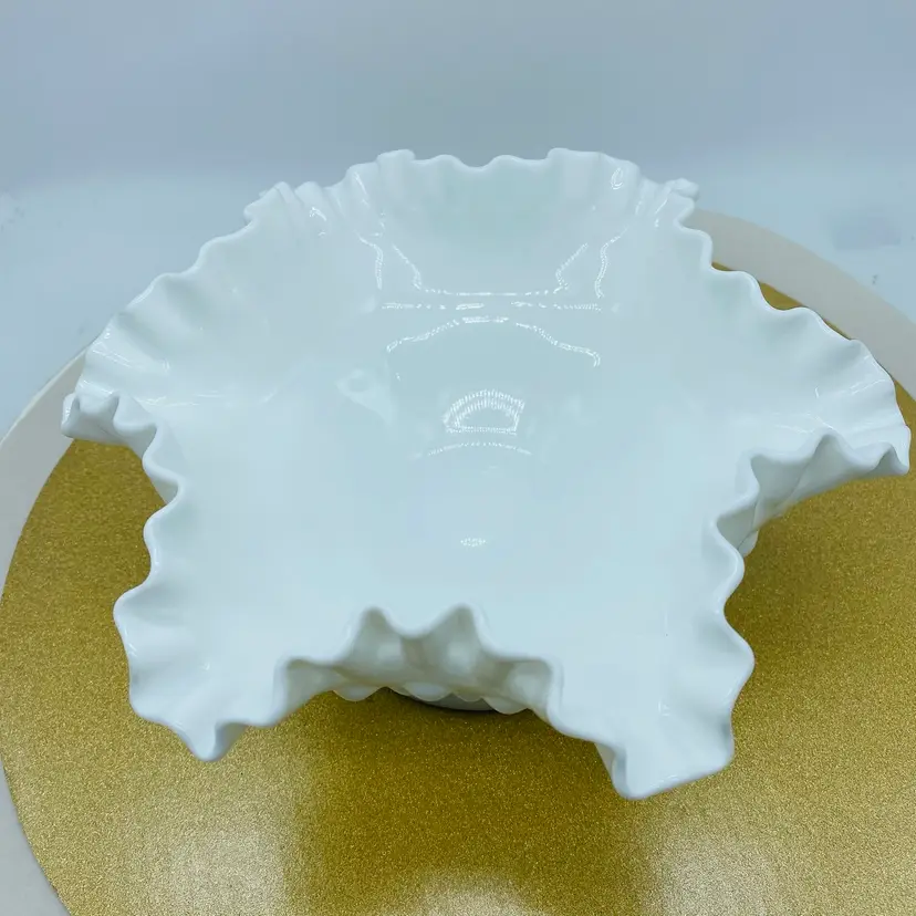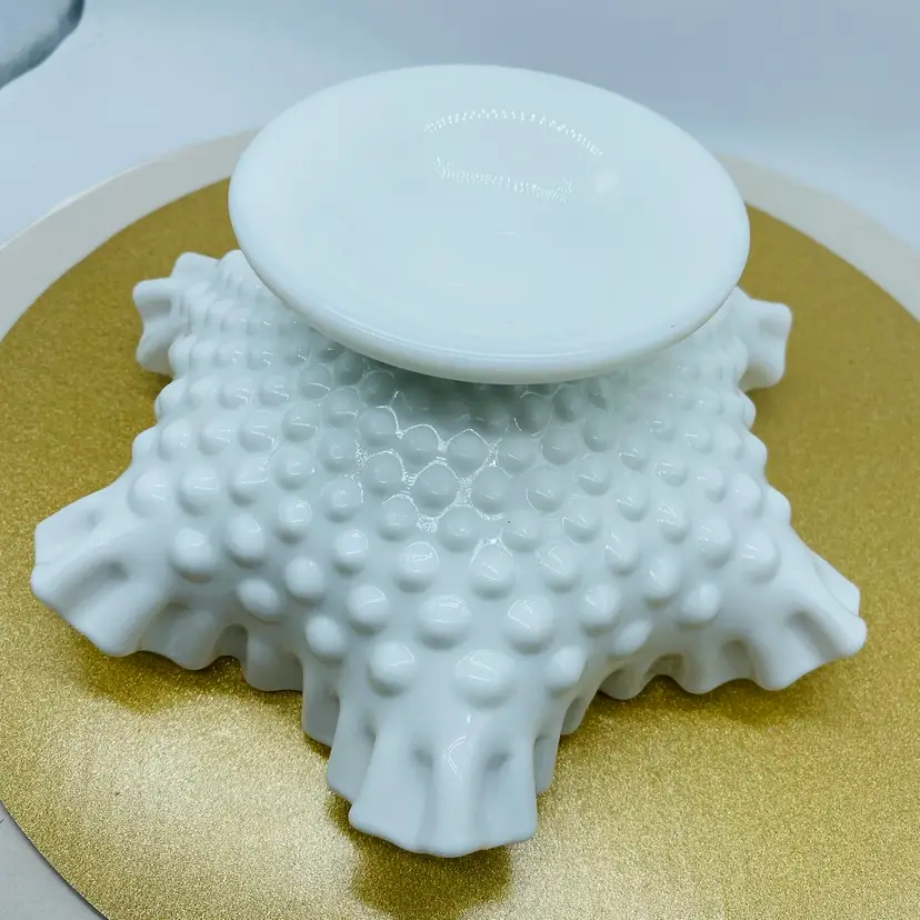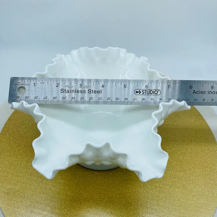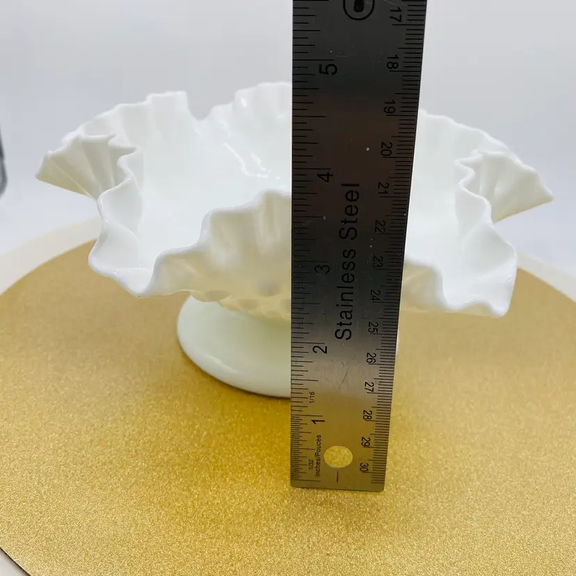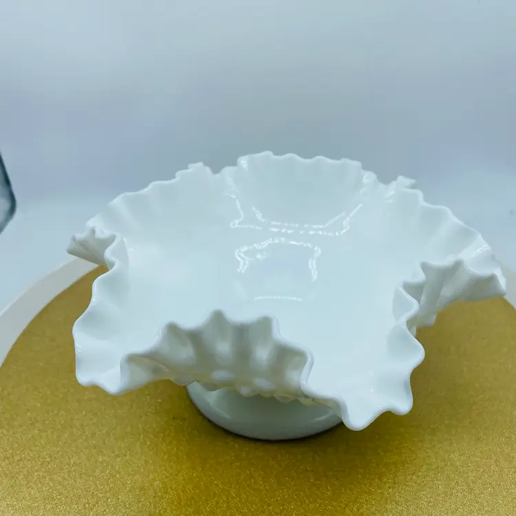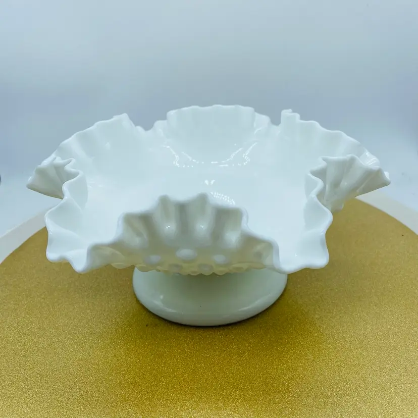 The Fenton White Milk Glass Pedestal Hobnail Compote Dish Candy Bowl is a charming addition to any home decor. This elegant piece features a classic hobnail pattern on a pedestal base, making it perfect for serving candies, nuts, or even as a decorative accent. Crafted from high-quality glass, this bowl exudes a timeless charm and sophistication. With its white milk glass hue, this Fenton compote dish adds a touch of vintage elegance to any table setting. Whether displayed on its own or filled with delightful treats, this bowl is sure to impress guests and elevate any occasion. Perfect for collectors or those looking to add a touch of retro flair to their home, this piece is a must-have for any glassware enthusiast.