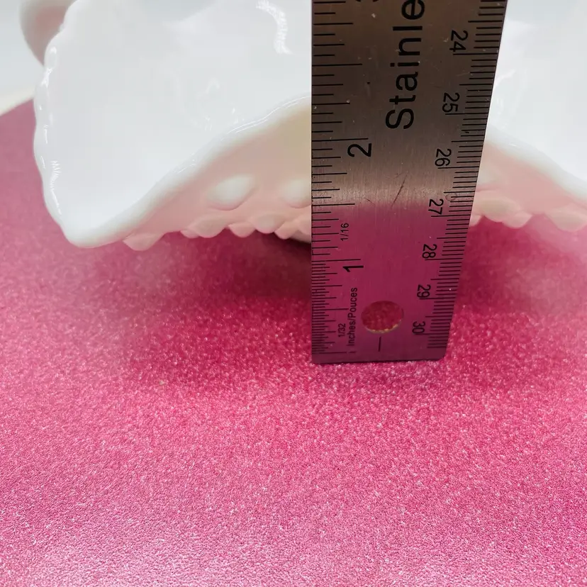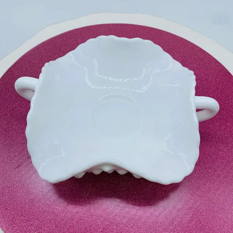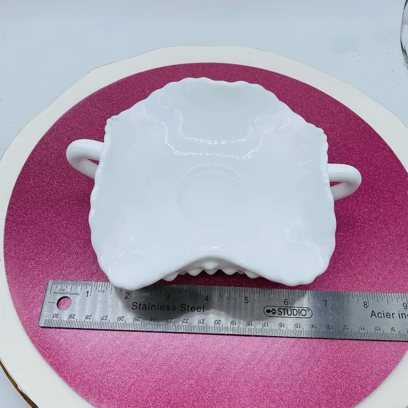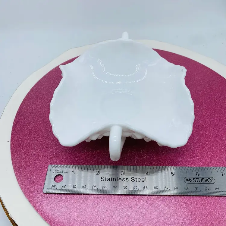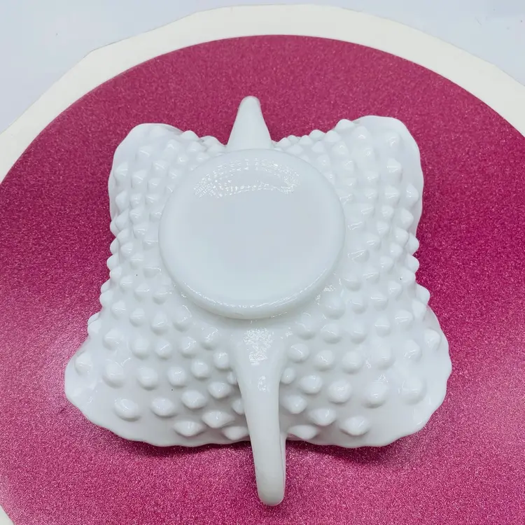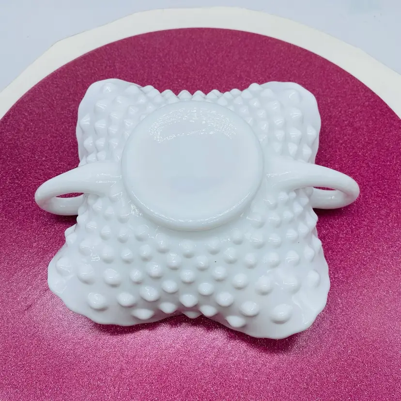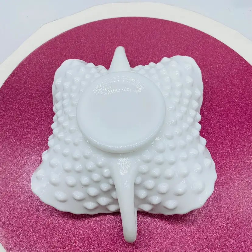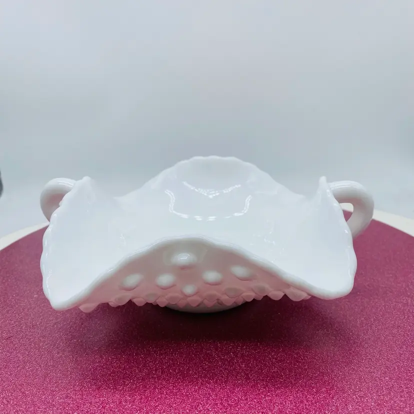 Vintage Milk Glass Fenton Hobnail Double Handle Candy Dish in White is a charming addition to any collection. Made in the United States during the 1970s, this authentic Fenton piece features a classic milk glass production style with intricate hobnail detailing. The candy dish is elegantly designed with two handles, adding a touch of sophistication to its abstract shape. Perfect for serving candies or as a decorative accent in any home, this timeless piece showcases the quality craftsmanship and vintage appeal that Fenton is known for.