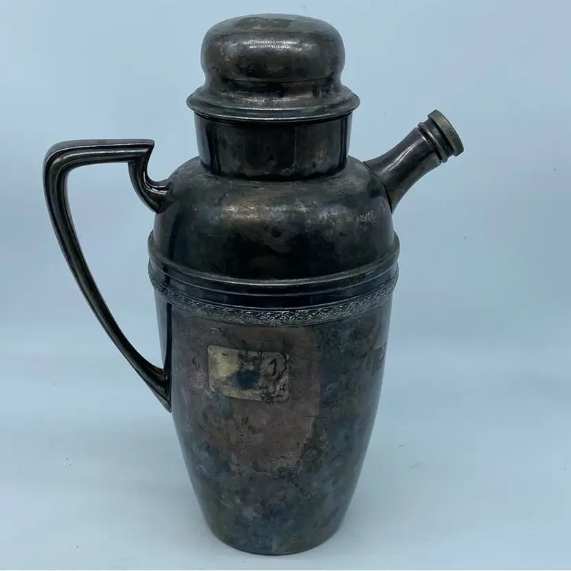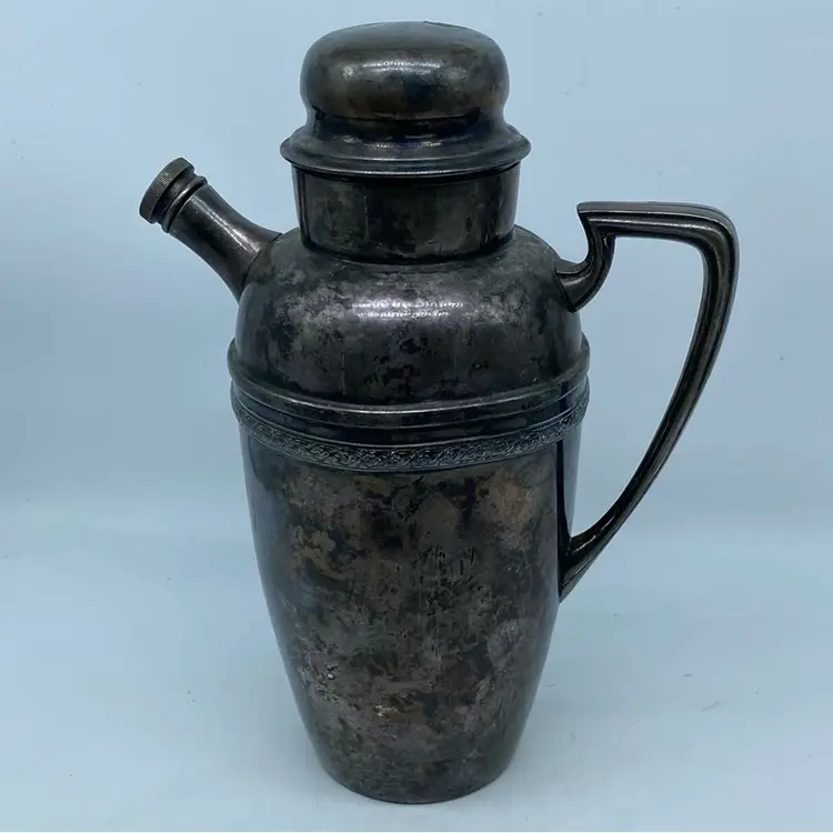 1940's Hiram Walker Plate Silver electroplated over copper classic cocktail shaker. This is a great old item in terrific condition. The shaker stands 10" tall with the cap in place, 7" across spout to handle. The cap fits tightly to allow mixing of contents without spilling. The spout has a screw-on cork-lined cap for the same reason, it also keeps things chilled for a good while as it is quite heavy 0.8kg/1lb 14 oz).