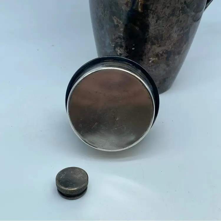 The cork inside cap is in excellent condition. There is a built-in strainer to keep ice inside when pouring. The bottom is marked Hiram Walker Ltd Walkerville Canada. Great lines work with traditional, art deco, modern decor. EP Copper means electroplated silver over copper, and I believe that the BM Mounts means that the mounted pieces (the foot around base and the handles) are made of britannia metal.