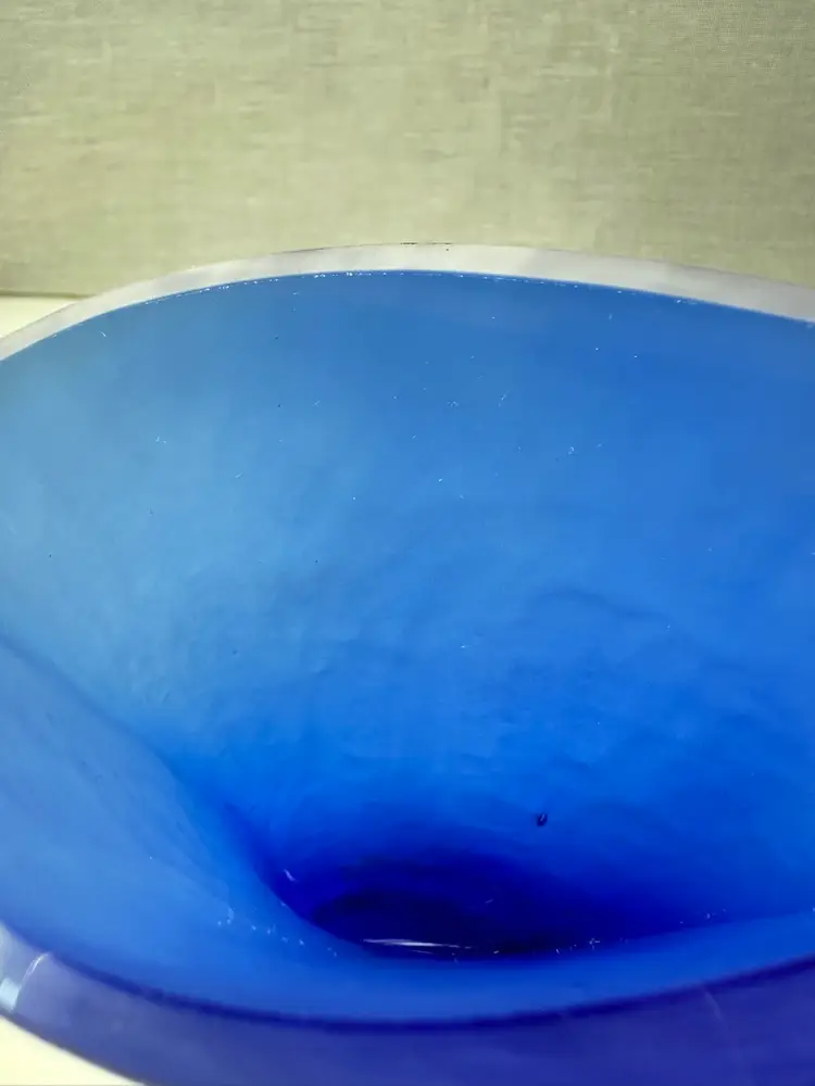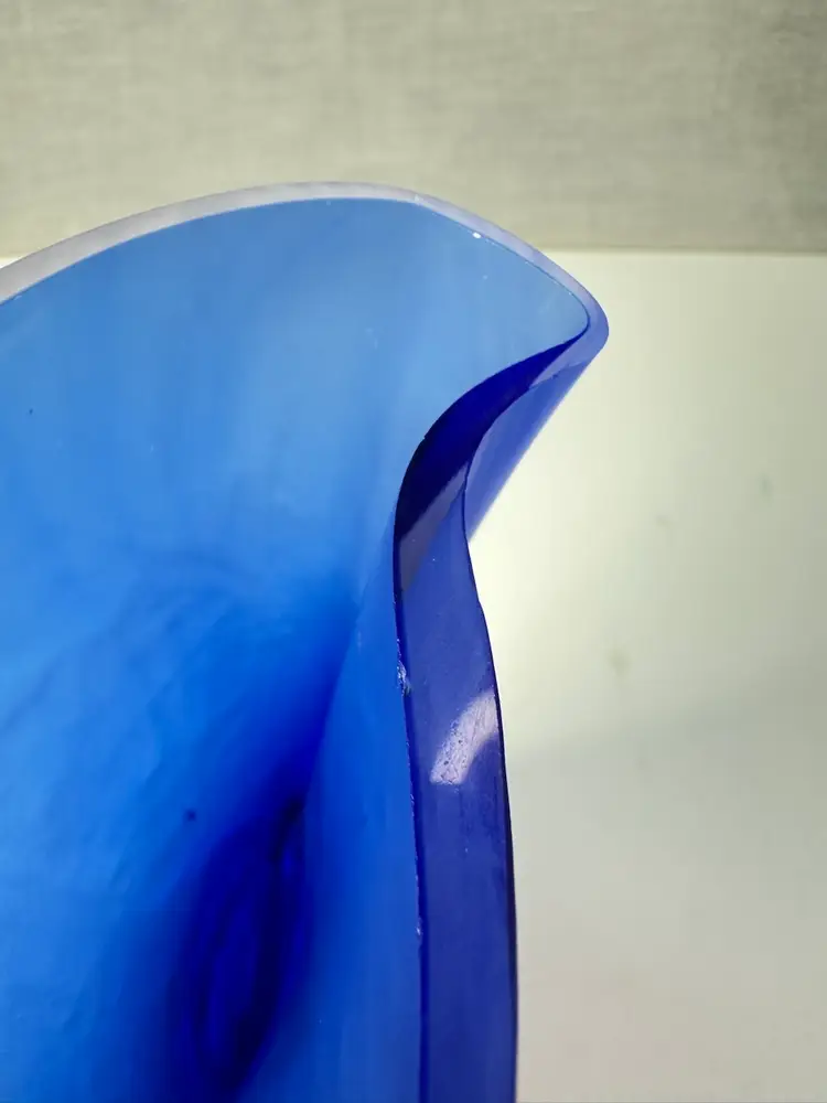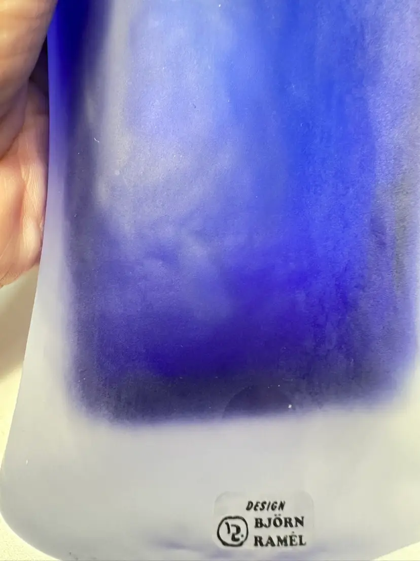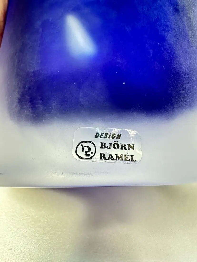 This vase was designed by Björn Ramél at SEA Glas Bruk between 1970 and 1979 in Sweden. Measuring 8 inches high and 4.25 at the widest point. The vase has a slight texture to it almost like bark on a tree. The top edge has been polished. There are two places that are flea bites or where the glass flaked during buffing. The largest on is about 1mm x 1mm or 3/64th of an inch. Has several air bubbles in the glass.