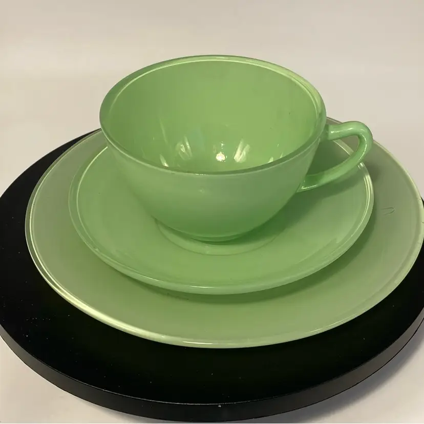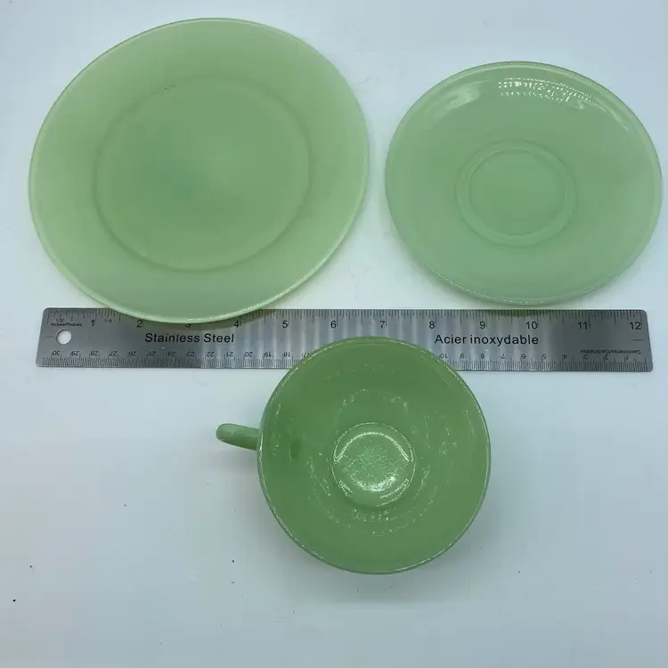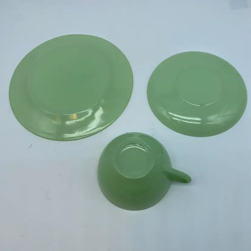 Approx 2.5 inch tall cup, 5 inches saucer, 7 inch plate Light Green No chips or cracks. Made in USA