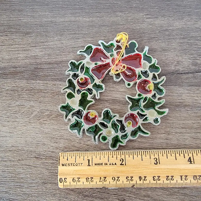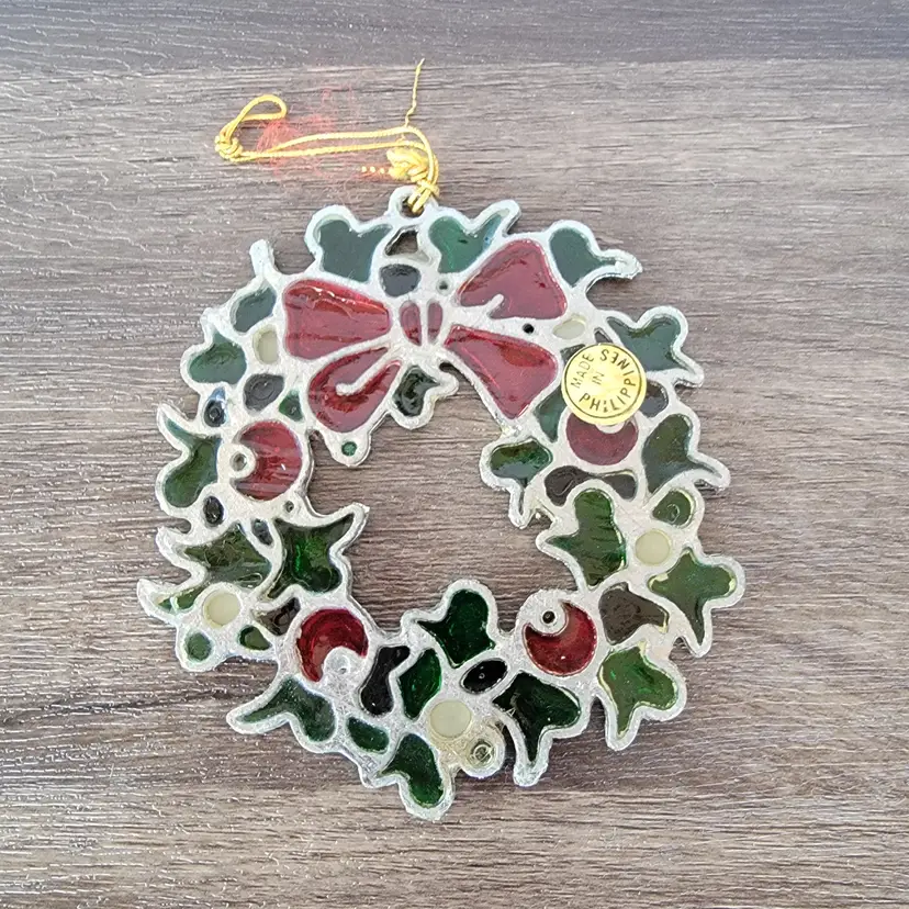 In a world where festive adornments bring life to holiday celebrations, this stained glass wreath ornament captures the essence of Christmas cheer. The delicate blend of holly and berries, accented by a grand red bow, evokes memories of joyous gatherings and winter's magic. Handcrafted with meticulous care, it shines as a beacon of yuletide warmth.