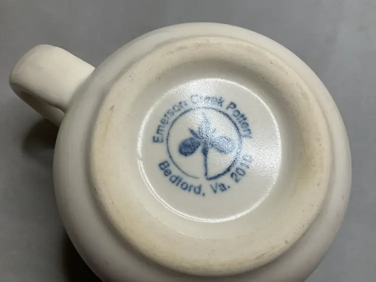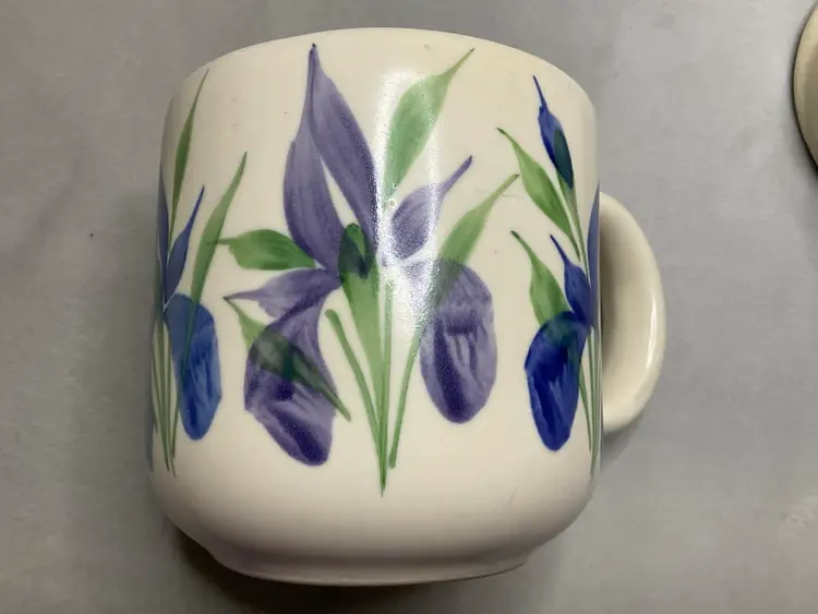 Title: Emerson Purple Iris mug Description: Hand painted iris around the mug, made in 2010 Condition or Callouts: no issue, no chips or cracks.