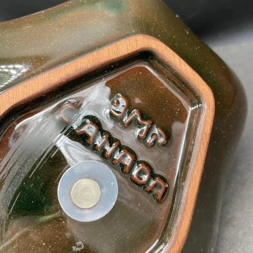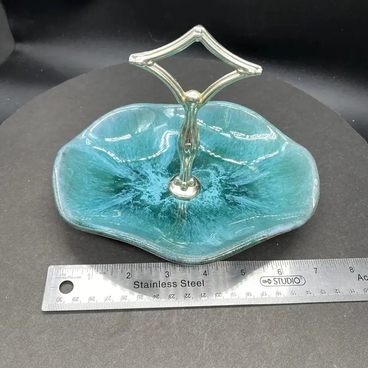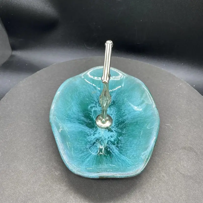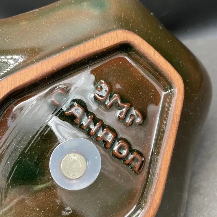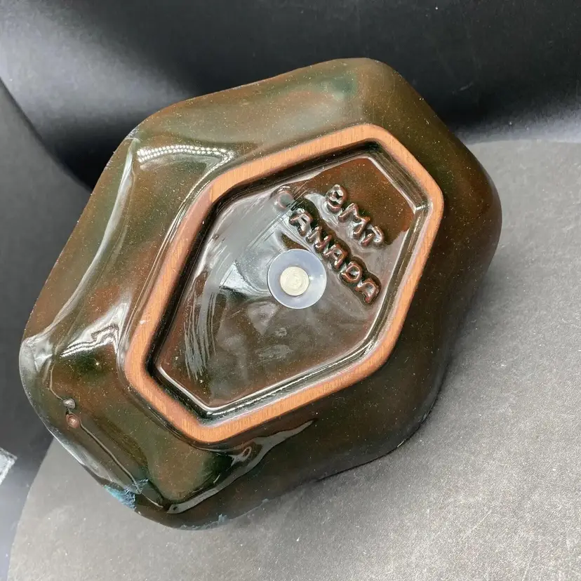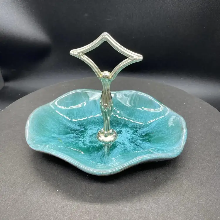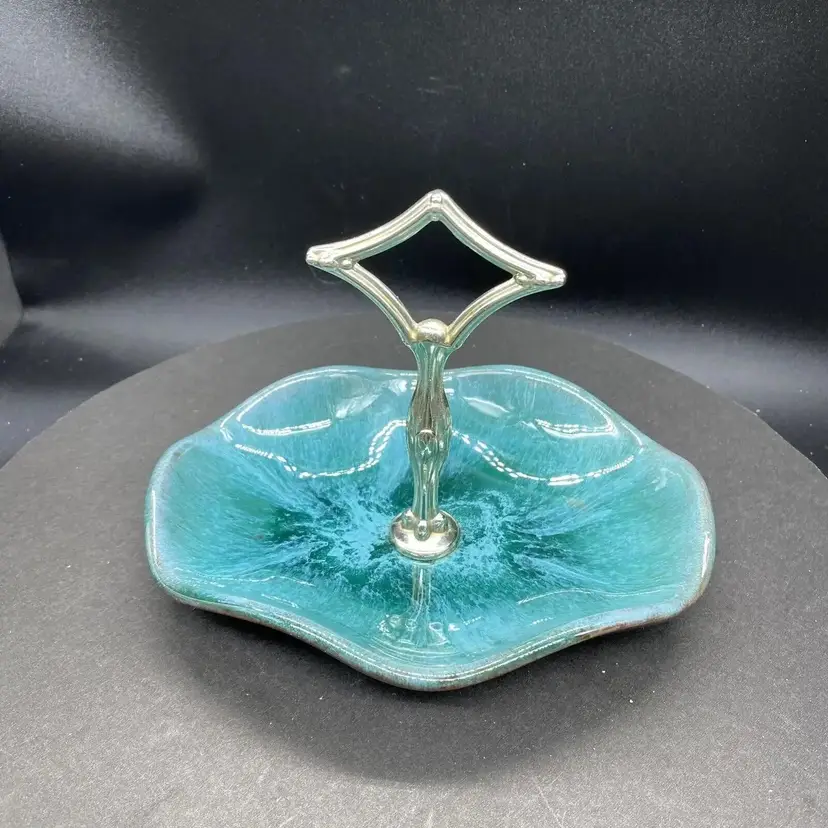 This vintage Blue Mountain Pottery trinket tidbit dish is a unique addition to any collection. Made of clay with a glossy green finish, this oval-shaped dish has a single compartment and a metal handle for easy carrying. Produced in Canada during the 1970s in an art pottery style, this candy dish is an original piece from the Blue Mountain brand. Perfect for holding small items or adding a pop of color to any room, this vintage BMP dish is a must-have for any pottery enthusiast. With its charming design and durable construction, it is sure to become a beloved piece in your collection.