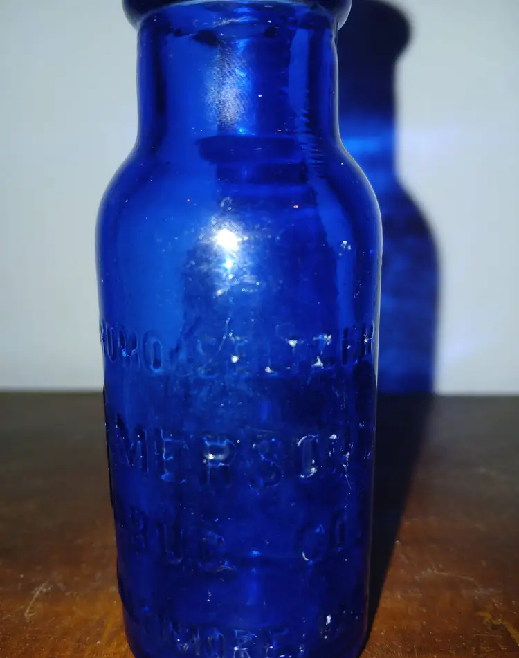 This bottle is antique cobalt blue and marked 32 on the bottom, which indicates a mold number and not a year of manufacture. It is a Bromo-Seltzer bottle that was produced by Emerson Drug Co in Baltimore Md.