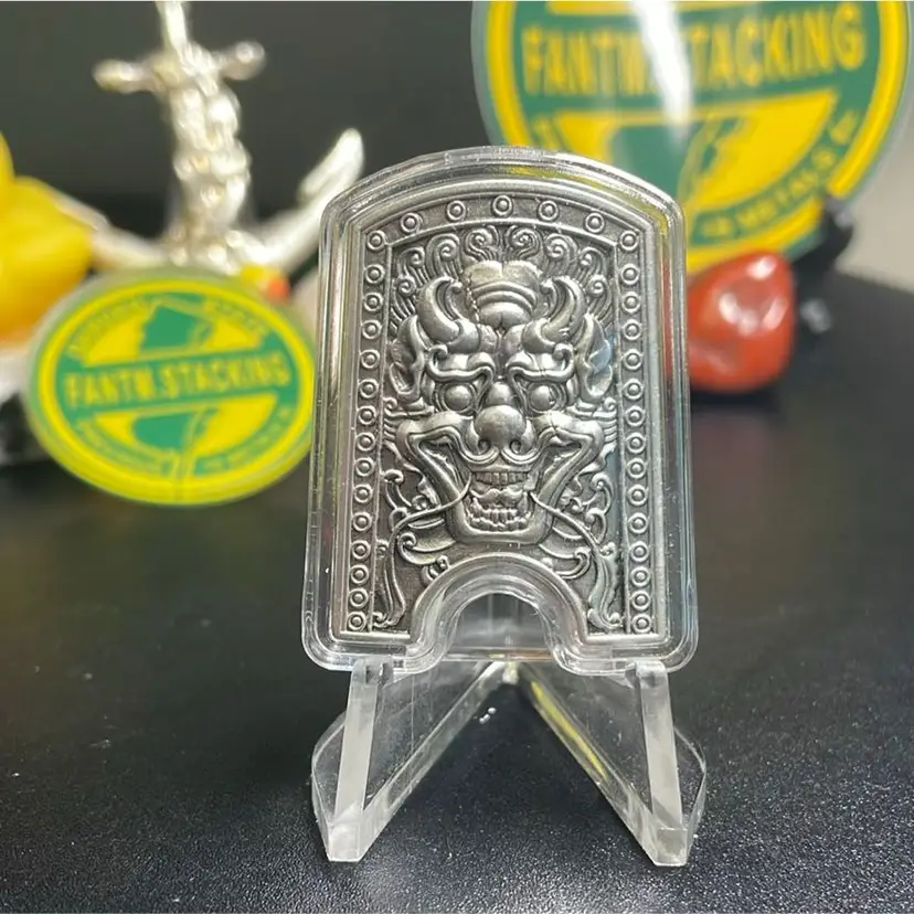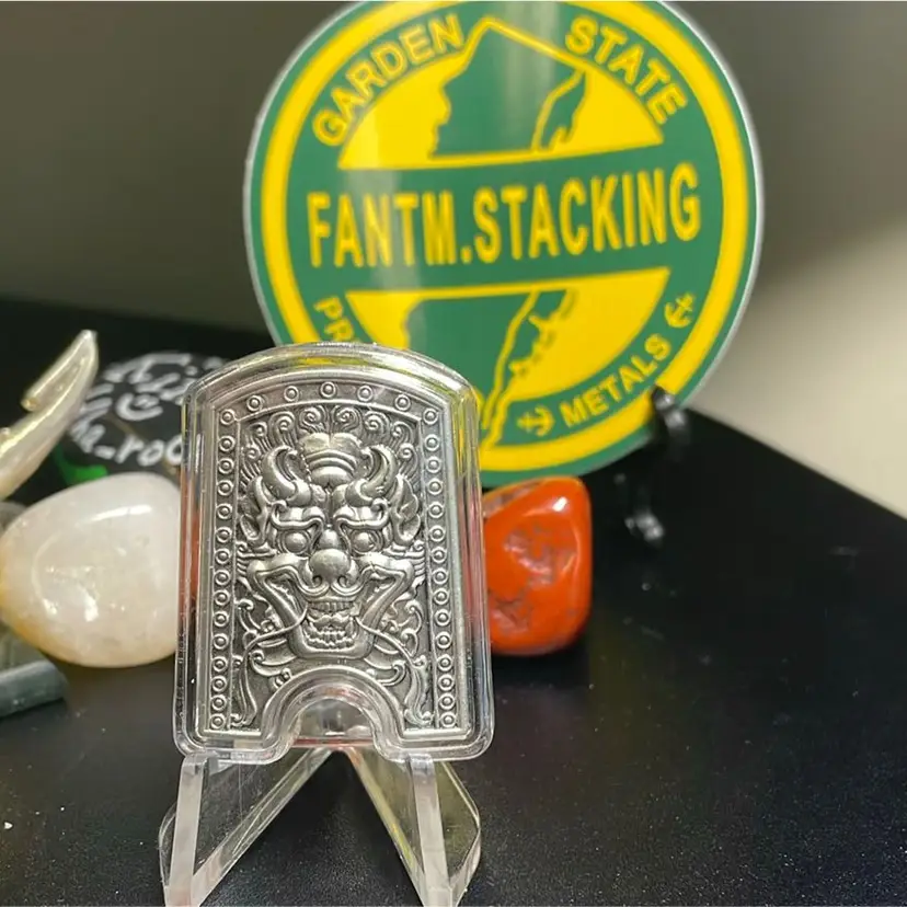 This is the third Doggaebi stacker available following the 2 oz and kilo versions. The inspiration for these stackers came from KOMSCO’s Chiwoo Cheonwang collection. In that popular series, the ancient warrior Chiwoo is depicted at various stages of battle. In addition to his impressive armor, he also uses a shield bearing the face of the Doggaebi. The shield is featured in several of the designs and also is the standard image for the obverse of each release.