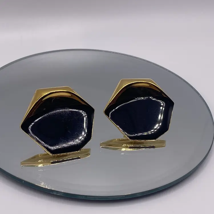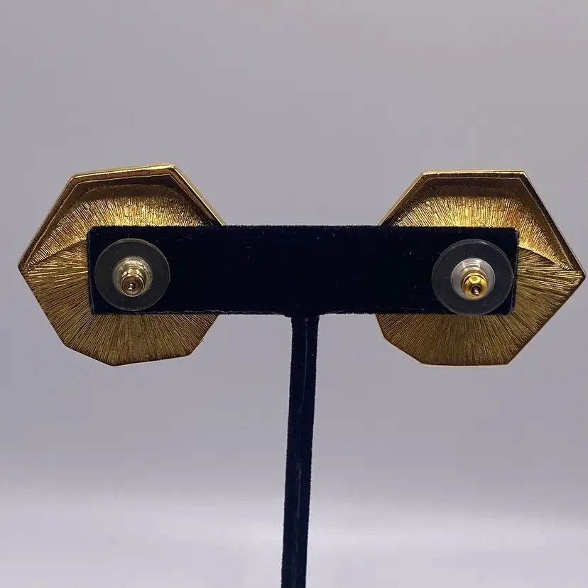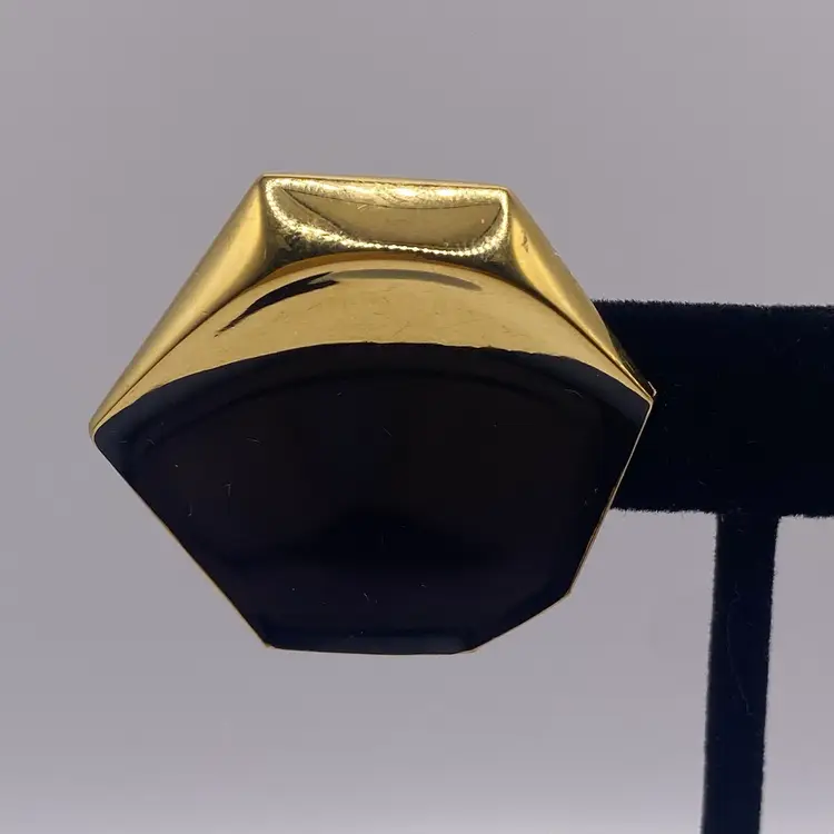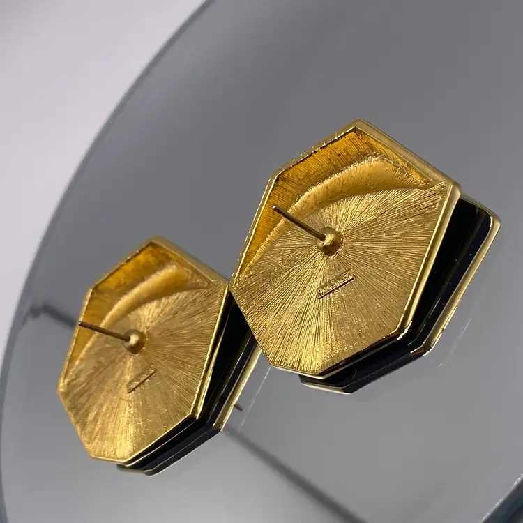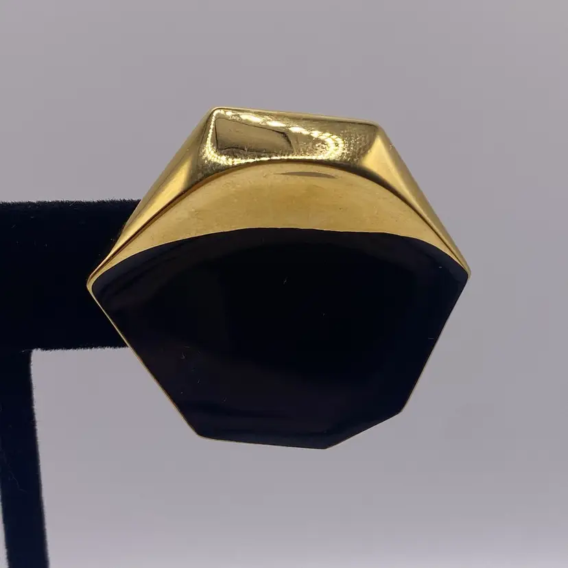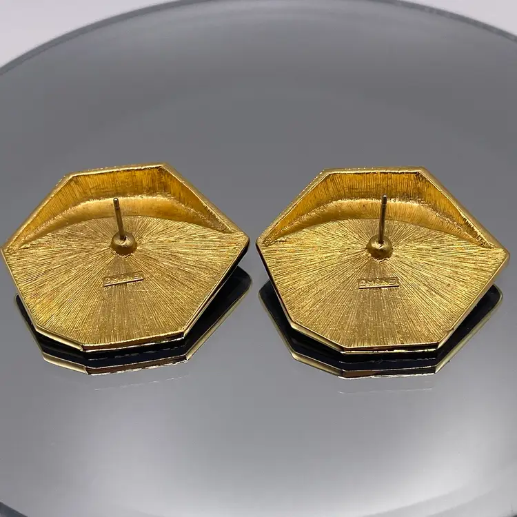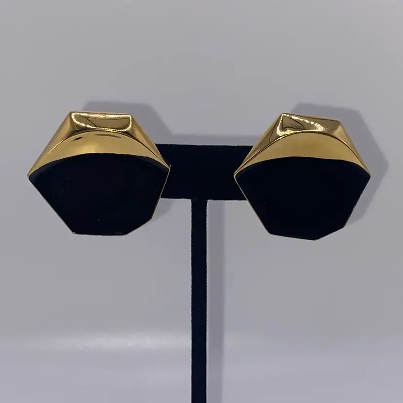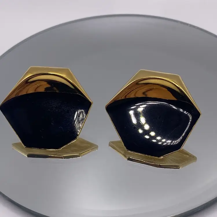Add a touch of elegance to your outfit with these beautiful 1.25" vintage Monet pierced earrings. The black enamel and gold tone metal create a stunning two-tone geometric design that is perfect for both casual and formal occasions. These earrings are signed by Monet and feature a post closure for easy wear.