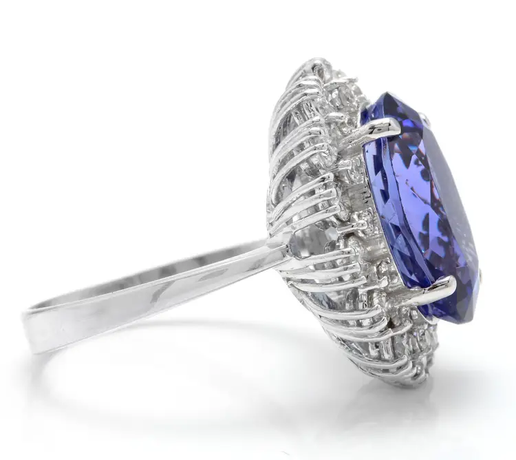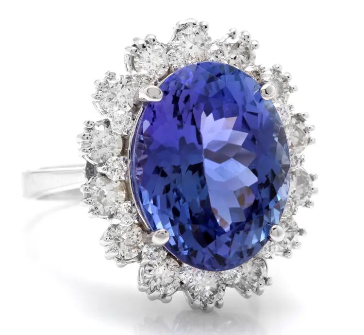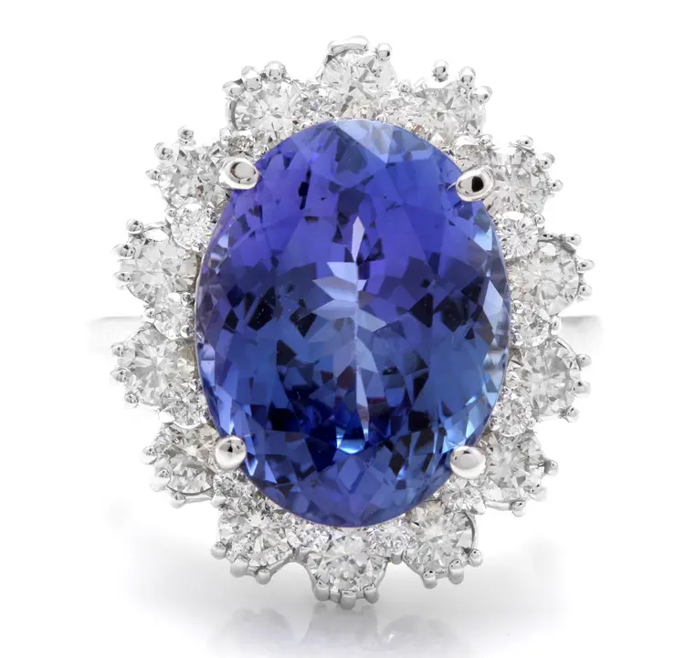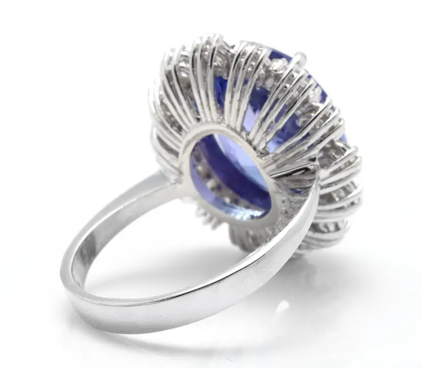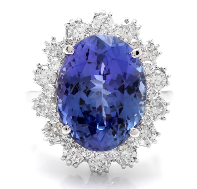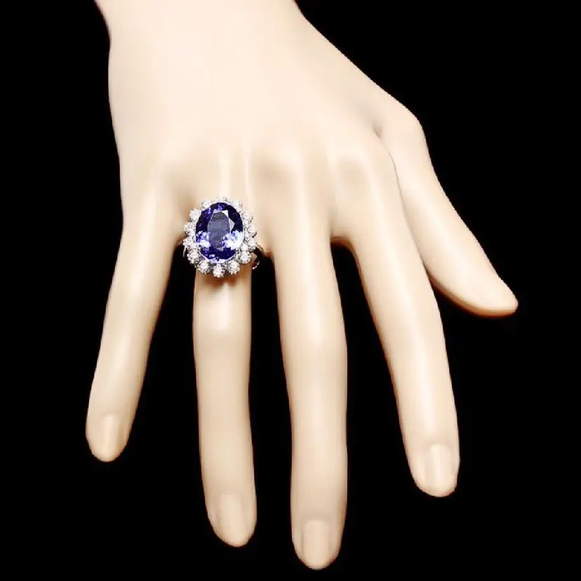 Main Stone Color: Bluish Violet Main Stone Treatment: Heating Metal Purity: 14k solid gold Main Stone: Tanzanite Sizable: Yes Main Stone Creation: Treated Metal: White Gold Ring Size: 6.5 Total Carat Weight (TCW): 9.80 Main Stone Shape: Oval Type: Ring Brand: Unbranded