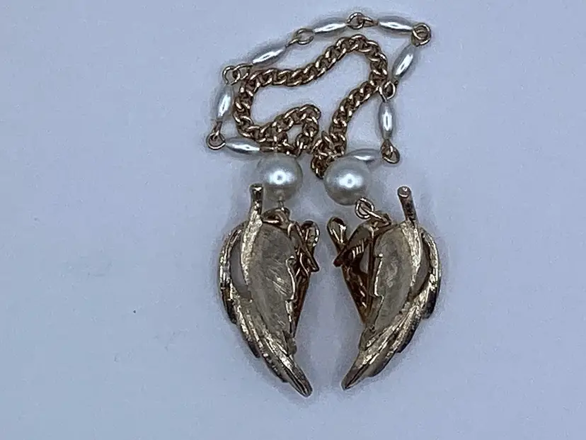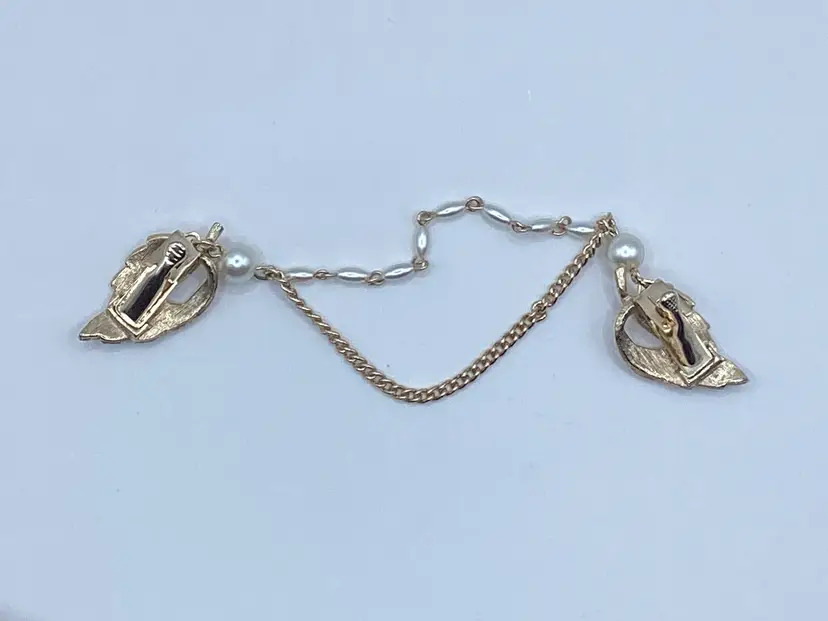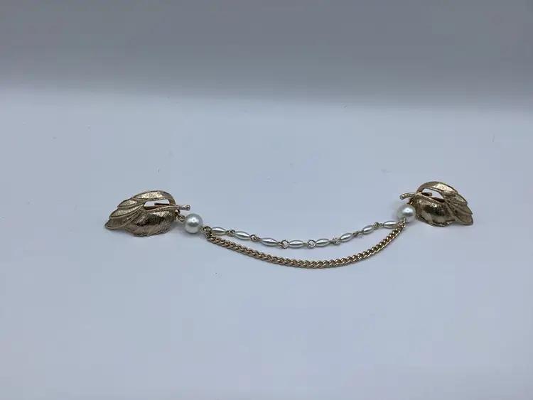 Brand: Unknown not marked Features: Leaf sweater clips in brushed gold tone / Faux pearl beads / Gold tone chain Material: Metal Color: Gold tone / Faux pearls Measurements: Length - 6 & 3/4” from tip of leaf to tip of leaf