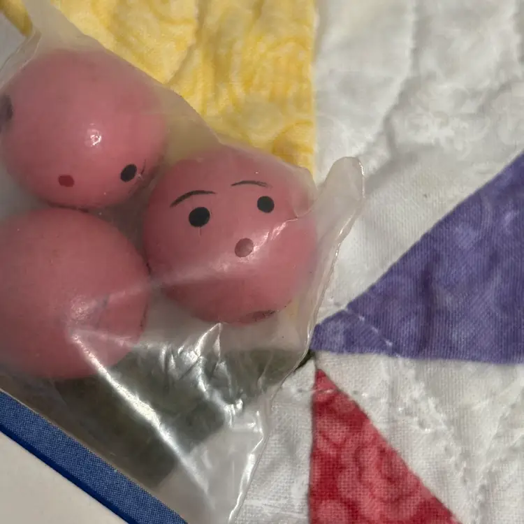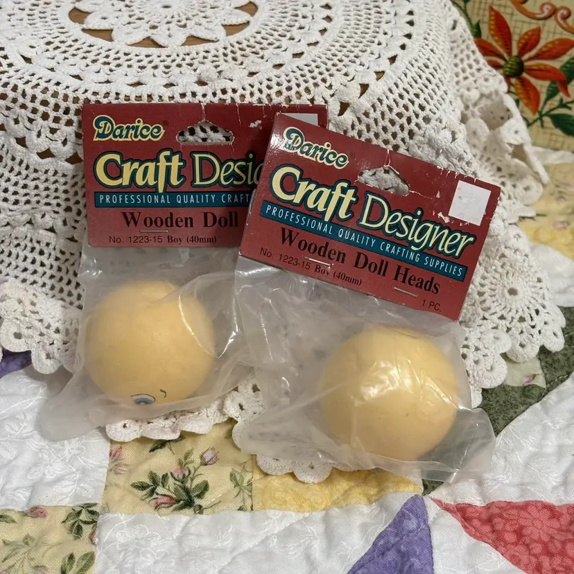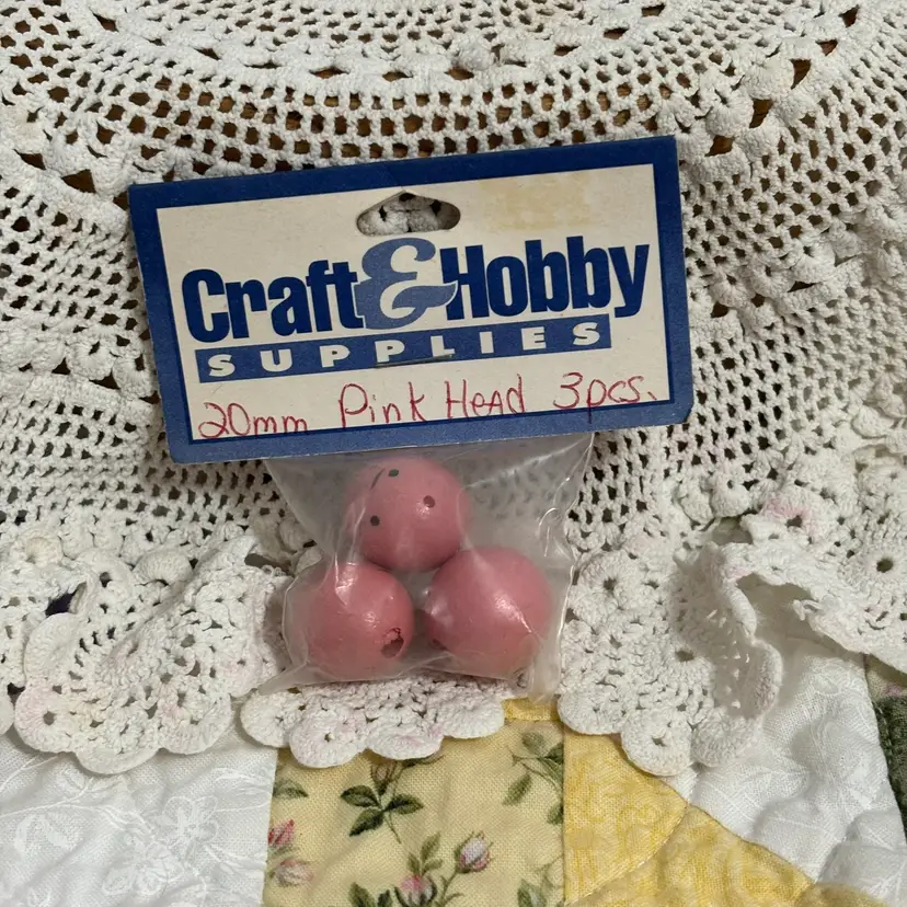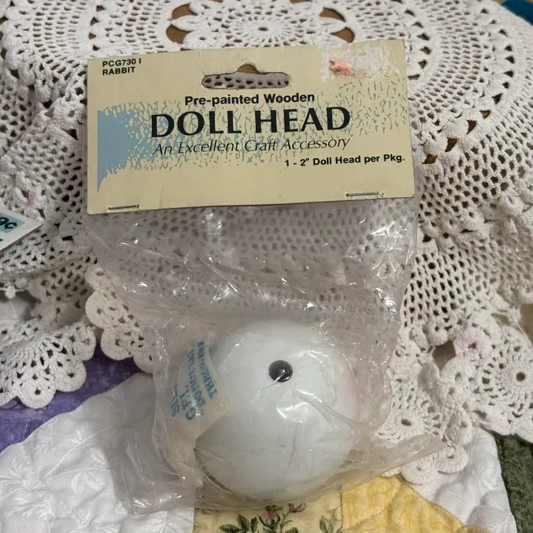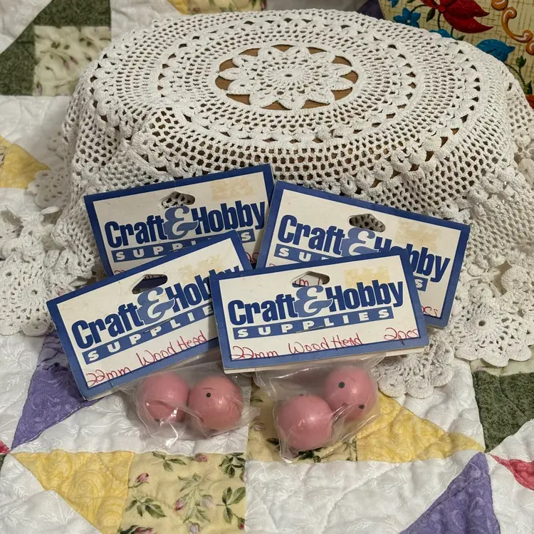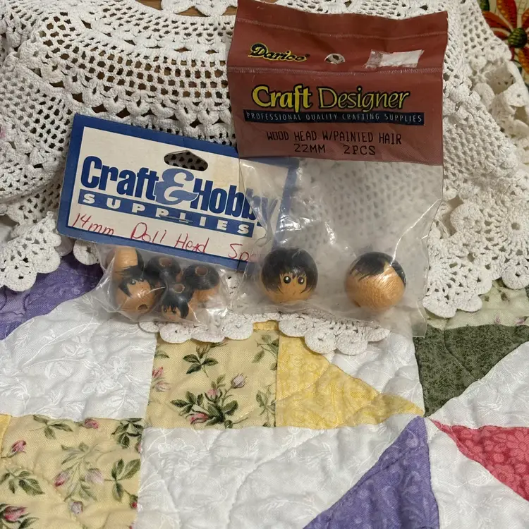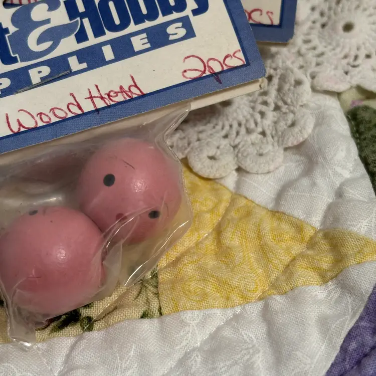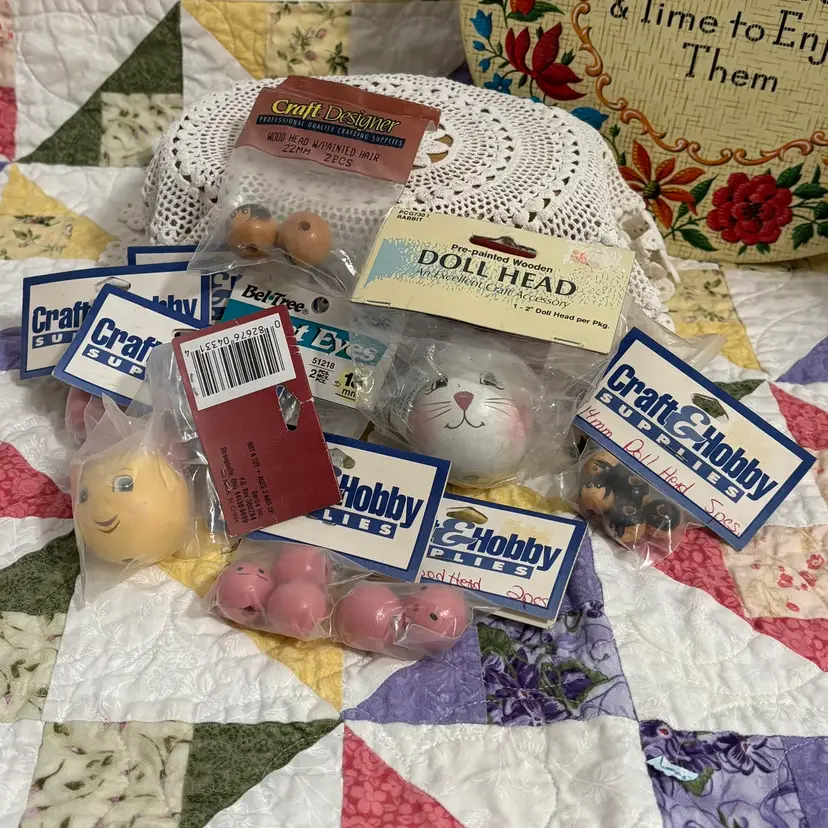 You will get all 10 bags of asst. vintage wooden hand painted craft heads and 1 pair of blue cat eyes. Heads are in asst. sizes and colors. There is one large Bunny without ears. NOS Est era is 1980's since these were popular in doll making and crafts.