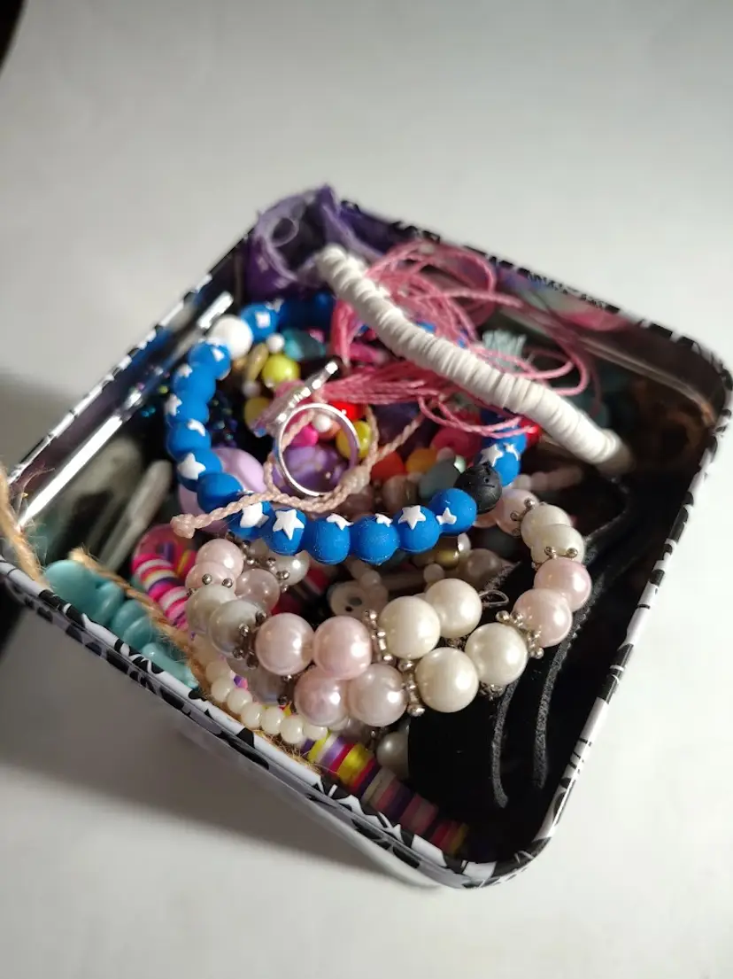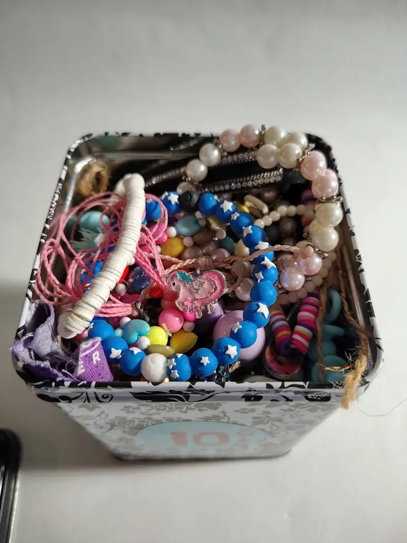 Decorative Little Girl's Mystery Jewelry Metal Tin, weighing 1.7 oz. and filled with rings, earrings, necklaces, bracelets, more.