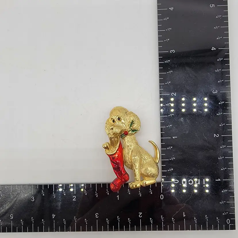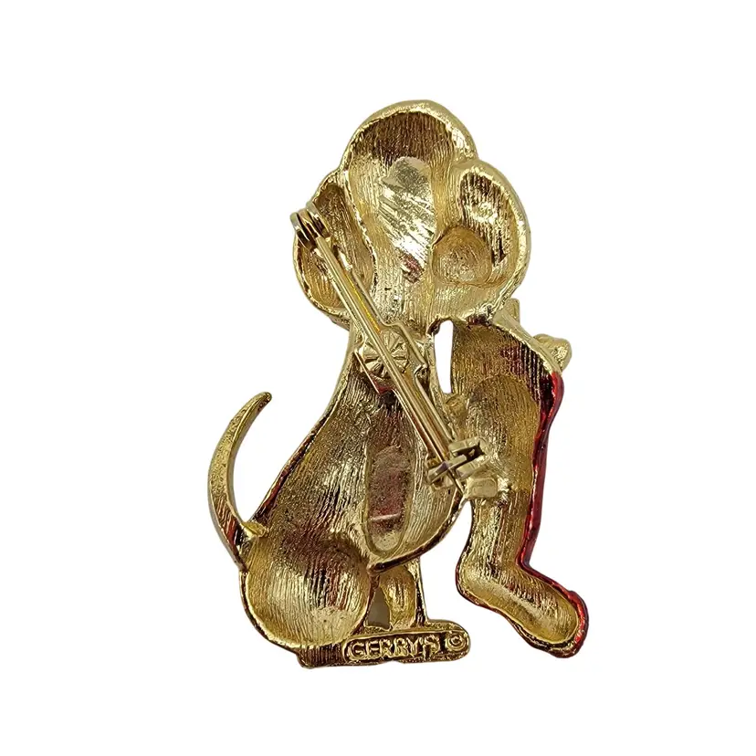 In the world of holiday adornments, this charming vintage brooch tells a tale of festive cheer. A playful puppy, caught in the act with a bright red stocking, embodies the spirit of Christmas with its golden shimmer and twinkling eyes, making it a delightful accessory to treasure.