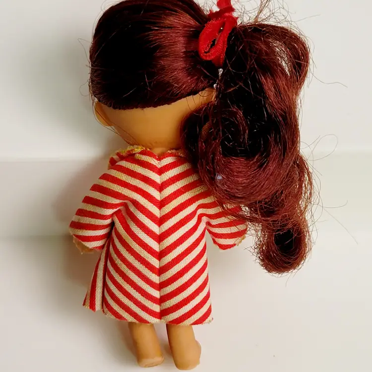 1960s Mattel Little Kiddle's doll. 2.5-3.5" tall. Vinyl/rubber with posable legs. The doll may show wear consistent with age, such as discoloration, holes in rubber feet or hands from wire. Clothing stains or fabric issues. Frizzy hair.