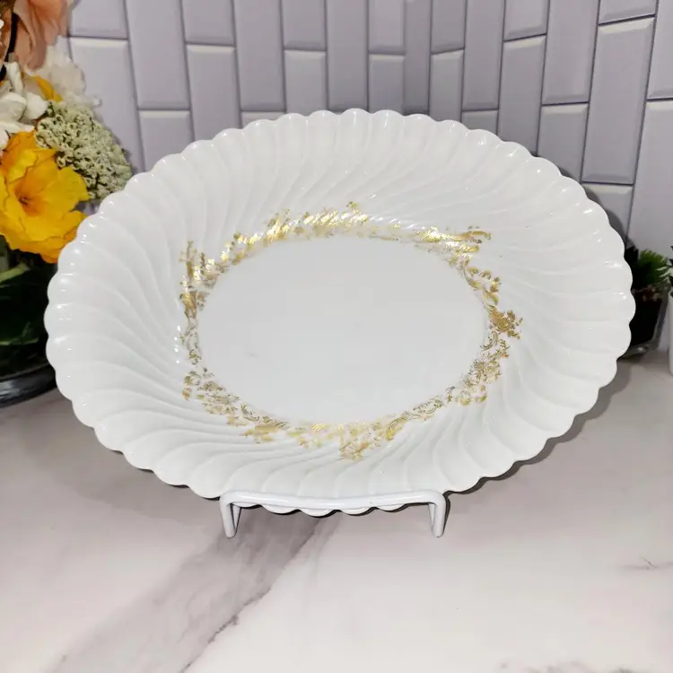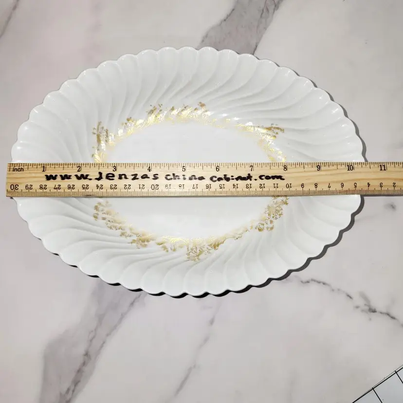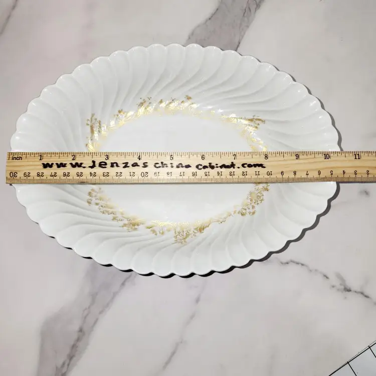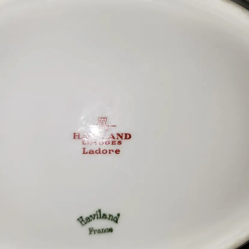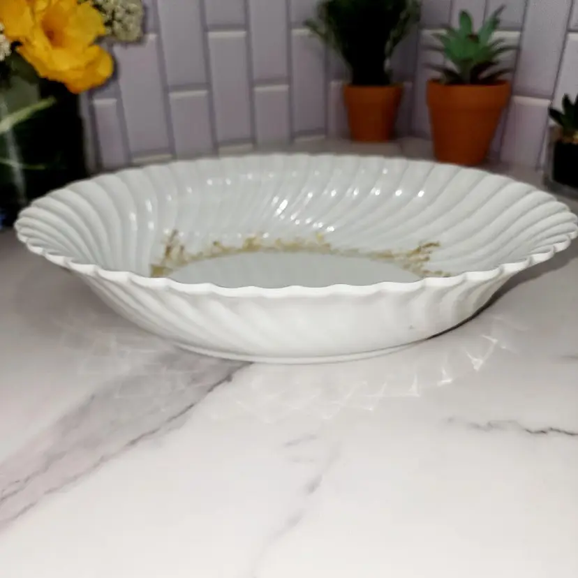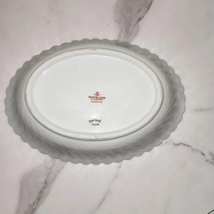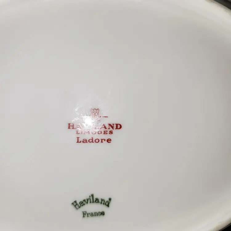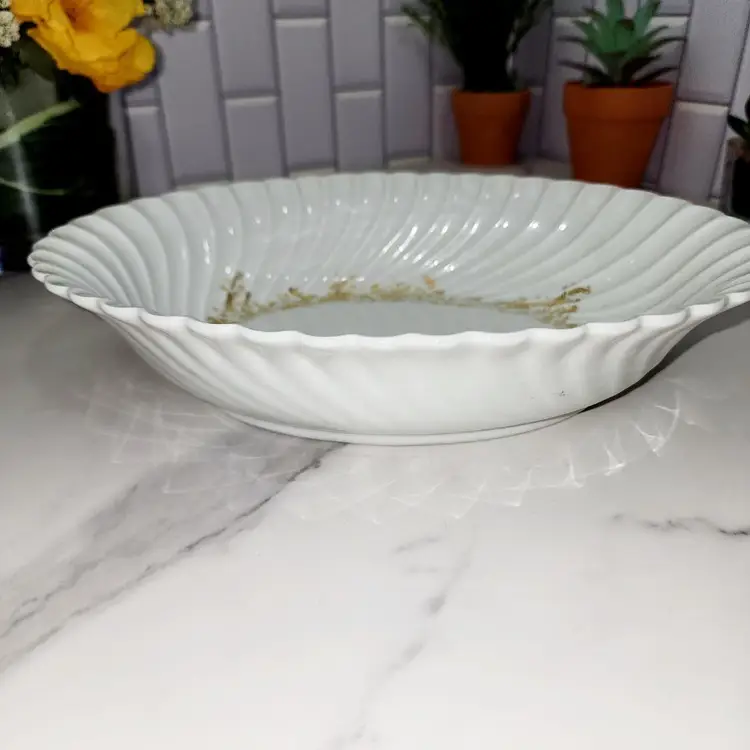 The LINES!! The Shell-like shape makes this piece stand out. Maybe that is why it's sort after. Gold Flower Border on bottom of bowl. Vibe: Eleglant. Pattern: Ladore (discontinued) Made by: Haviland, France/Limoges Condtioned: Used. Slight fading of gold. No chips or cracks.
