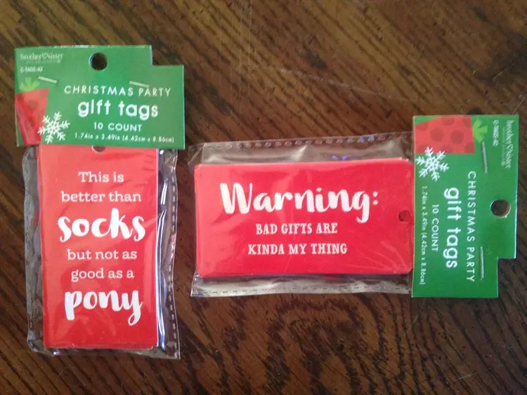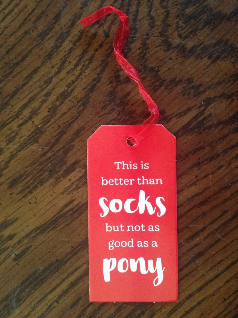 Pack Of 10 Gift Tags Red With White Print & Red Ribbon 5 Say: "This Is Better Than Socks But Not As Good As A Pony" 5 Say: "Warning: Bad Gifts Are Kinda My Thing" Measure Approx 1 3/4" x 3 1/2" Feel Free To Contact Me With Any Questions I Do Combine Shipping Brand: Brother Sister Design Studio Type: Gift Tag Occasion: Christmas Color: Red