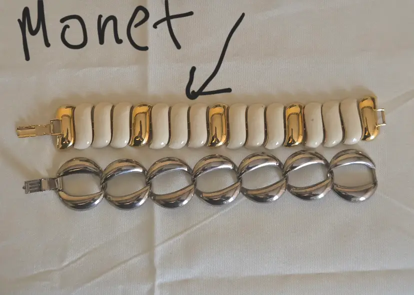 The Gold Tone White Enamel link bracelet is signed Monet. SEE PHOTOS ABOVE.
