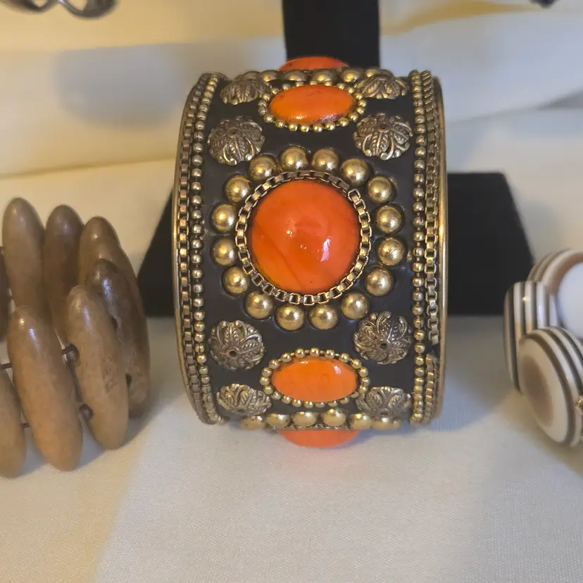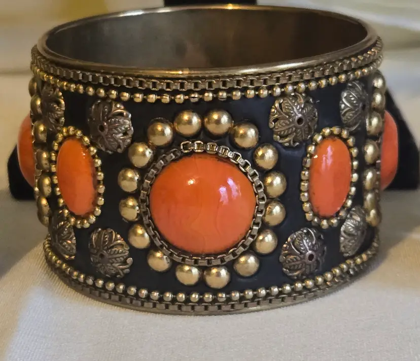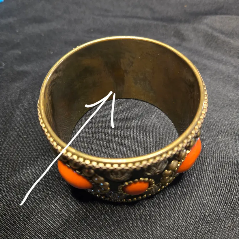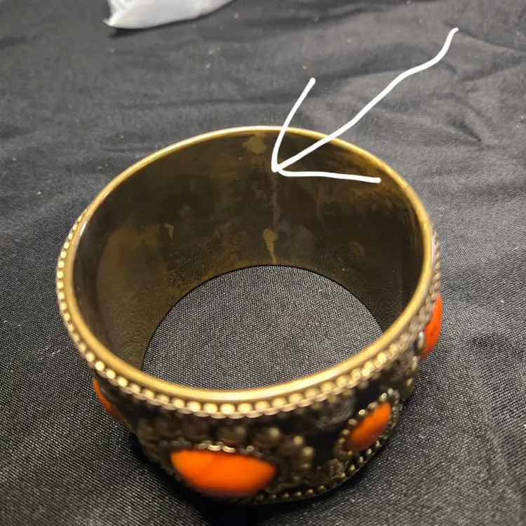The brass gold tone cuff bracelet with coral orange color stones has slight tarnish wear on the inside. I didn't try to clean it. SEE PHOTOS ABOVE.