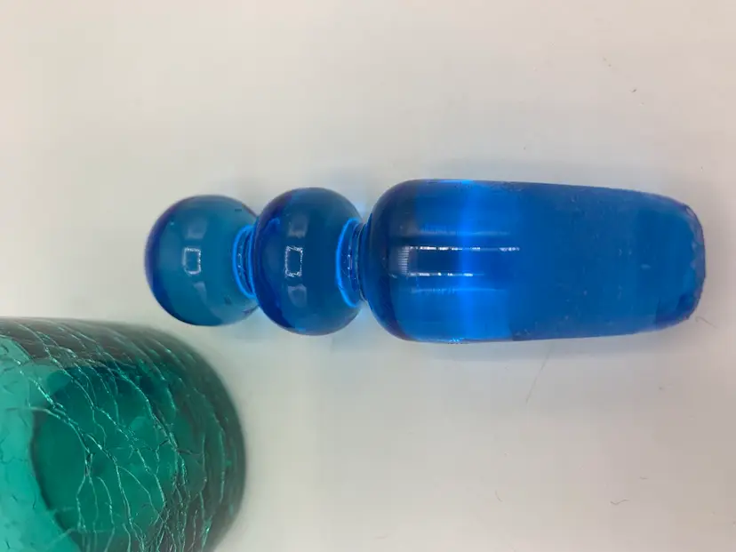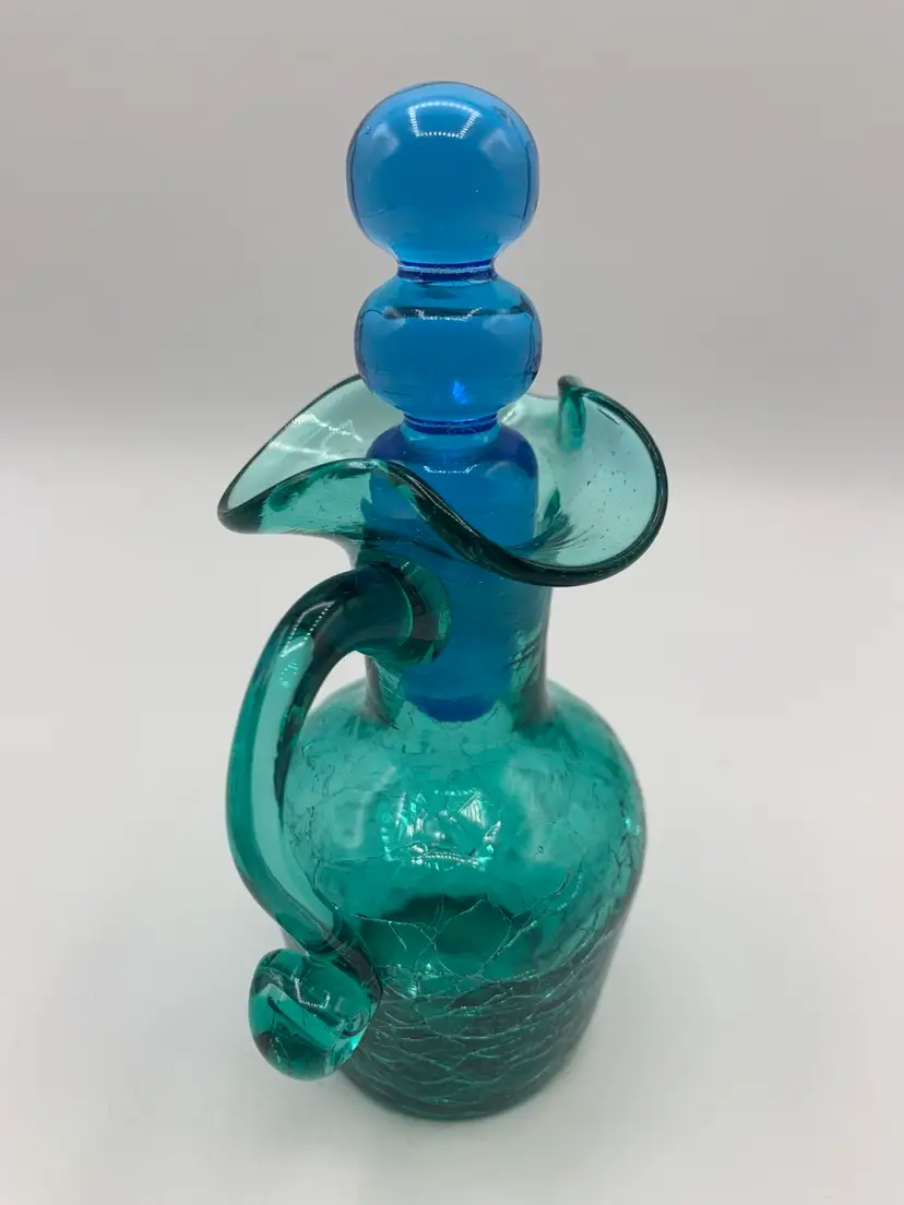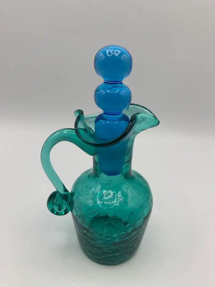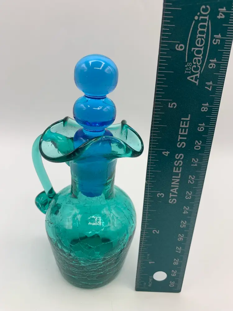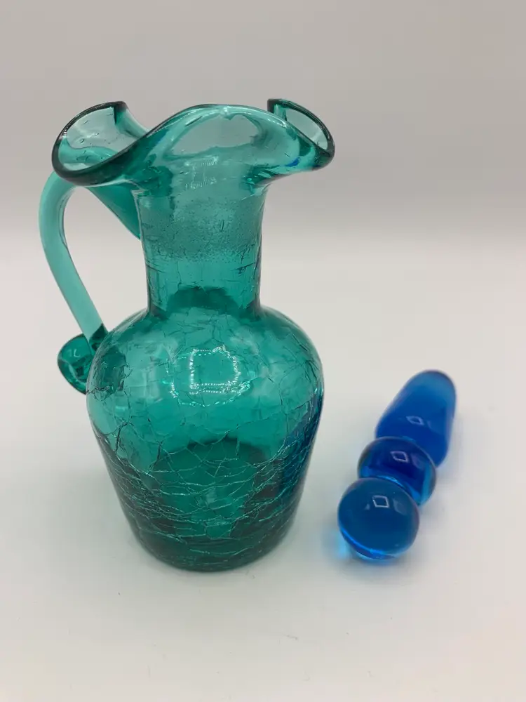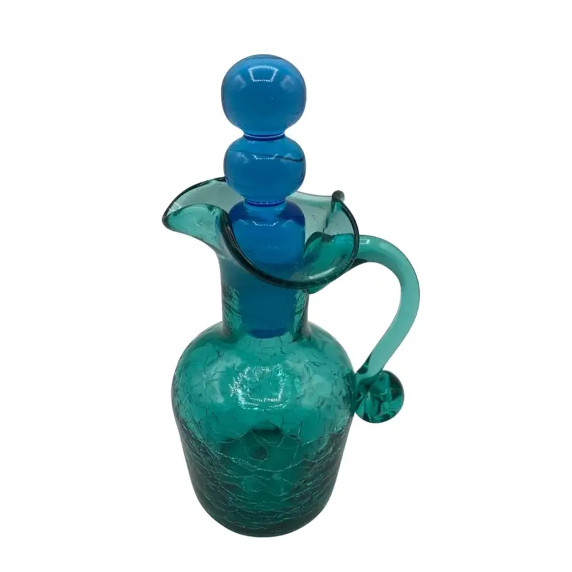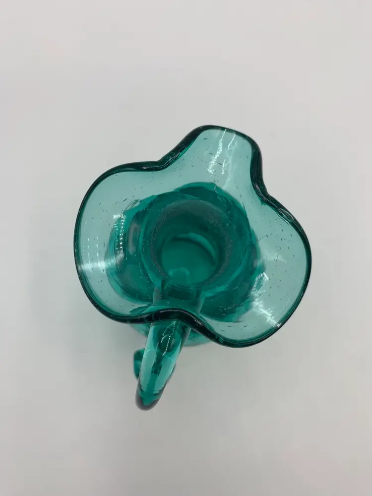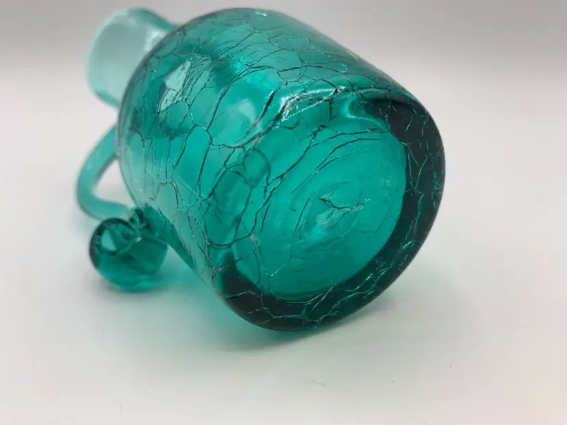 The aqua blue color is vibrant and eye-catching, perfect for display in a glass cabinet, in a window or on a shelf. Whether used as a decorative accent, vase, or collectible glassware, it adds timeless beauty and handcrafted appeal. Estimated Mid 20th Century production, hand blown with an applied handle, features a crackle glass finish. It is 4.5" x 3". Excellent vintage condition – no chips, cracks, or repairs. This piece is unmarked, it closely resembles the style and photos of of Rainbow glass artistry. A wonderful addition for lovers of vintage glass, retro decor, or handmade artisan pieces.