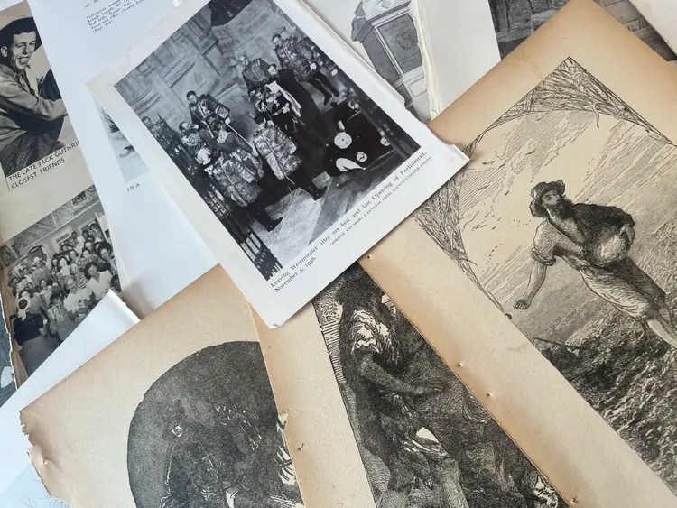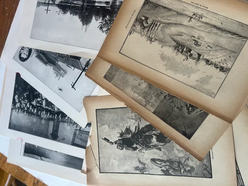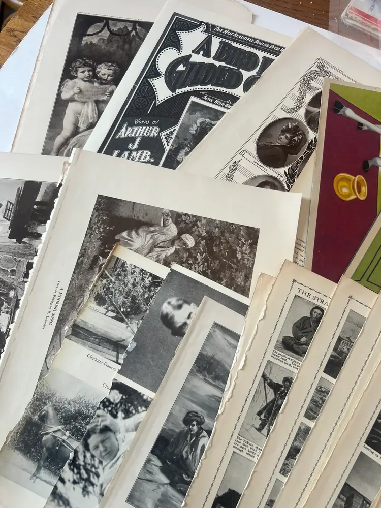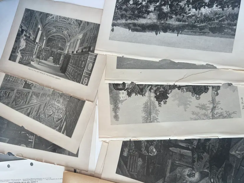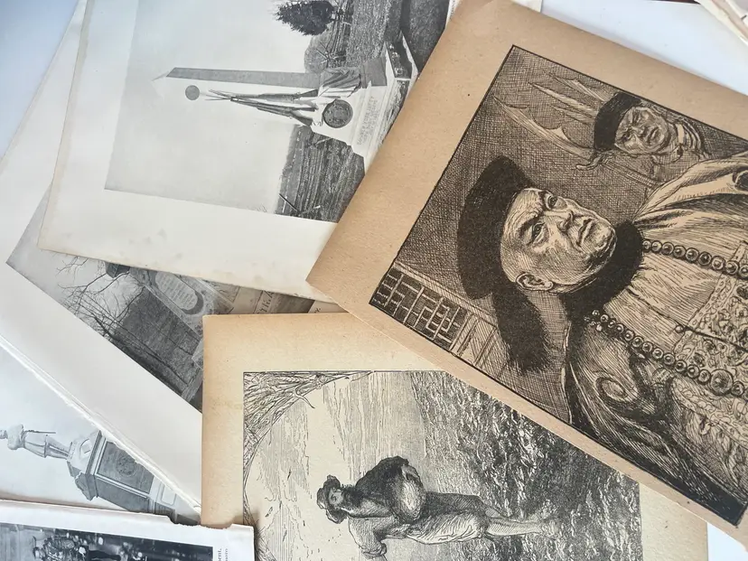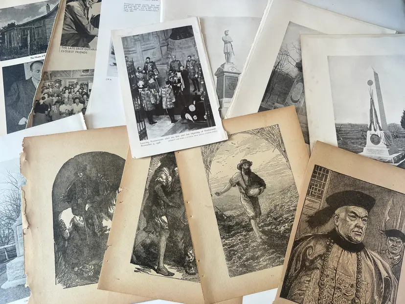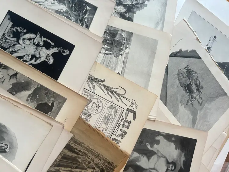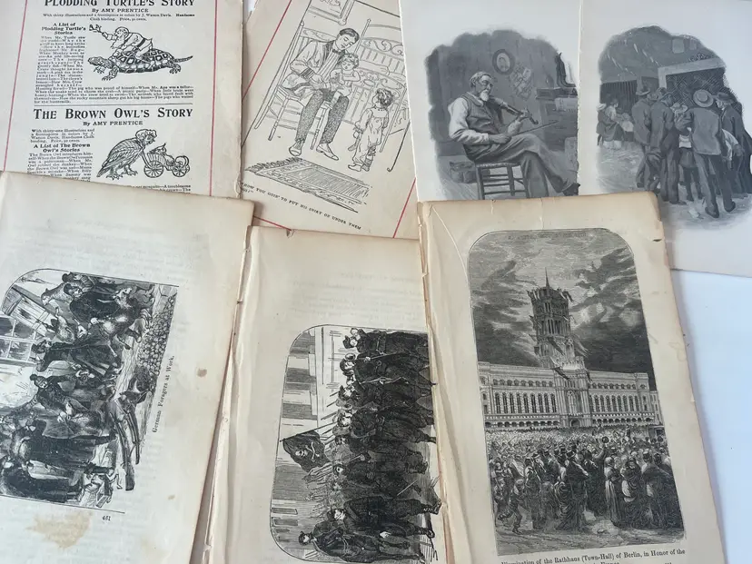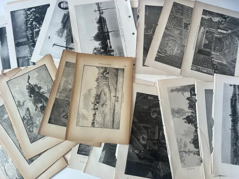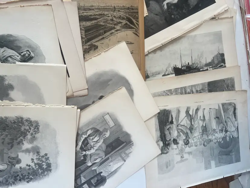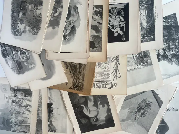 An eclectic & fun selection of 100 gorgeous prints/ lithographs/ engravings/ book pages with graphics, Pages are printed/ published in the 1800s and 1900s and showcase a wide variety of subjects/ themes. These pages are largely removed from old books. There may be some prints from unbound collections.
