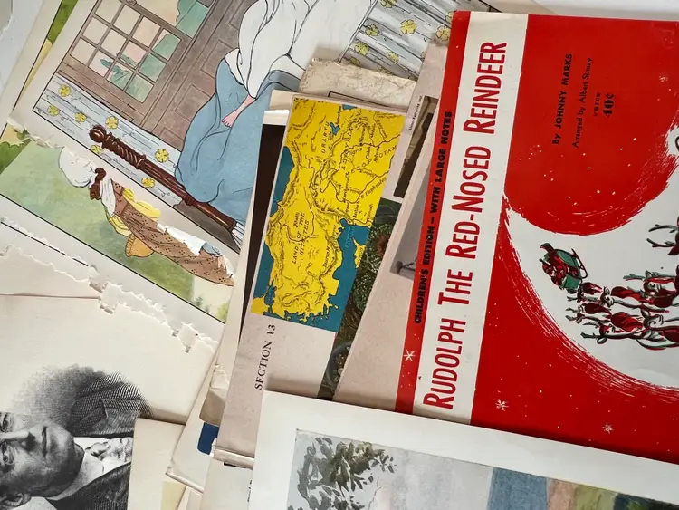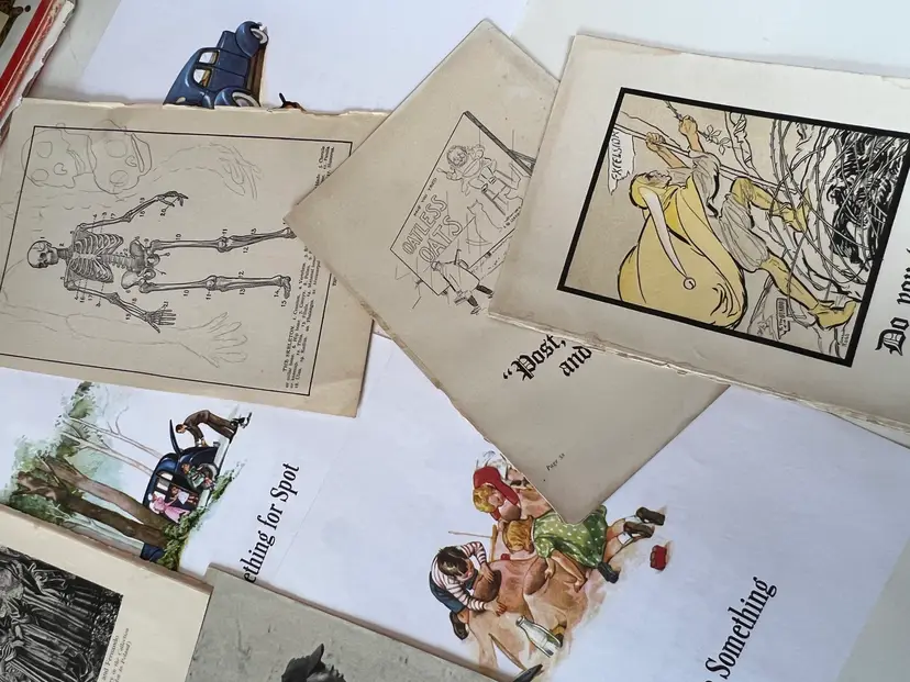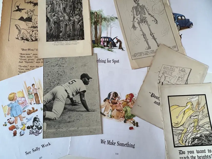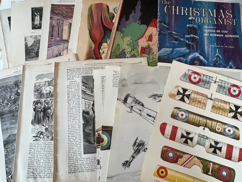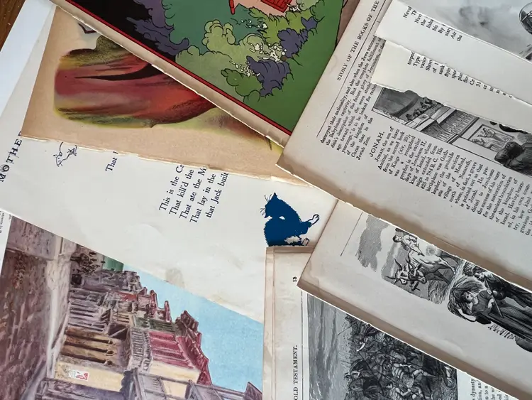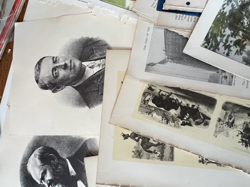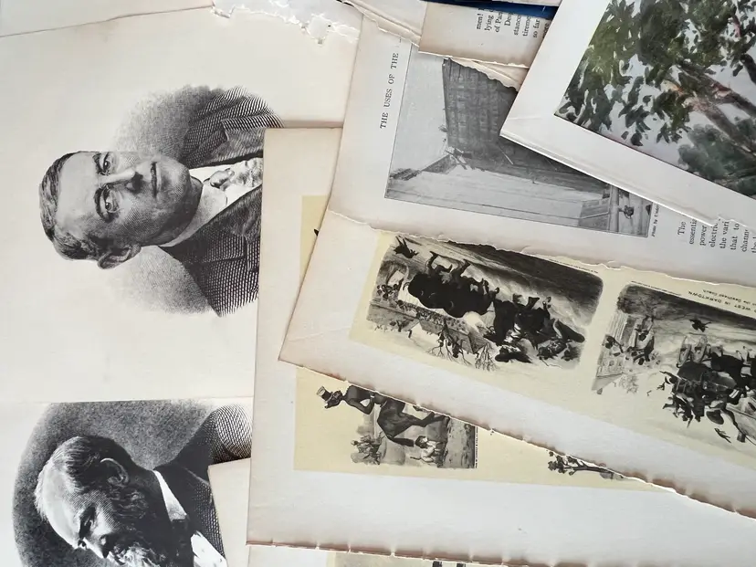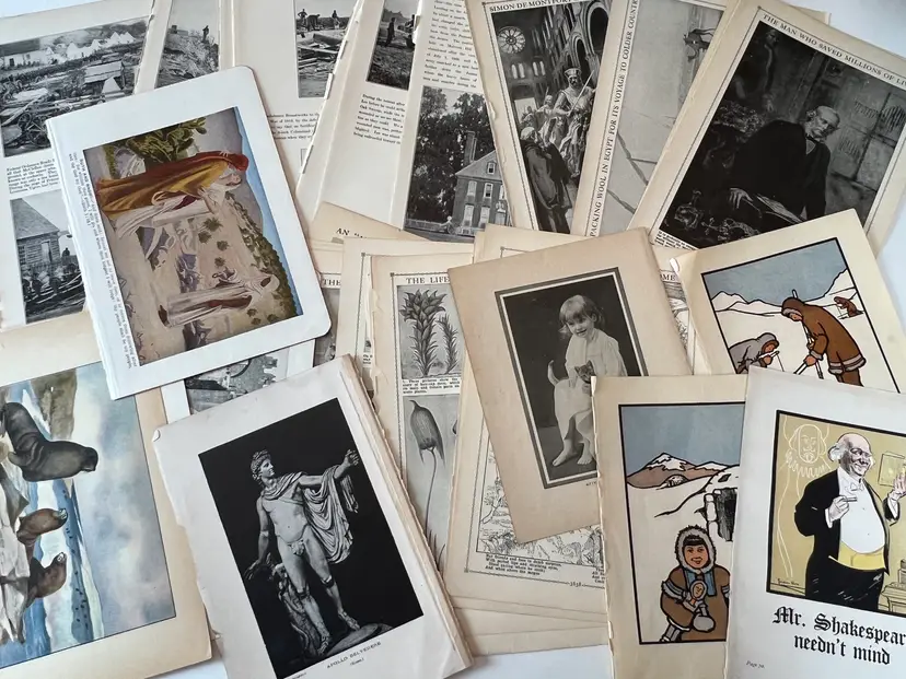An eclectic & fun selection of 100 gorgeous prints/ lithographs/ engravings/ book pages with graphics, Pages are printed/ published in the 1800s and 1900s and showcase a wide variety of subjects/ themes. These pages are largely removed from old books. There may be some prints from unbound collections.