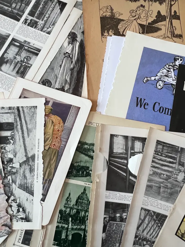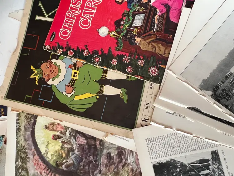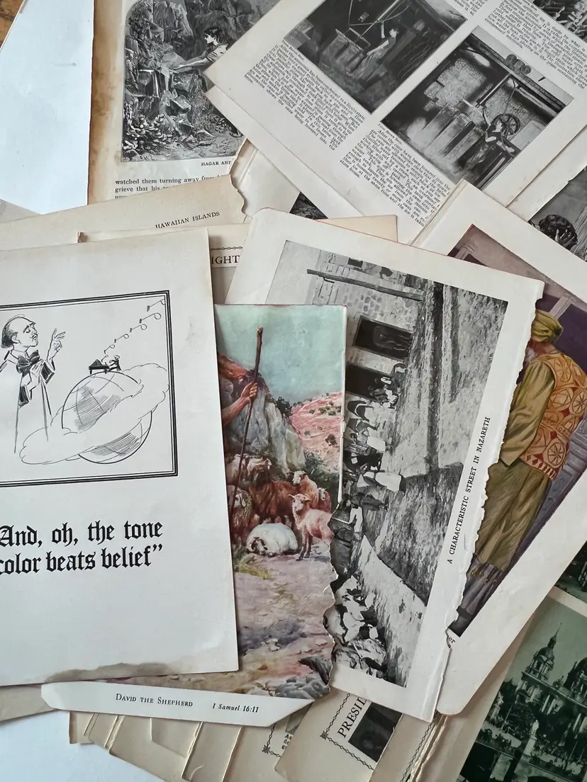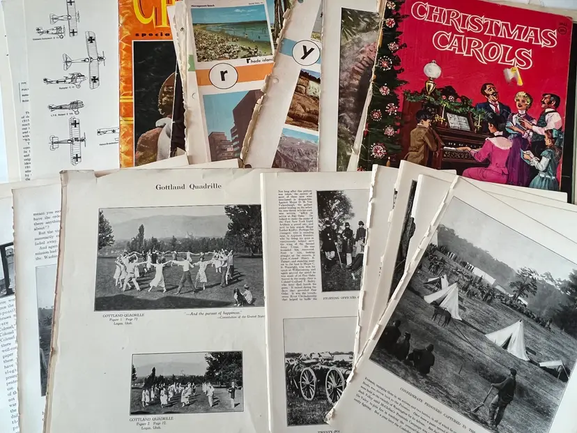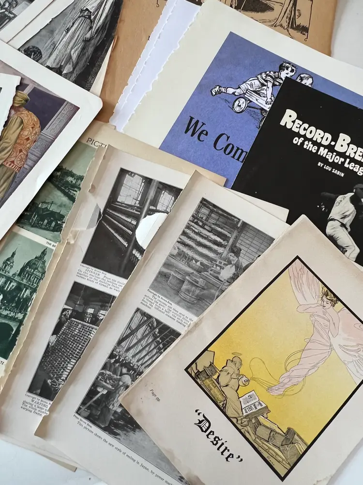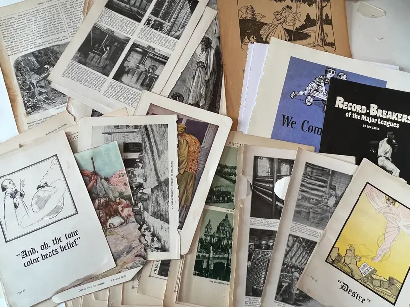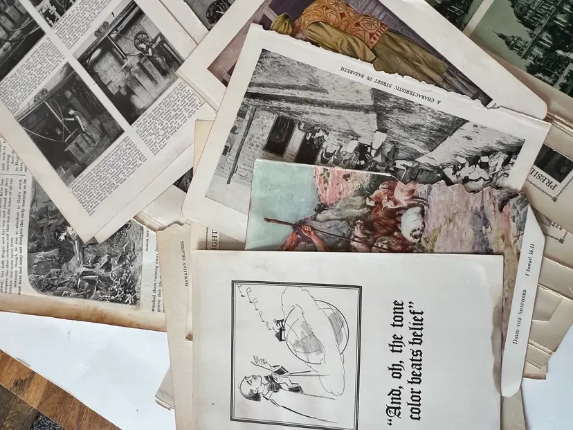 An eclectic & fun selection of 100 gorgeous prints/ lithographs/ engravings/ book pages with graphics, Pages are printed/ published in the 1800s and 1900s and showcase a wide variety of subjects/ themes. These pages are largely removed from old books. There may be some prints from unbound collections.