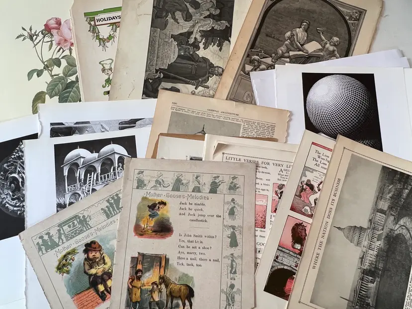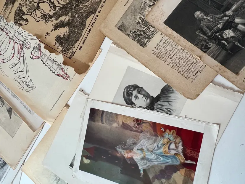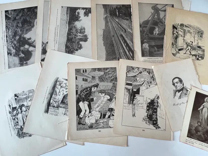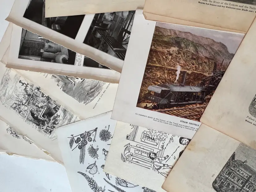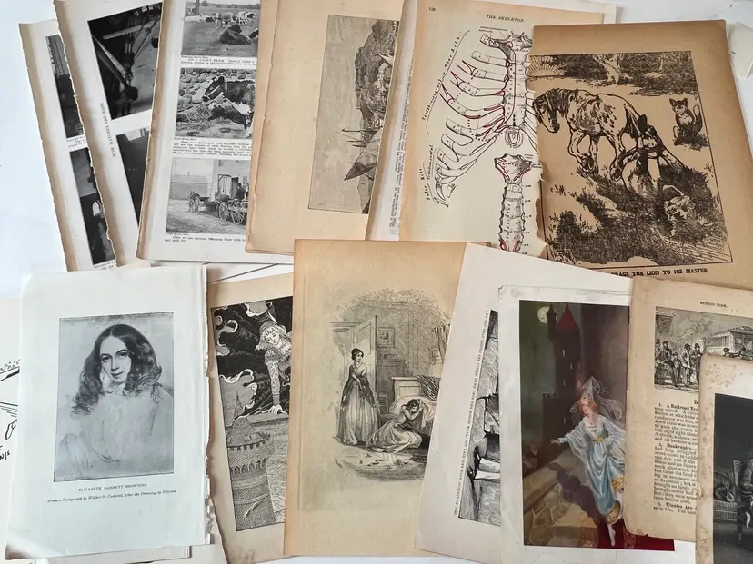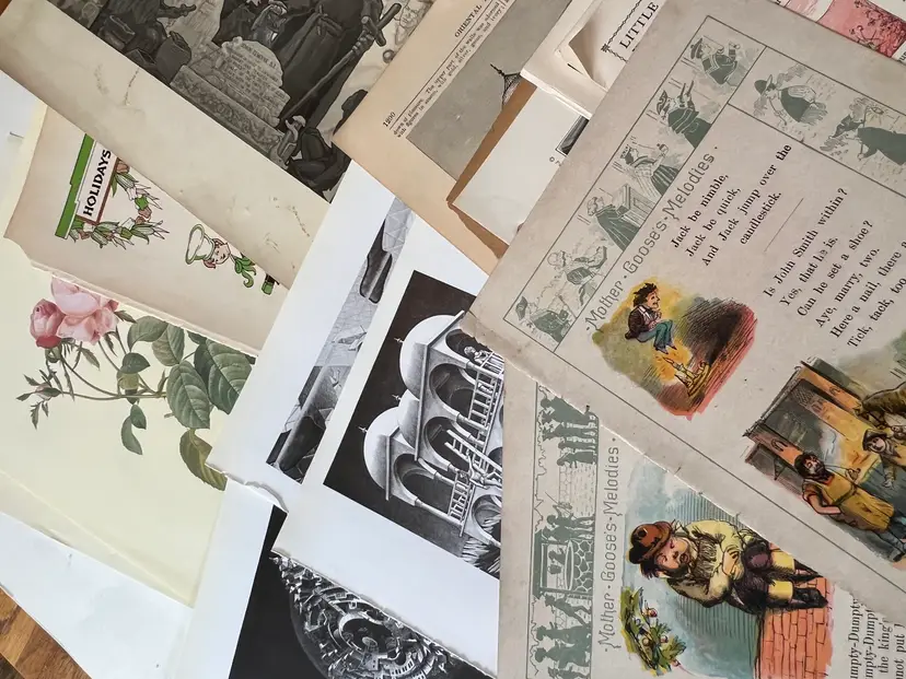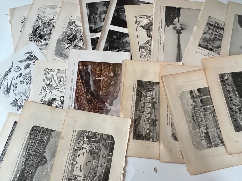 An eclectic & fun selection of 100 gorgeous prints/ lithographs/ engravings/ book pages with graphics, Pages are printed/ published in the 1800s and 1900s and showcase a wide variety of subjects/ themes. These pages are largely removed from old books. There may be some prints from unbound collections.