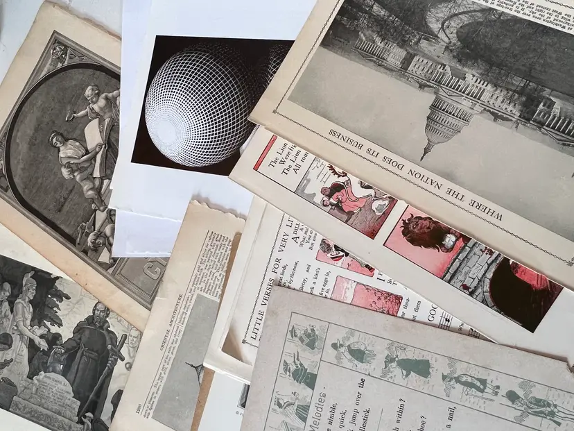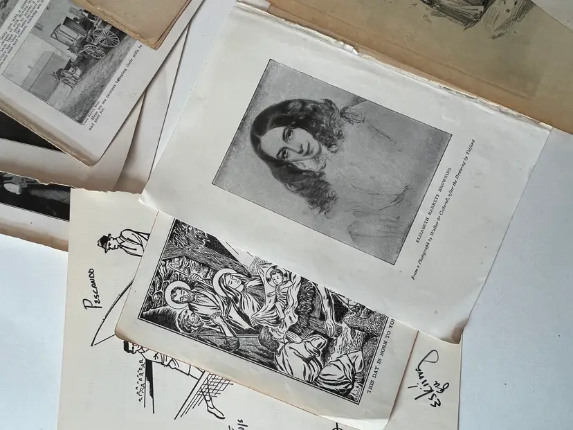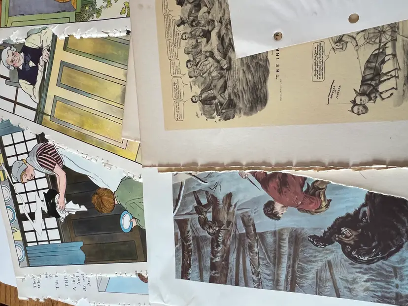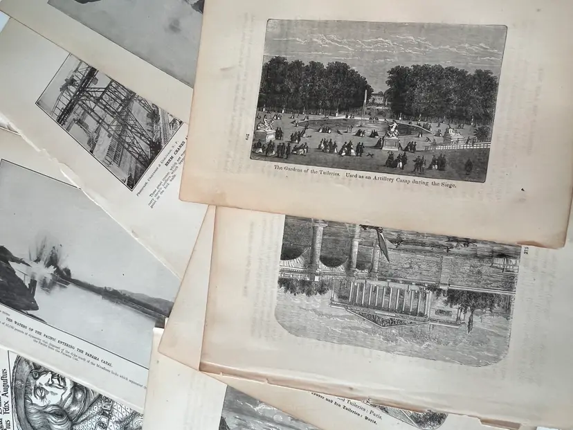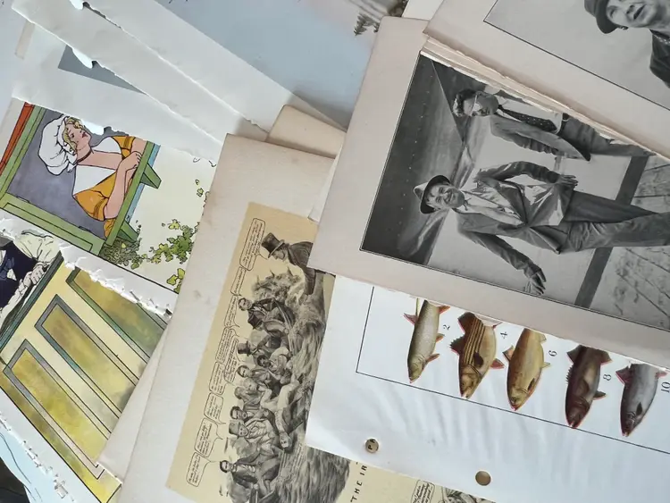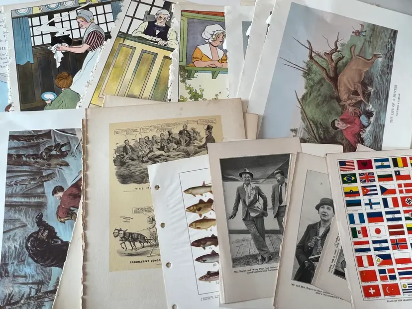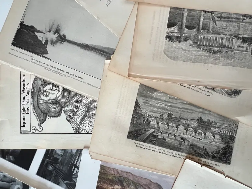 An eclectic & fun selection of 100 gorgeous prints/ lithographs/ engravings/ book pages with graphics, Pages are printed/ published in the 1800s and 1900s and showcase a wide variety of subjects/ themes. These pages are largely removed from old books. There may be some prints from unbound collections.