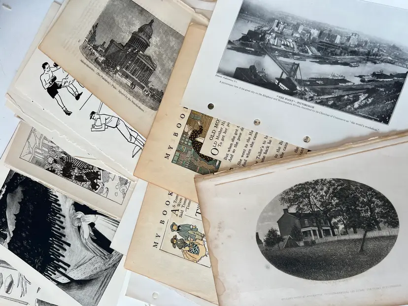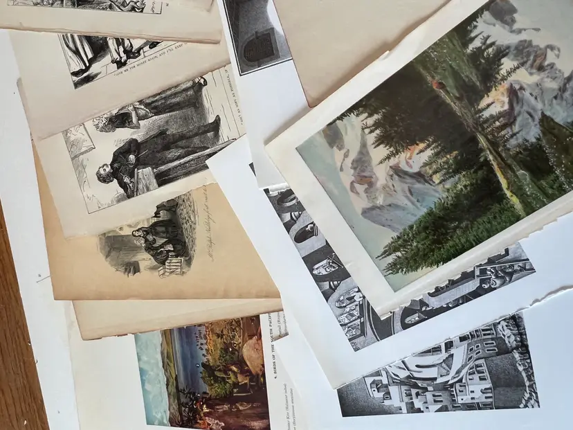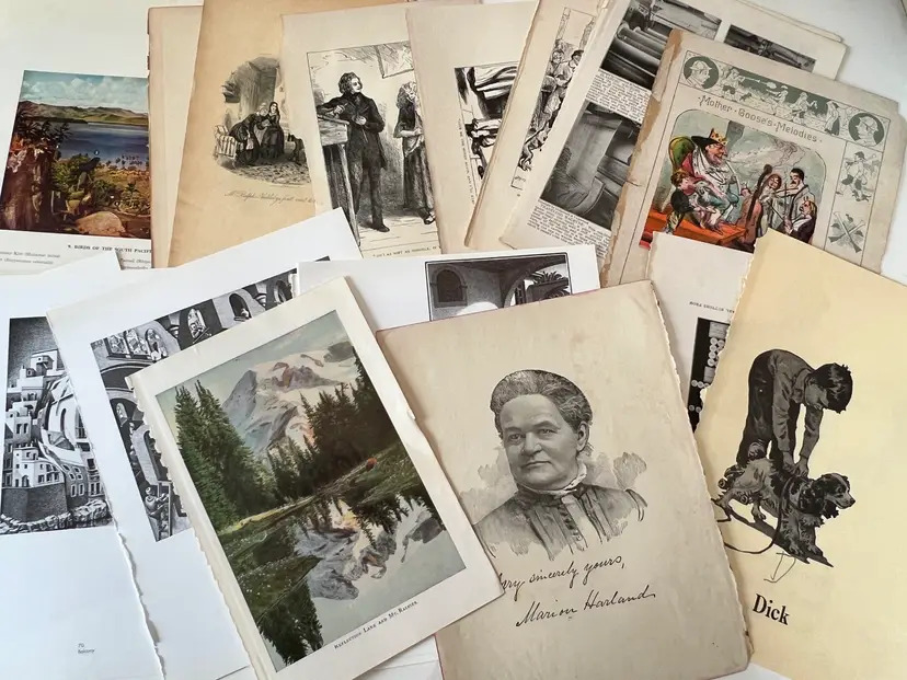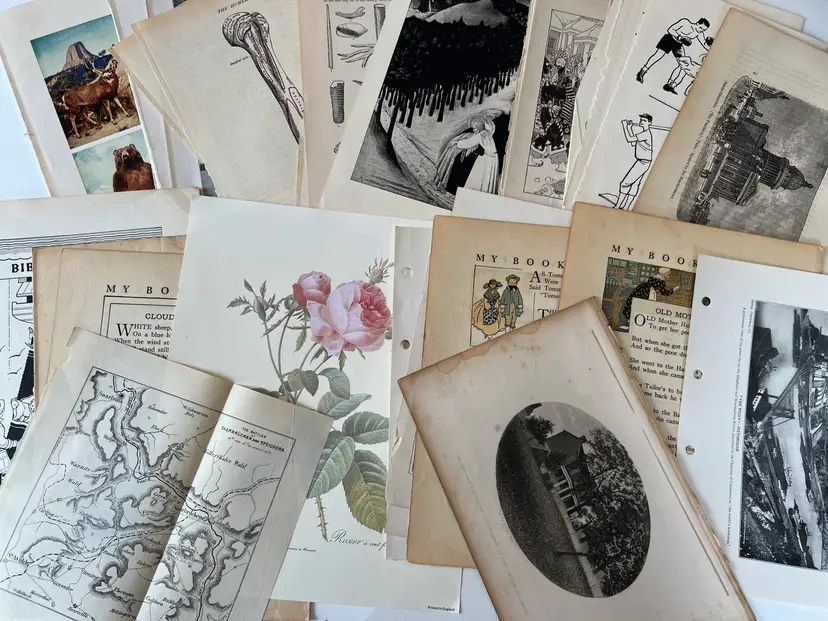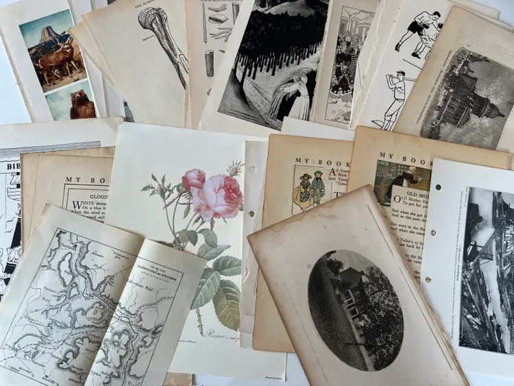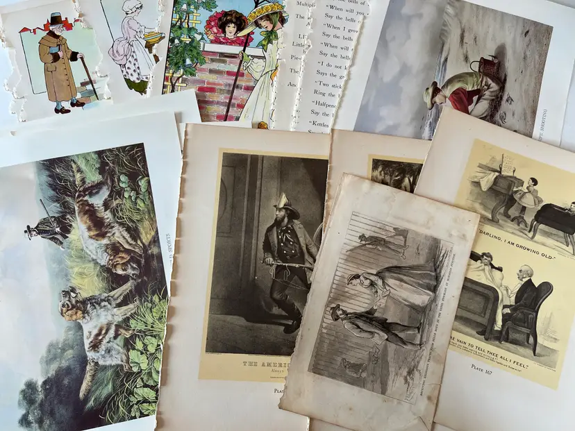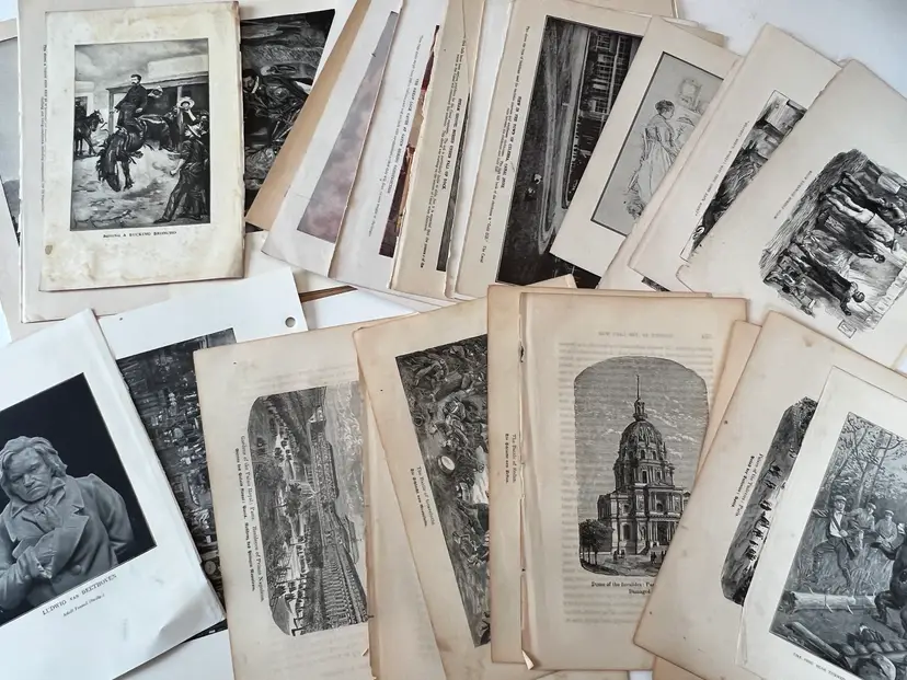 An eclectic & fun selection of 100 gorgeous prints/ lithographs/ engravings/ book pages with graphics, Pages are printed/ published in the 1800s and 1900s and showcase a wide variety of subjects/ themes. These pages are largely removed from old books. There may be some prints from unbound collections.