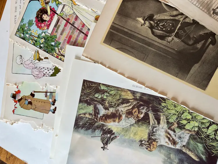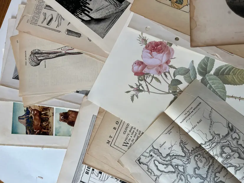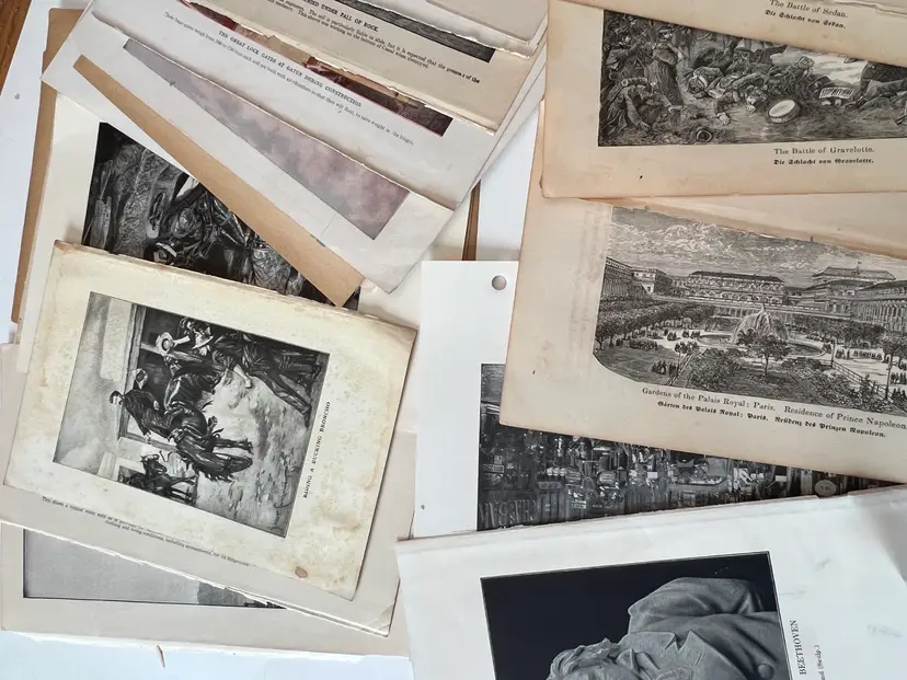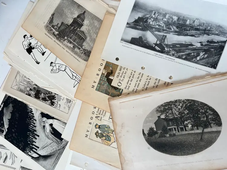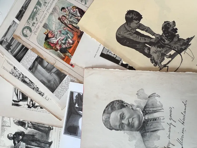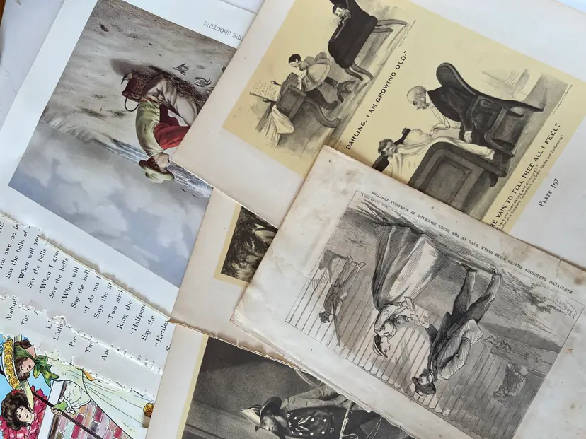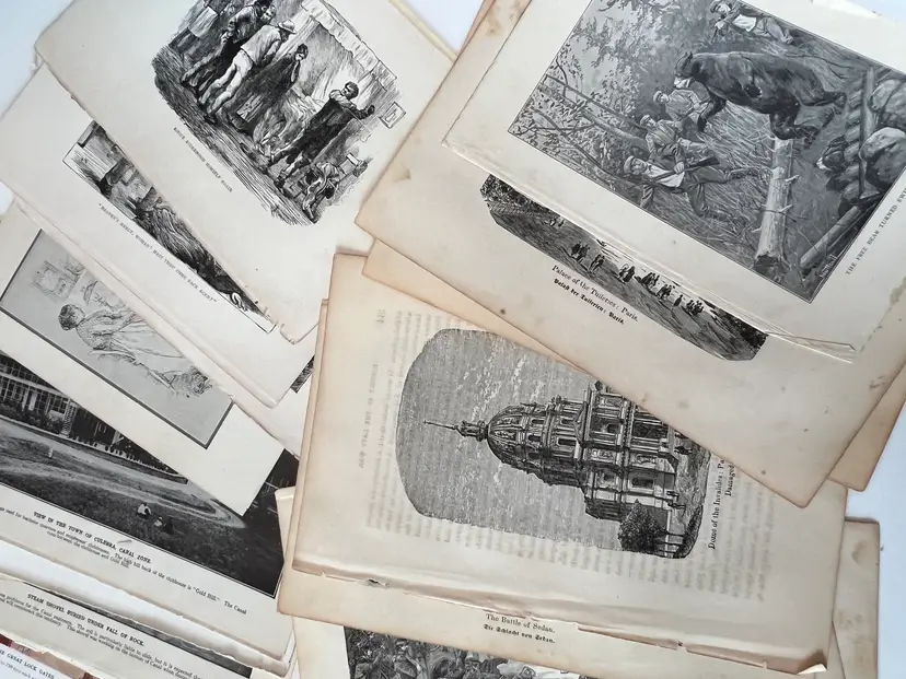 An eclectic & fun selection of 100 gorgeous prints/ lithographs/ engravings/ book pages with graphics, Pages are printed/ published in the 1800s and 1900s and showcase a wide variety of subjects/ themes. These pages are largely removed from old books. There may be some prints from unbound collections.