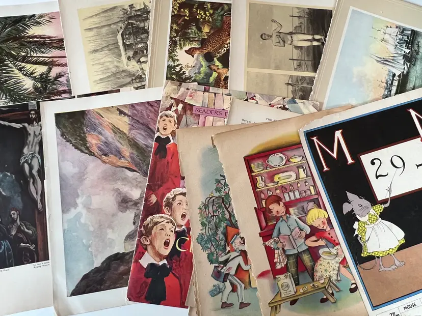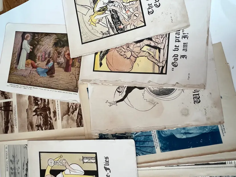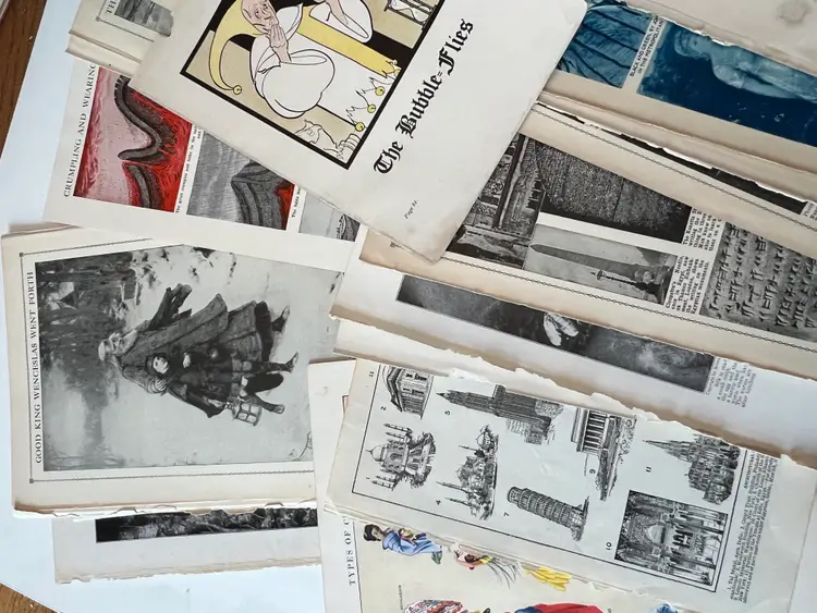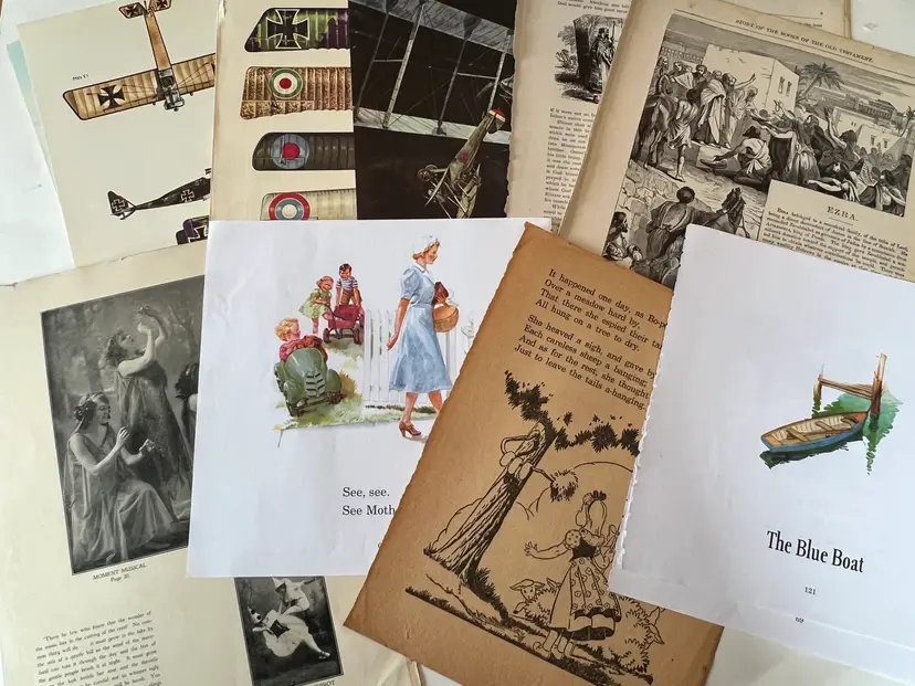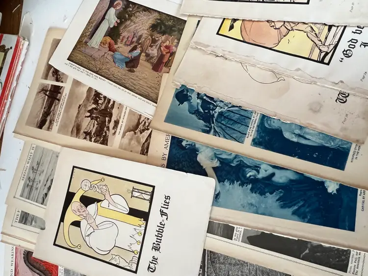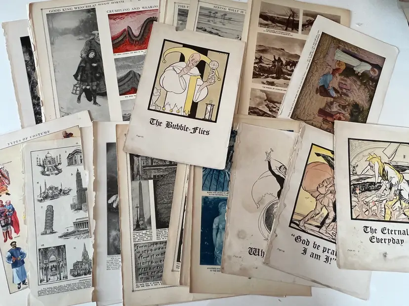 An eclectic & fun selection of 100 gorgeous prints/ lithographs/ engravings/ book pages with graphics, Pages are printed/ published in the 1800s and 1900s and showcase a wide variety of subjects/ themes. These pages are largely removed from old books. There may be some prints from unbound collections.