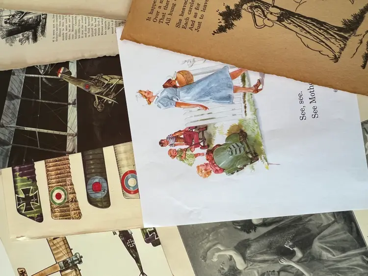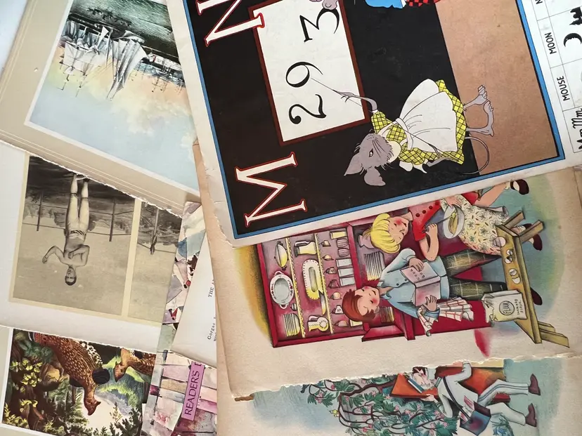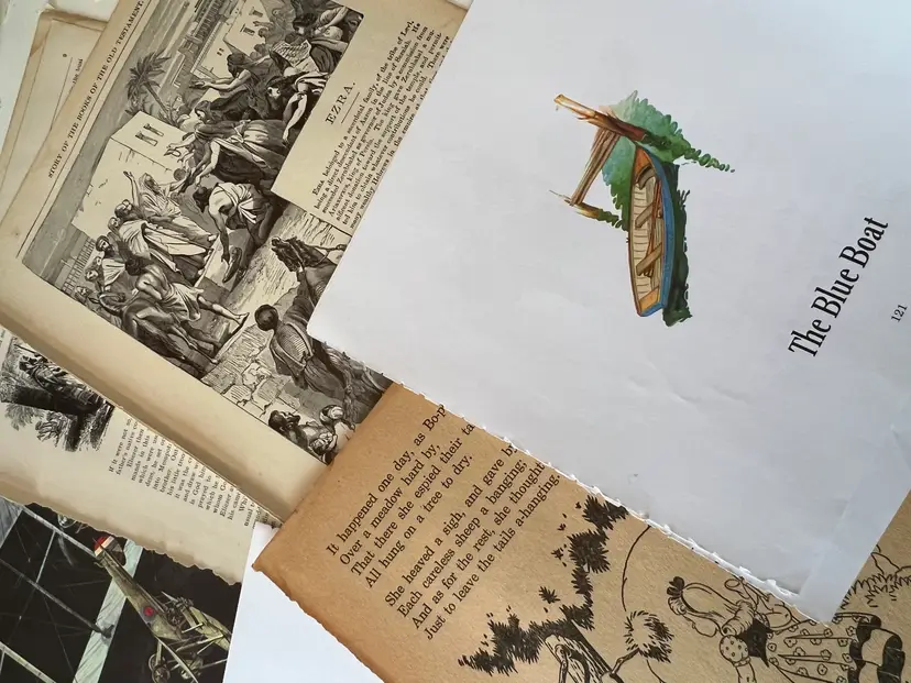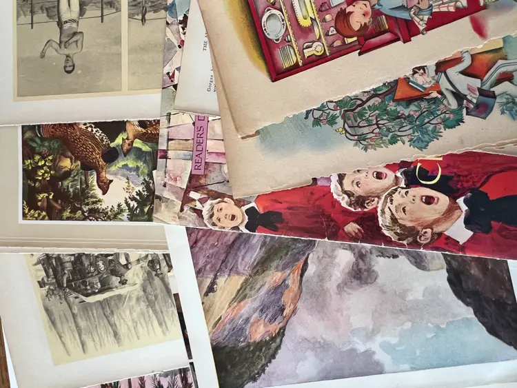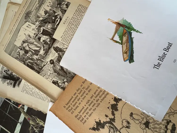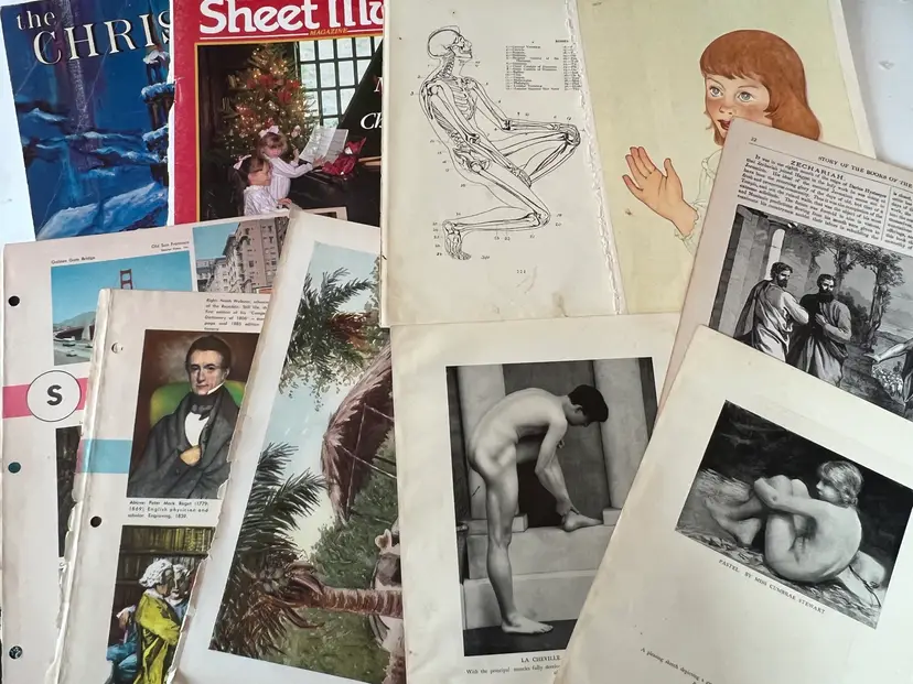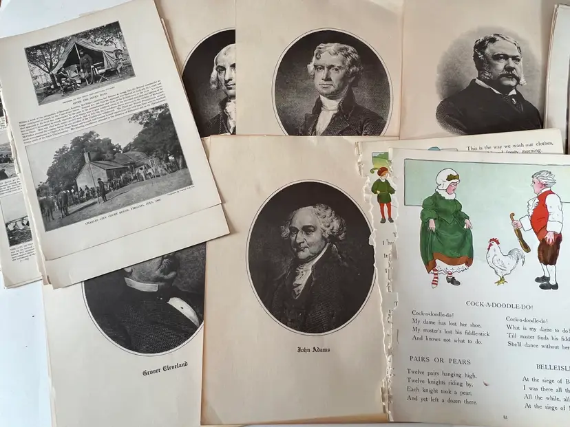An eclectic & fun selection of 100 gorgeous prints/ lithographs/ engravings/ book pages with graphics, Pages are printed/ published in the 1800s and 1900s and showcase a wide variety of subjects/ themes. These pages are largely removed from old books. There may be some prints from unbound collections.